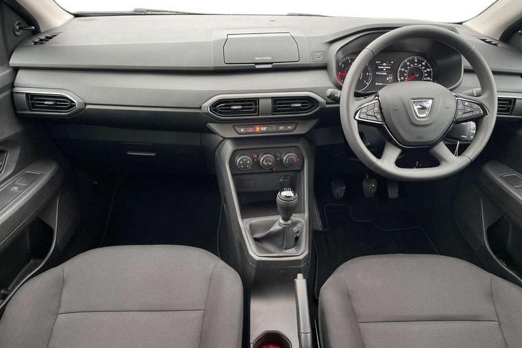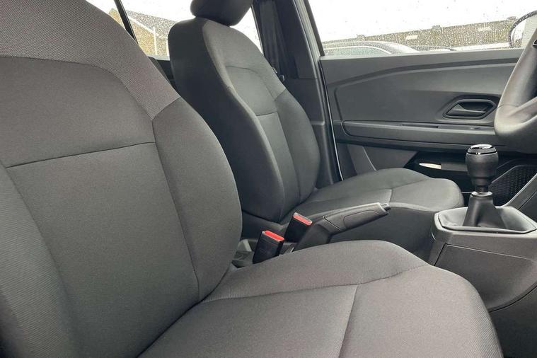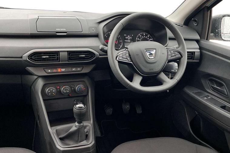 3.5" TFT instrument panel with on-board computer, Cruise control with speed limiter, eCall emergency call system, Eco mode, Electric power assisted steering, Rev counter, Stop/start system, Media Control - DAB Radio with display on instrument panel, Bluetooth, 2 Speakers, Pre-wiring for radio and speakers, USB connection for data transfer and charging, USB socket, 3 speed windscreen wipers, Auto lighting, Black door handles, Black door mirrors, Black radiator grille, Body coloured bumpers, Front electric windows, Heated rear window, High level third brake light, LED automatic daytime running lights, LED Y shape Dacia signature lighting, Manually adjustable door mirrors, Rain sensor, Rear manual windows, Rear side wing doors, Rear wash/wipe, Tinted windows, 1/3 to 2/3 split folding rear seats, 12 volt front socket, 3 height adjustable rear headrests, 3 seat rear bench, Black interior door handles, Fabric upholstery, Fixed smartphone holder on dashboard, Front armrest, Gear shift indicator, Height adjustable driver seat, Height adjustable front headrests, Height/depth adjustable steering wheel, Isofix points for child seats in both outer rear seats, Manual air conditioning, Satin chrome air vents, Single front passenger seat, Steering wheel controls, 3x3 point rear seatbelts, ABS and Emergency brake assist, Automatic emergency braking system, Child locks on rear doors, Door open warning, Driver airbag, ESC (Electronic Stability Control), ESP (Electronic Stability Program) + Hill Start Assist, Front curtain airbags, Front seatbelt pretensioners, Front side airbags, Height adjustable front seatbelts, Passenger airbag, Seatbelt reminder for driver and front passenger, Tyre pressure monitor, Automatic central locking, Immobiliser, Remote central locking, 15" Steel wheels with full wheel cap, Tyre inflation kit,
