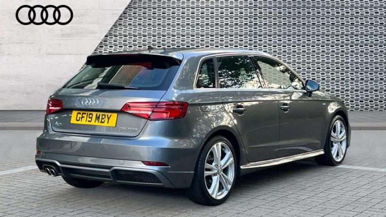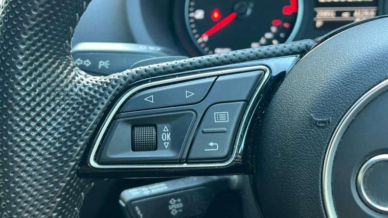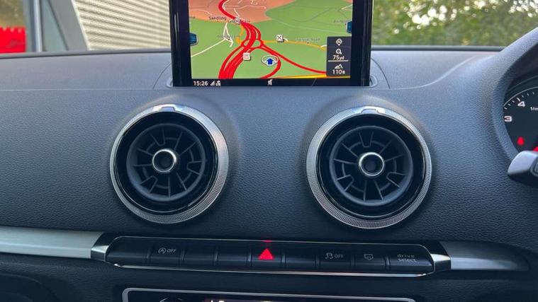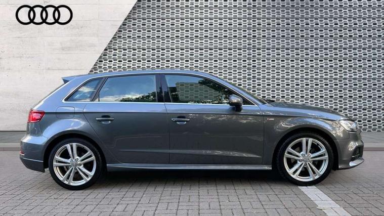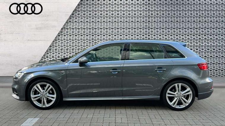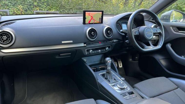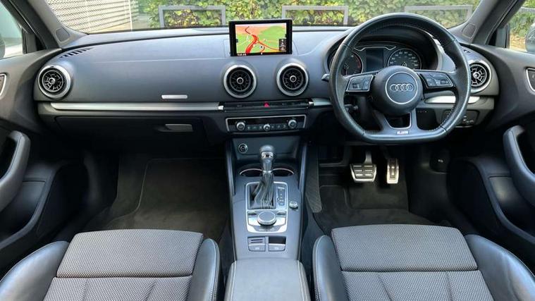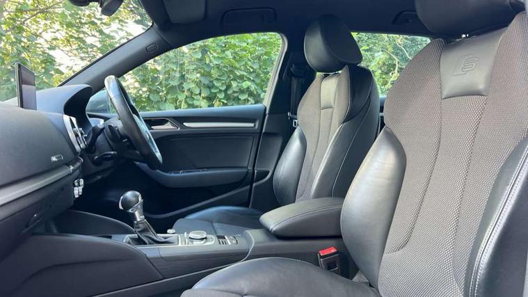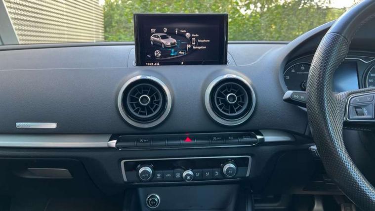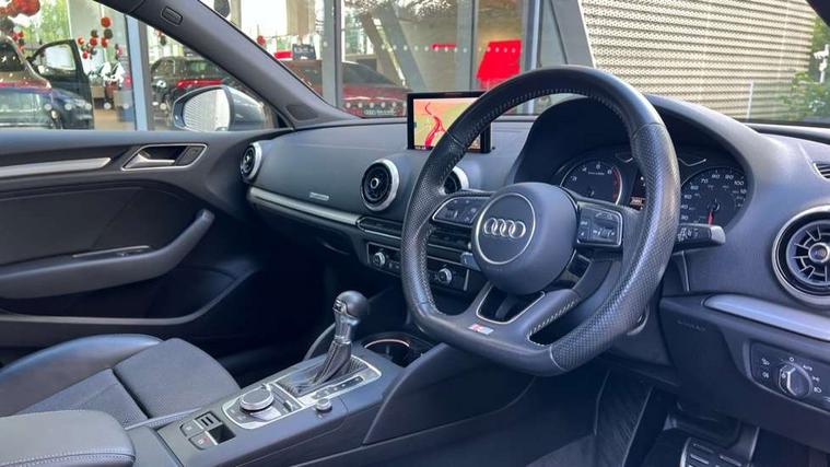 Audi connect, Audi drive select, Audi smartphone interface, Automatic start/stop system, Colour driver's information system display, Electro - mechanical power assisted steering, Mobile telephone preparation - bluetooth interface, SD card based satellite navigation system, Service interval indicator, Speed limit display, Voice control system, Voice recognition for navigation system, 2 USB interfaces and Aux-In jack, Audi music interface, CD player, DAB Digital radio, MMI radio plus with 7" colour MMI screen and MMI controller, Aluminium window trim, Auto dimming rear view mirror with light and rain sensors, Body colour door mirrors, Chrome exhaust tailpipes, Electric front windows, Electric rear windows, Electrically adjustable and heated door mirrors with integrated LED side indicators, Heated windscreen washer jets, LED daytime running lights, Matt black radiator grille, Rear wiper, S line badges on front wings, S Line body styling with front & rear bumpers and side skirts, radiator grille and rear diffuser insert, roof spoiler, Sport specific side air inlet grille and diffuser insert, 3 adjustable rear headrests, 4 lashing points to secure luggage, Adjustable front centre armrest, Black cloth headlining, Dual zone electronic climate control, Front and rear interior lights with delay, Front/rear floor mats, Glovebox light, Height and reach adjustable steering wheel, Illuminated door sill trims with S logo, Isofix child seat preparation for front passenger/outer rear seats inc passenger airbag deactivation, Stainless steel pedals, Storage compartments in doors side trims, centre console and under front drivers seat, LED interior light pack - A3/RS3, Non smoking pack - A3, Storage and luggage pack - A3/RS3, 3 point seatbelts on all seats, ABS/EBD, Active bonnet, Active front headrests, Airbags - front driver/passenger, front & rear side, curtain, drivers knee, ASR, EDL, Electromechanical parking brake, ESC - Electronic Stability Control + traction control, Front passenger airbag deactivation, Hill hold assist, Manual rear child locks, Multi-Collision braking, Seatbelt warning, Tyre pressure warning, Warning triangle and first aid kit, Anti theft alarm, Anti-theft wheel bolts, Remote control central locking, Thatcham category 1 alarm + immobiliser, Aluminium air vent surrounds, Aluminium trim elements, Matt brushed aluminium inlays, Tool kit, Tyre repair kit,