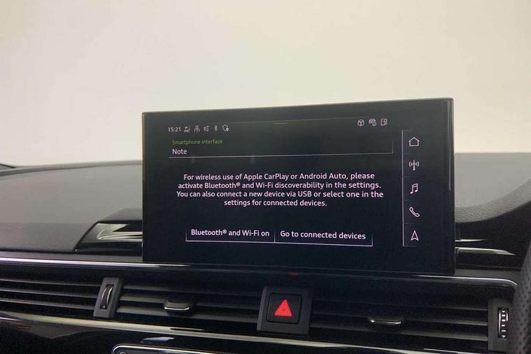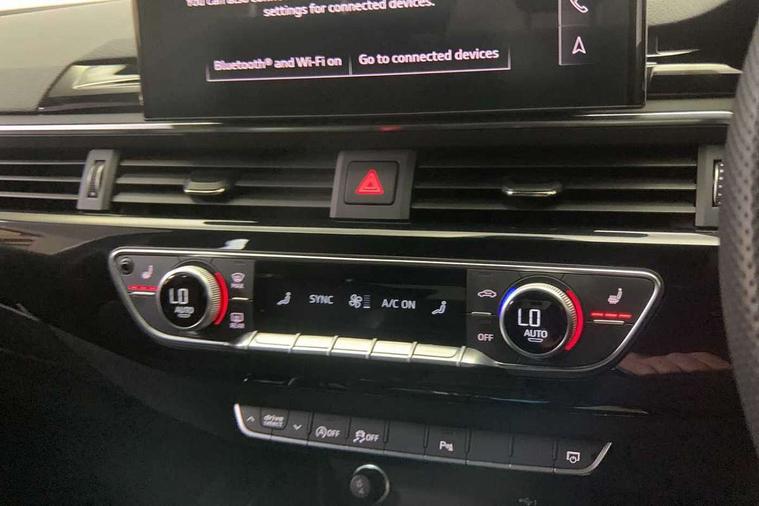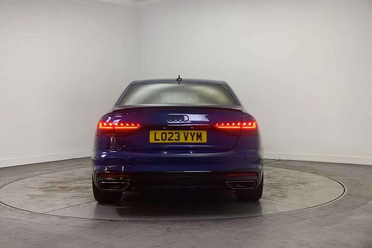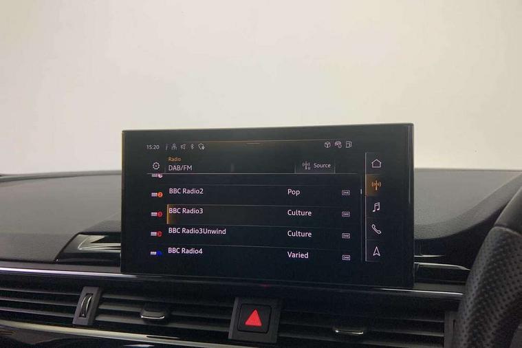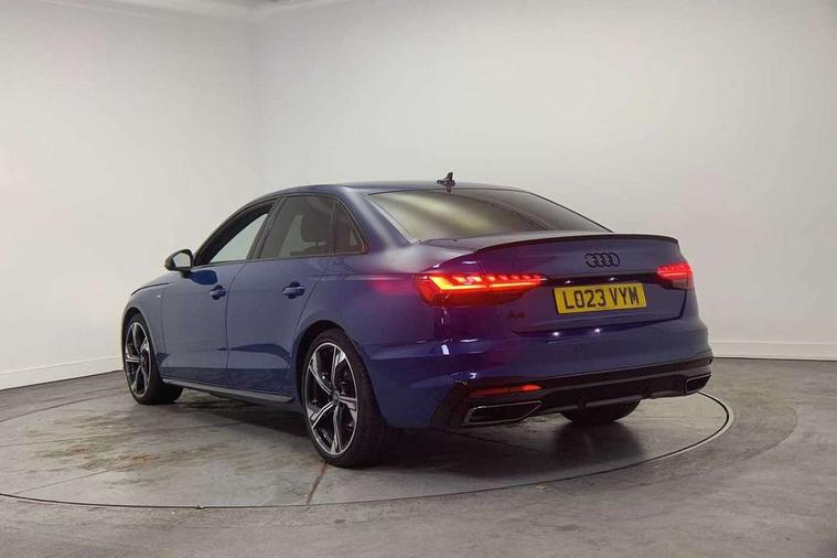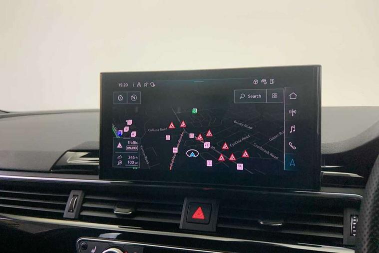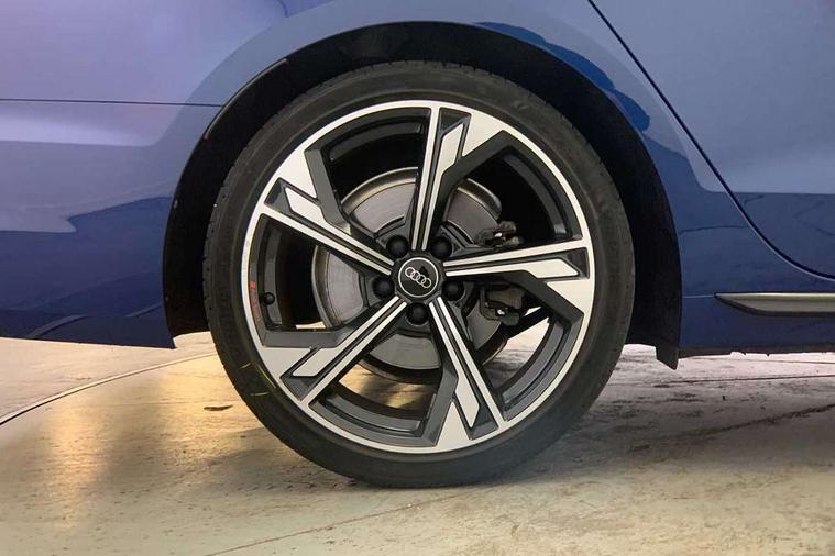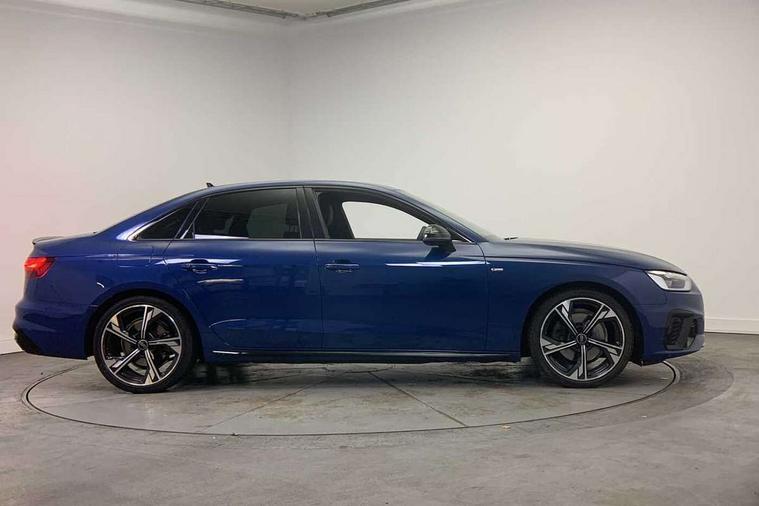 Audi connect safety and service (e-call), Audi drive select, Audi smartphone interface, Audi virtual cockpit, Automatic start-stop system with coasting functionality and efficiency programme, Bluetooth interface, Camera based traffic sign recognition, Electric boot lid release, Electromechanical power steering, Email, calendar and text messages displayed via MMI, Front and rear parking sensors, Lane departure warning, MMI Navigation plus with MMI touch includes 10.1" high resolution colour MMI display, 3D map, Rear view camera, Voice control system, 54 litre fuel tank, Sports suspension lowered by 23mm, 2 USB charging ports, 8 passive loudspeakers, DAB digital radio reception, Audi beam uses LEDs to project the audi logo onto the ground as you exit your A4, Auto dimming rear view mirror, Black Audi rings and black badging (model name in black badging, no engine badging), Body colour door handles, Body colour front spoiler lip, Body colour side sill trim, Electrically folding auto dimming/adjustable/heated door mirrors with LED side indicators and kerb view function for passenger side, Exhaust tailpipes in high dark chrome, Grained matt black side air inlets with matt aluminium silver inlay, High beam assistant, High gloss black B pillar trims and triangular rear door trim, LED headlights with LED rear lights + dynamic rear indicators + headlight adjustment and high beam, turning light + LED daytime running lights, LED third brake light, Privacy glass, Rain and light sensors, Rear boot, Rear diffuser in matt black with trim strip in matt aluminium silver, Rear side wing doors, Sport front and rear bumpers with side skirts, Variable intermittent front wash/wipe, Windscreen with acoustic glazing, 4 way electric lumbar support for driver and front passenger, 40/20/40 split folding 3 rear seat bench in 3 parts with rear centre armrest, Black cloth headlining, Black perforated leather gearknob, Contrast stitching on seats, steering wheel and gear lever gaiter, Deluxe 3 zone electronic climate control, Door sill trims with aluminium inlay, Front and rear head restraints, Front centre armrest, Heated front seats, Illuminated door sill trims with S logo, ISOFIX child seat mounting and top tether, Manual seat adjustment, Single front passenger seat, Stainless steel pedals and foot rest, Black styling pack - A4 Saloon, LED Interior light pack - A4/S4, 3 rear seatbelts, 6 airbags - Driver, front passenger, curtain and side windows, Attention and drowsiness assist, Electronic Stabilisation Control (ESC) including ABS, ASR and EDL, Hill hold assist, Multi collision brake assist, Pop-up bonnet for pedestrian protection, Pre sense city, Rear door child safety locks, Seatbelt monitoring, Warning triangle and first aid kit, Anti theft alarm, Anti theft wheel bolts, Central locking, Keyless Go, Piano black finish inlay, Tool kit, Tyre repair kit,
