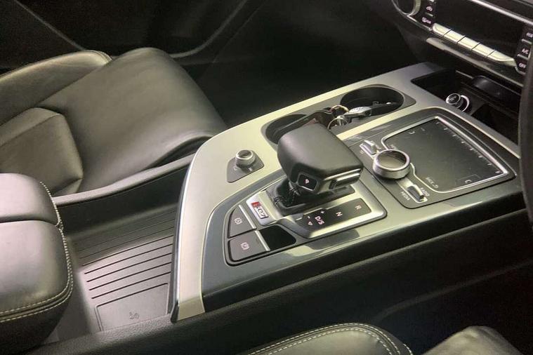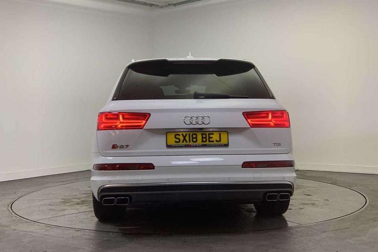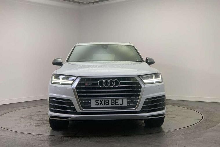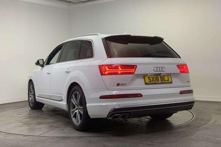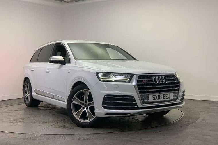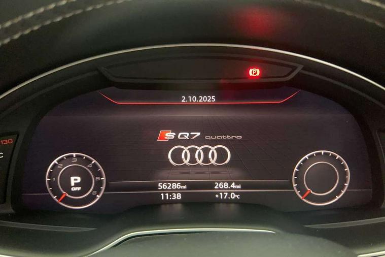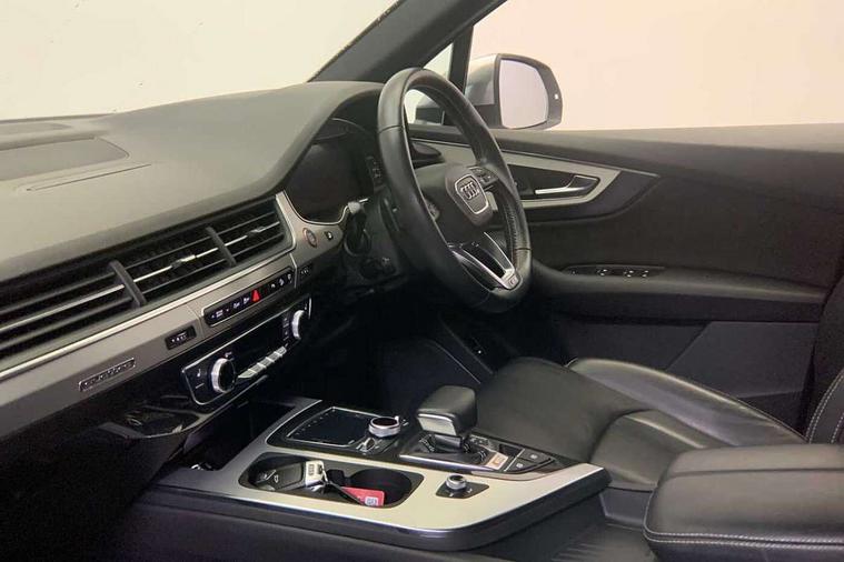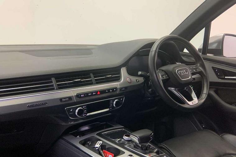 Audi drive select, Audi smartphone interface, MMI - Multi Media Interface control system, MMI navigation plus with touch and 8" colour display, DVD, SD card reader, 10GB music storage, Mobile phone preparation with bluetooth interface, Remote electric boot opening/closing, Service interval indicator, Servotronic speed related PAS, Speed limiter, Voice control system, 85 litre fuel tank, Adaptive air suspension, 2 USB ports, Audi music interface, Aux-in socket, DAB digital radio module, MMI radio plus, Acoustic windscreen, Active exhaust sound system, Aluminium effect front grille, Audi Beam uses LEDs to project the Audi Sport logo, Auto dimming rear view mirror, Body coloured bumpers, Dual branch oval twin exhaust tailpipes, Dynamic rear indicators, Electric front+rear windows, Headlight washers, High beam assist, LED daytime running lights, LED tail lights, Loading sill protector in stainless steel, Platinum grey front lip spoiler, Rain and light sensors, Rear wiper, Roof spoiler, S body styling, 2 cupholders in front centre console, 35/30/35 split fold 2nd row seats, 4 way electrically adjustable lumbar support for drivers seat, 4 way electrically adjustable lumbar support for front passenger seat, Aluminium scuff plates, Door sill trims with S line logo, Electric 3rd row 50/50 split/fold, Electric adjustable front seats, Four zone electronic climate control, Front ashtray and cigar lighter, Front centre comfort armrest with storage + cupholders, Front head restraints, Front/rear floor mats, Gearshift paddles, Heated front seats, ISOFIX on front passenger and rear outer seats, Leather gear knob, Rear centre armrest with 2 cupholders, Rear headrests, Stainless steel pedals, Sunvisors with illuminated vanity mirrors, Top tether anchor plate for isofix child seat, Interior light pack - Q7, 3 point seatbelts on all seats, ABS+Electronic Brake force Distribution, Curtain airbags, Driver and passenger airbags, EDL + ASR, Electrically operated child locks on rear doors, Electromechanical parking brake, ESP, Front passenger airbag deactivation, Front side airbags, Hill descent control, Hill hold assist, Seatbelt warning, Traction control, Tyre pressure monitoring system, Warning triangle and first aid kit, Alarm with interior monitoring, Immobiliser, Keyless Go access/ignition system, Locking wheel bolts, Remote central locking, Chrome door inserts, Tool kit, Tyre repair kit,