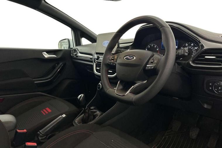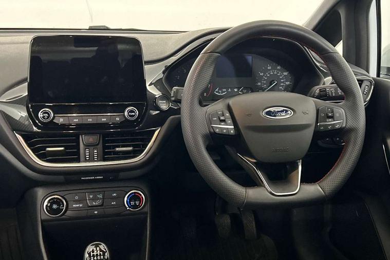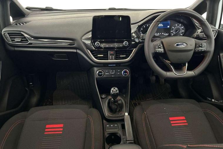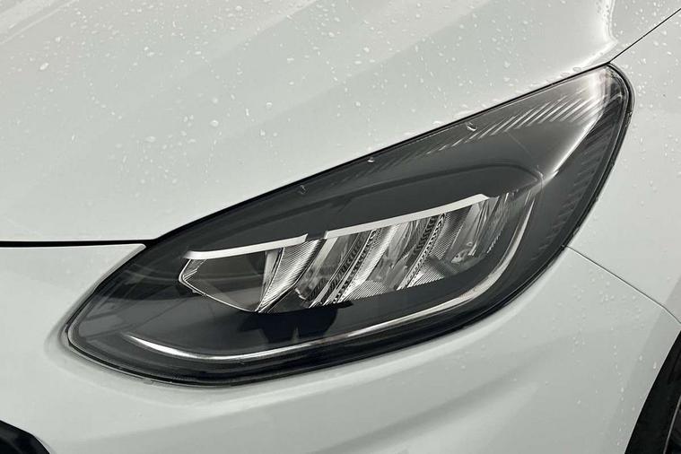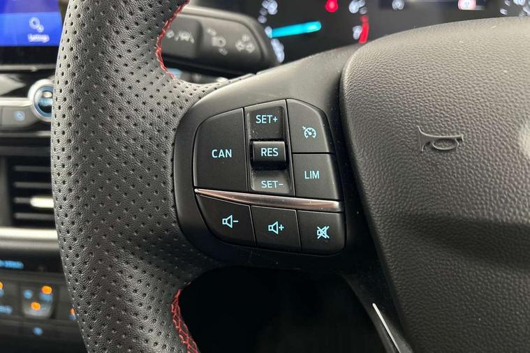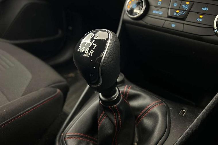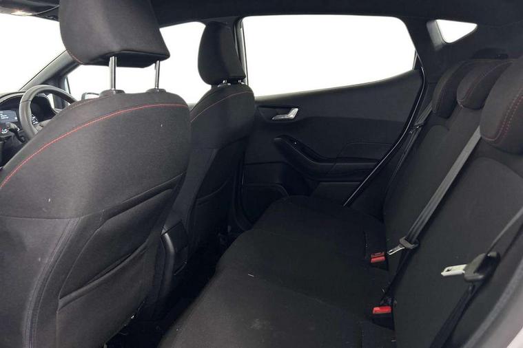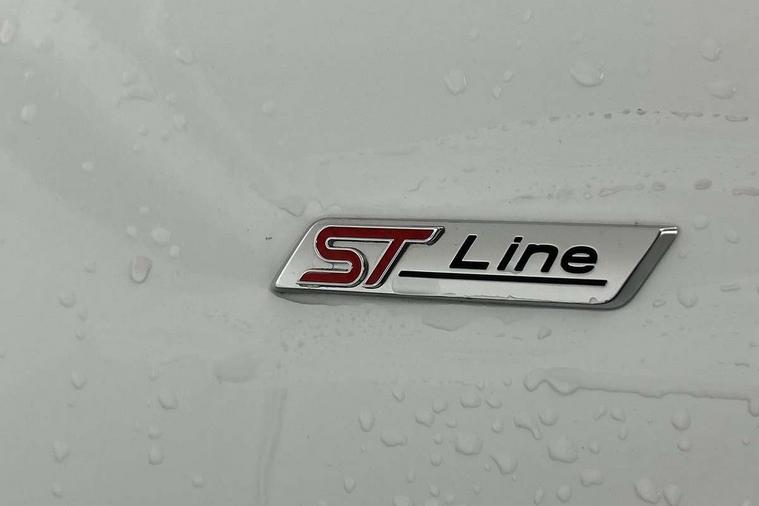 4.2" Colour TFT Ice blue illumination analogue cluster, Driver alert system, Electric power steering, Ford easy fuel, Lane keep assist, Lane keeping aid, Rear parking distance sensors, Selectable drive modes (Normal, Sport, Track), Trip computer, Sports suspension, 3rd brake light, Auto high beam, Automatic headlights, Body colour bumpers, Body colour large rear spoiler, Body coloured electrically operated with side indicators, Electric front windows/one touch facility, Electric rear windows, Quickclear heated windscreen, Rain sensing wipers and auto dimming rear view mirror, Rear privacy glass, Rear side wing doors, Rear wiper, Unique ST-Line grille, full bodystyling kit and large body coloured rear spoiler, 3 rear headrests, 3 seat bench in 2nd row, Adjustable head restraints, Black headlining, Centre console with opening armrest, 2x cupholders, 12v and USB, Cloth upholstery with red stitching, Leather gear knob, Manual 2 way passenger seat adjust, Manual 4-way driver seat adjust, Manual air conditioning, Premium floor mats, Sensico wrapped steering wheel, Single front passenger seat, 3 point seatbelts on all rear seats, Electronic stability control with hill start assist, Front and rear seat belt warning, Manual child lock in rear doors, Tyre pressure monitoring system, Keyless start with 'Ford Power' starter button, MyKey system, Remote central locking, Thatcham alarm with power door dead locks, 17" 5x2 spoke alloy wheels with rock metallic finish,