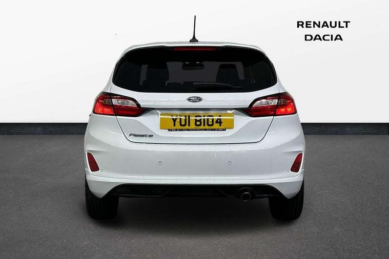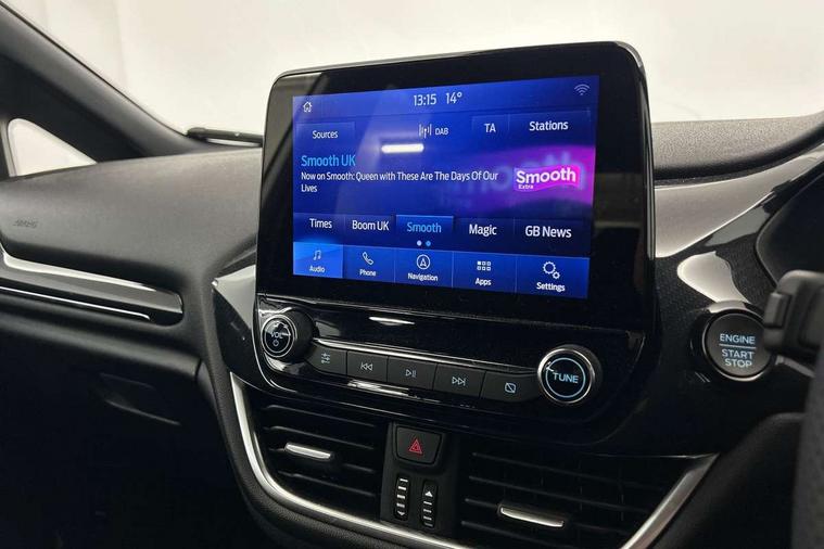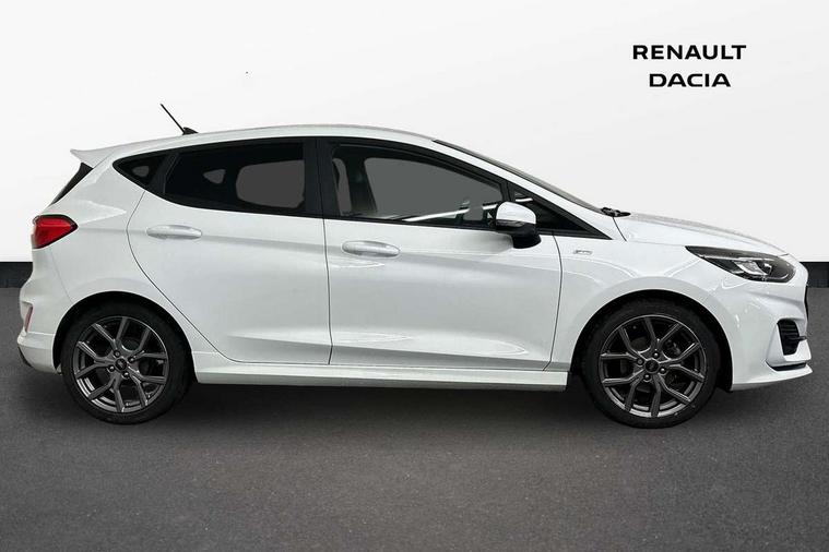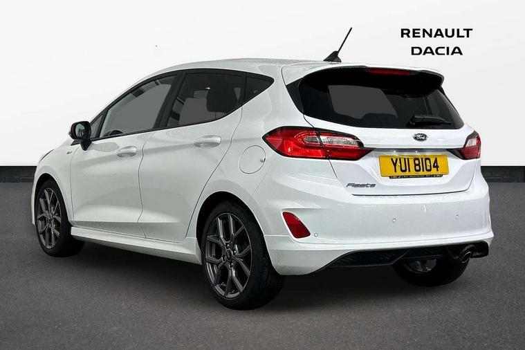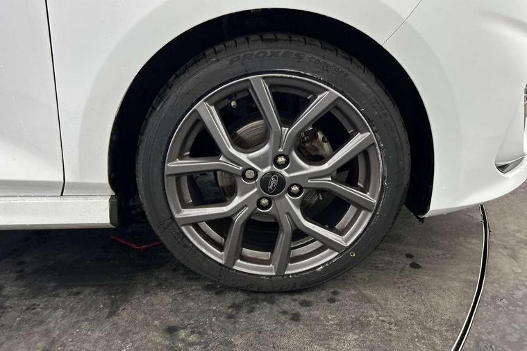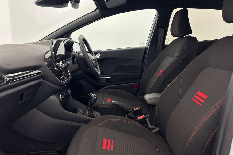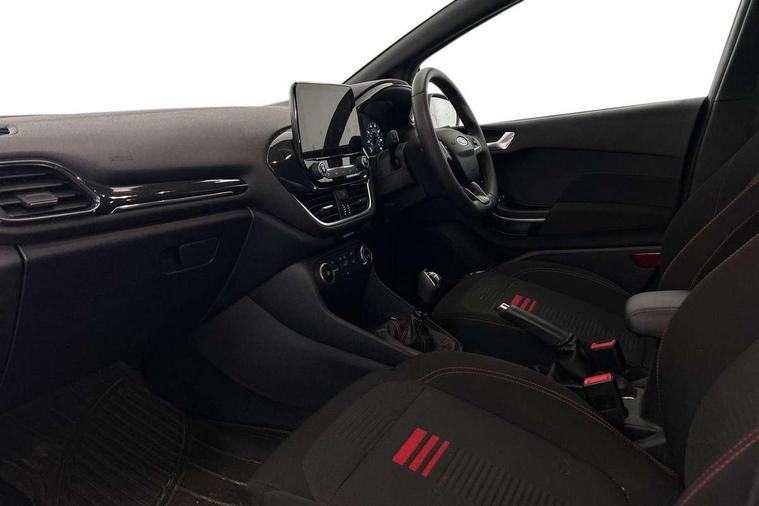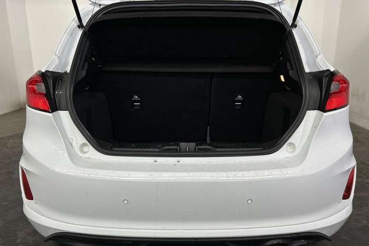 4.2" Colour TFT Ice blue illumination analogue cluster, Driver alert system, Electric power steering, Ford easy fuel, Lane keep assist, Lane keeping aid, Rear parking distance sensors, Selectable drive modes (Normal, Sport, Track), Trip computer, Sports suspension, 3rd brake light, Auto high beam, Automatic headlights, Body colour bumpers, Body colour large rear spoiler, Body coloured electrically operated with side indicators, Electric front windows/one touch facility, Electric rear windows, Quickclear heated windscreen, Rain sensing wipers and auto dimming rear view mirror, Rear privacy glass, Rear side wing doors, Rear wiper, Unique ST-Line grille, full bodystyling kit and large body coloured rear spoiler, 3 rear headrests, 3 seat bench in 2nd row, Adjustable head restraints, Black headlining, Centre console with opening armrest, 2x cupholders, 12v and USB, Cloth upholstery with red stitching, Leather gear knob, Manual 2 way passenger seat adjust, Manual 4-way driver seat adjust, Manual air conditioning, Premium floor mats, Sensico wrapped steering wheel, Single front passenger seat, 3 point seatbelts on all rear seats, Electronic stability control with hill start assist, Front and rear seat belt warning, Manual child lock in rear doors, Tyre pressure monitoring system, Keyless start with 'Ford Power' starter button, MyKey system, Remote central locking, Thatcham alarm with power door dead locks, 17" 5x2 spoke alloy wheels with rock metallic finish,