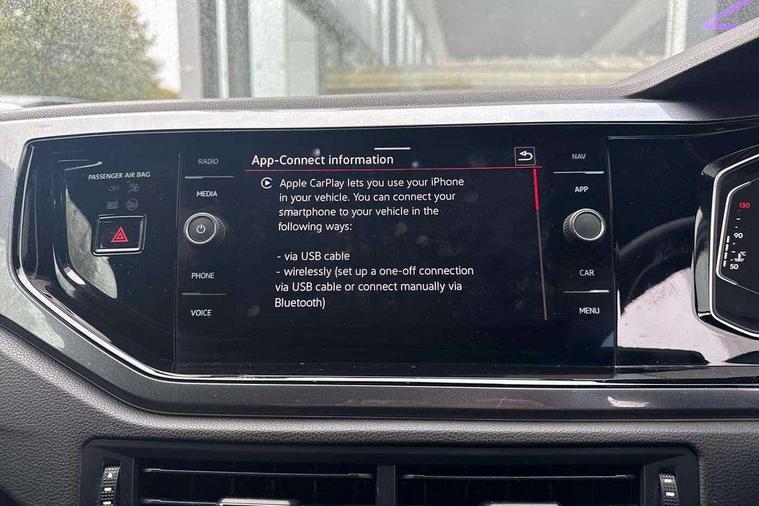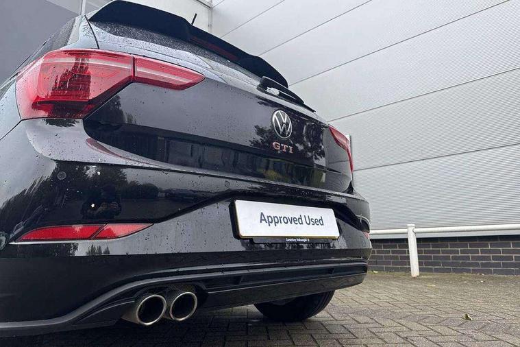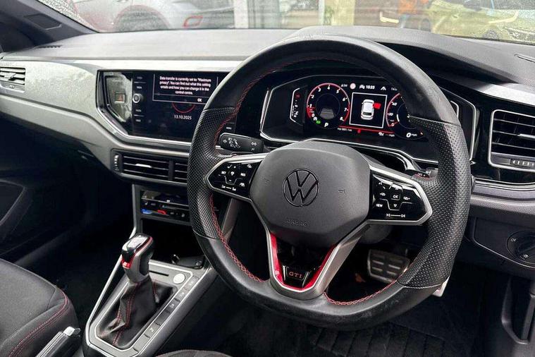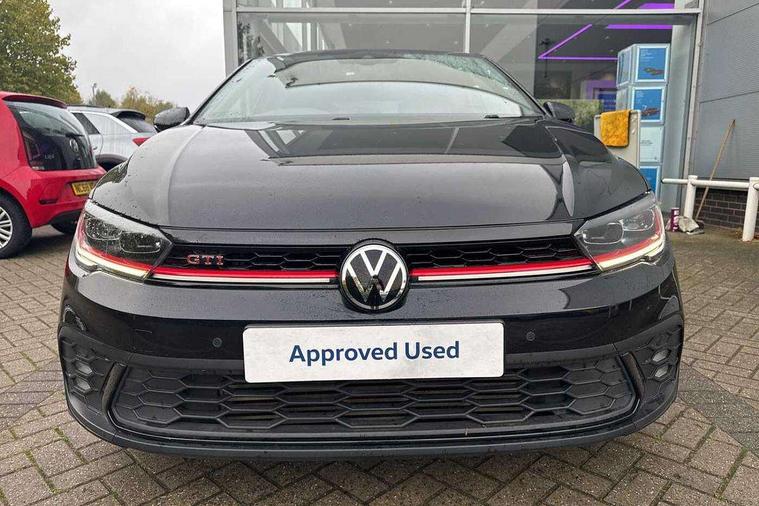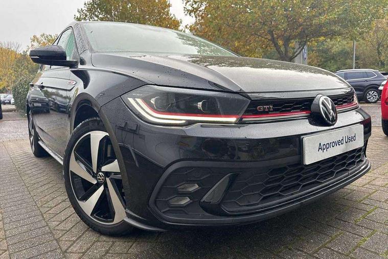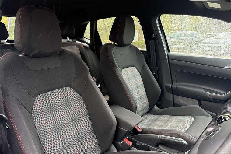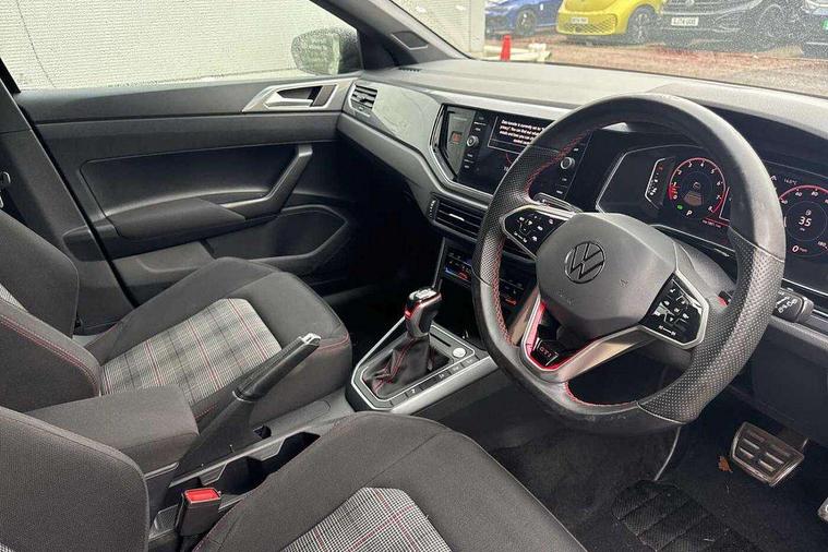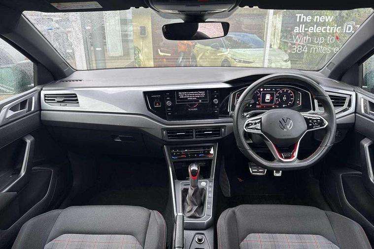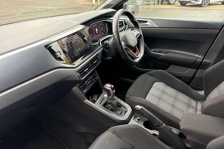 Adaptive cruise control with follow-to-stop and speed limiter, Bluetooth mobile phone interface, Digital Cockpit Pro with 10.25" Display, Driver alert system, Dynamic road sign display, Eco mode, Emergency call service, Power assisted speed sensitive steering, Preparation for We connect and We connect plus, Speedo and rev counter, electronic odometer, trip, service interval display and fuel gauge, Travel Assist - Lane keeping system and traffic jam assist, Travel assist including emergency assist, Trip computer, Warning signal and warning light for front and rear seatbelts not fastened, Washer fluid level indicator, Wireless app connect, Adaptive chassis control, Front wheel drive, Heavy duty rear axle, Rear shock absorpion sports version, Sports select suspension lowered by 15mm, Start-stop system with battery regeneration (recuperation - energy recovery during braking), DAB Digital radio, Diversity antenna for FM reception, Front and rear 6 speakers, Body colour bumpers, Body colour door handles, Electric front windows, Front scuff plates in aluminium with GTI logo, Heat insulating darkened glass in side and rear windows, Heat insulating glass windscreen, Power folding adjustable/heated exterior mirrors and front passenger exterior mirror lowering function, Rear electric windows, Rear fog light, Rear side wing doors, Rear windscreen washer and wiper with interval delay, Sport bumpers with air intakes with honeycomb structure, Third brake light, Twin chrome exhaust tailpipes, 12V power socket in centre console, 2 USB-C ports in the front, 2 USB-C charging sockets on the center console in the rear, 3 rear head restraints, 60/40 split folding rear seat and rear seat bench not split, Air care climatronic air conditoning system with active combination filter and 2-zone temperature control, Black roof lining, Ceramique headliner, Chrome plated radiator grille inserts, air vent surrounds and light switch surrounds, Door and side trim panel, Driver and front passenger seat height adjustment, Driver/passenger sunvisors with illuminated vanity mirrors, Front + rear carpet mats, Front centre armrest, Front footwell illumination, Front seat backrest storage pockets, GTI sports gearshift knob in aluminium leather, Handbrake lever handle in leather, Isofix child seat preparation easy-fit (for two outer rear seats, and front passenger seat) compatible with I-size, LED interior light with switch off delay and dimmer, 2 reading lights front and rear, Luggage compartment cover, Luggage compartment floor, Luggage compartment lighting, Single front passenger seat, Stainless steel pedals, Standard pedal cluster, Three spoke leather wrapped multifunction sports steering wheel with shifting paddles, IQ LED matrix headlights pack - Polo, Light and sight pack - Polo GTI, Sports suspension pack - Polo, 3 point height adj front seatbelts + pretensioners, 3x3 point rear seatbelts, ABS, Driver and front passenger airbag with front passenger airbag deactivation, Drivers and front passengers safety optimised head restraints, ESC (Electronic stability control) + EDL (Electronic Differntial lock) and ASR (Traction control), Extended and predictive pedestrian/ cyclist protection, Front and rear disc brakes with red brake calipers, Front curtain and side airbags with center airbag, Hill hold control, Manual child lock in rear doors, Two tone horn, Tyre pressure loss indicator, Alarm with interior protection, Anti-theft alarm system with interior monitoring, backup horn, and towing protection, Anti-theft wheel bolts, Electronic engine immobiliser, Chrome applications on rotary light, mirror adjustment, window regulator switches, outlet with frame in black, Low rolling resistance tyres,