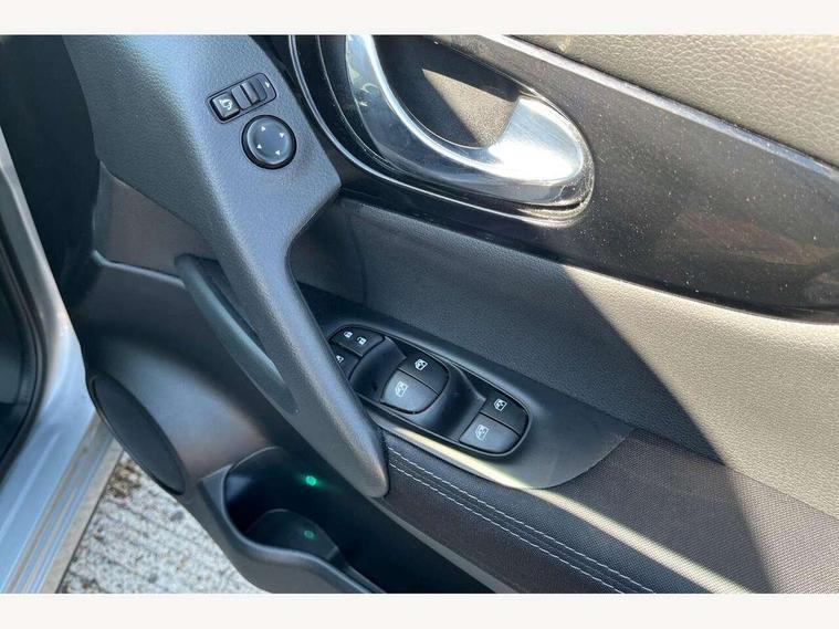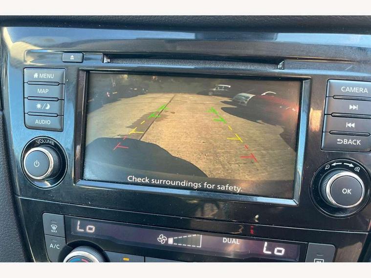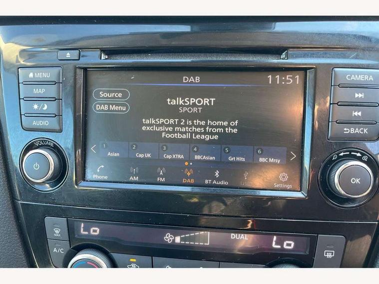 Advanced drive assist display 5'' TFT coloured screen, Apple car play/Android Auto, Bluetooth connectivity, Cruise control + speed limiter, Electric speed sensitive power steering, Front parking sensors, Idle stop/start system, Lane departure warning system, Nissan connect evo 7" touchscreen navigation and entertainment system, Normal or sport selectable steering, Outside temperature sensor, Premium Tomtom connected services, Rear parking sensors, Rear view camera, Service interval indicator, Smartphone integration, Traffic sign recognition, Trip computer, Voice control system, Nissan chassis control (intelligent ride control, intelligent trace control, intelligent engine brake), 6 speakers, AM/FM radio, CD audio system, Aux-in socket, DAB Digital radio, USB port, Anti dazzle rear view mirror, Auto wipers, Body colour bumpers, Body coloured door handles, Body coloured door mirrors, Chrome window surround, Daytime running lights dip function when turn signal applied, Electric folding door mirrors, Electric front and rear windows with one touch illuminated window controls, Electrically adjustable door mirrors, Front fog lights, Halogen headlights, Heated door mirrors, High beam assist, Intelligent auto headlights, LED indicators in door mirrors, Rear roof spoiler, Rear wiper with reverse link, Shark fin antenna, Signature LED daytime running lights, Underbody vortex generators, 2 X front 12v power sockets, 3 height adjustable rear headrests, 60/40 split folding rear seat, Ambient interior lighting, Ambient lighting around centre console, Bi-colour cloth upholstery, Boot lighting, Centre console storage box/armrest, Chrome interior door handles, Driver's seat manual height adjust, Dual zone climate control, Front and rear door pockets with bottle holders, Front and rear seat belt pre-tensioners with load limiters, Height adjustable front headrests, ISOFIX restraints on outer rear seats x2, Leather D shaped steering wheel, Leather gear lever, Leather knee pad, Manual height adjustable passenger seat, Manual lumbar support on driver seat, Pollen filter, Rear armrest with 2 cupholders, Tilt/telescopic adjustable steering wheel, Velour floor mats, 6 airbags - Driver, front passenger, curtain and side airbags, ABS, ESP, EBD and brake assist, Auto hold function, Child locks on rear doors, Electronic parking brake, Front and rear seat belt warning, Height adjustable front seatbelts, Hill start assist, Intelligent emergency braking with pedestrian recognition, Passenger airbag deactivation system, Three 3 point rear seatbelts, Tyre pressure monitoring system, Anti-theft immobiliser, Remote central locking, Thatcham Cat.1 alarm, Piano black dash trim, 17" alloy wheels, Tyre puncture repair kit,