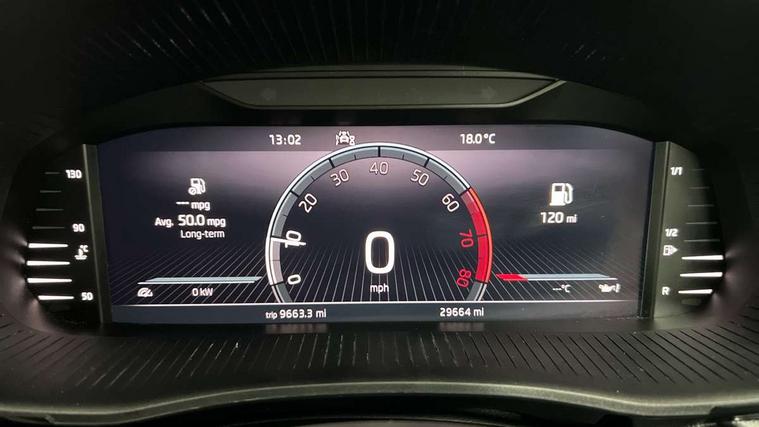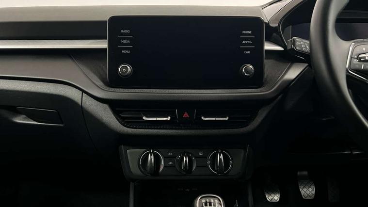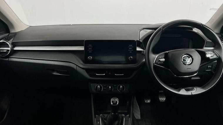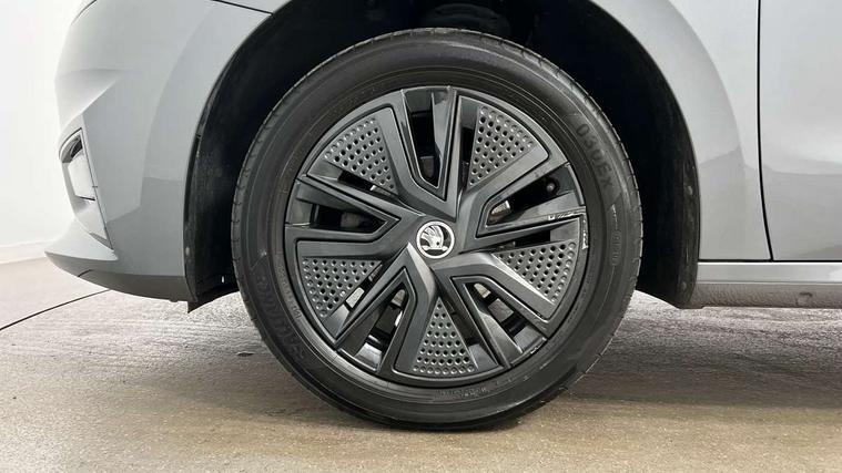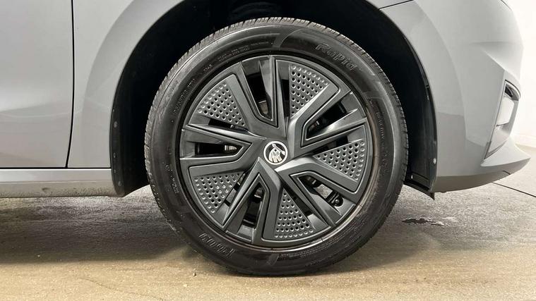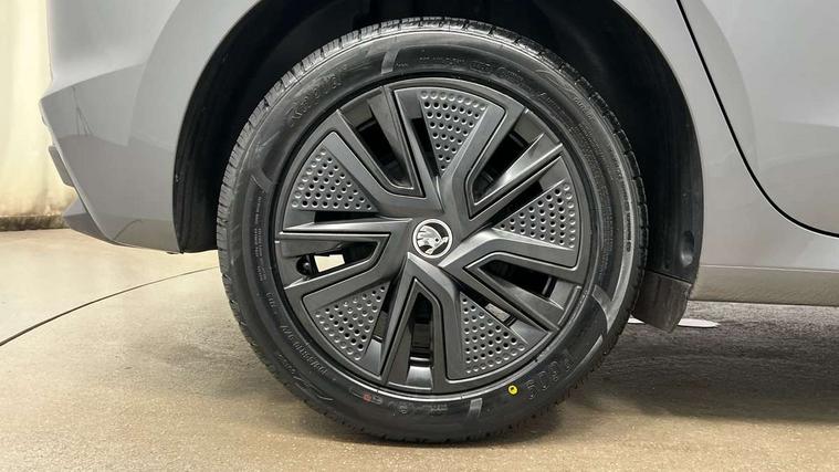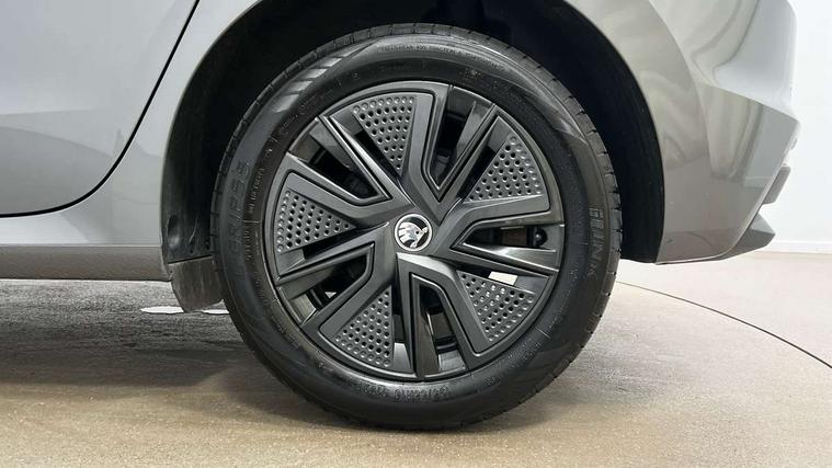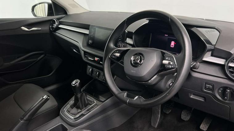 Bluetooth connection, Driver alert system - DAS, Electromechanical power steering, Exterior temperature gauge, Lane assist including road edge detection, Service interval indicator, Virtual cockpit with 10.25" colour display, 2x USB-C in the front (for data transmission and charging), 6 Speakers (4 in front and 2 in rear), Auxiliary socket for external MP3 player, Bolero radio with 8" colour display, DAB digital radio reception, Basic rear lights, Body coloured bumpers, Dimming rear view mirror with black frame, Door mirror integrated indicators, Electrically adjustable and heated door mirrors, Electrically adjustable front windows with function auto up/down, Front window wiper intermittent control, Headlight range control - Automatic, Ice scraper in fuel cap, LED daytime running lights with coming and leaving home feature, Mechanical adjustable rear windows, Privacy glass, Rear LED fog light, Rear side wing doors, Rear window wiper with washing nozzles, Roof mounted spoiler, SKODA tailgate lettering in chrome, Third brake light, 3 rear headrests, Backrest split and folding, Central console with fixed cup holder and storage box, Chrome handbrake release button, Fabric upholstery, Gearshift knob/handle in leather, Grain satin black interior door handles, Hand brake lever handle in leather, Height adjustable front headrests, Height adjustable steering wheel, ISOFIX and TopTether anchorage points to the outer rear seats, ISOFIX and TopTether on the front passenger seat, Luggage compartment lighting, Pollen filter, Rear seat bench unsplit, Single front passenger seat, Storm grey headlining, Sun visors with mirror and airbag label on passenger side, Ticket holder, Umbrella in drivers door, 3-point height adjustable front seats belts with pretensioner and force limiter, Automatic warning lights in case of crash, Driver and passengers airbag with switch off function, e-Call+, ESC including ABS, MSR, ASR, EDS, HBA and XDS, Front and rear seat belt warning, FRONT ASSIST (AEB City and AEB Inter Urban), Front side airbags, Head airbags, One tone horn, Pedestrian protection, Three rear 3-points safety seat belts with pretensioner and force limiter including stop function for outer rear seat belts, Tyre pressure monitoring system, Anti-theft alarm system including immobiliser, interior monitoring, backup horn, and towing protection, Anodized cross line upper decorative trim, Colour Edition air vents, Grain satin black central console cover, Grain satin black lower decorative trim, Satin black door and side trim panel in front, Anti-theft wheel bolts protection, Super-low rolling resistance tyres,