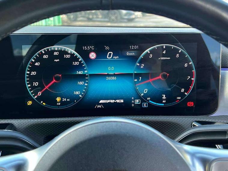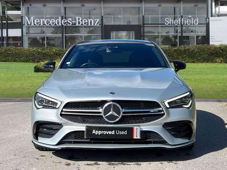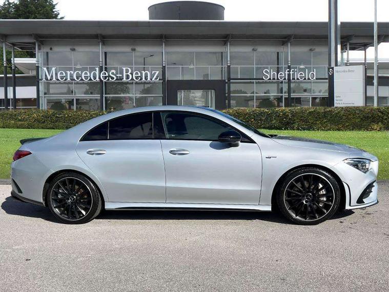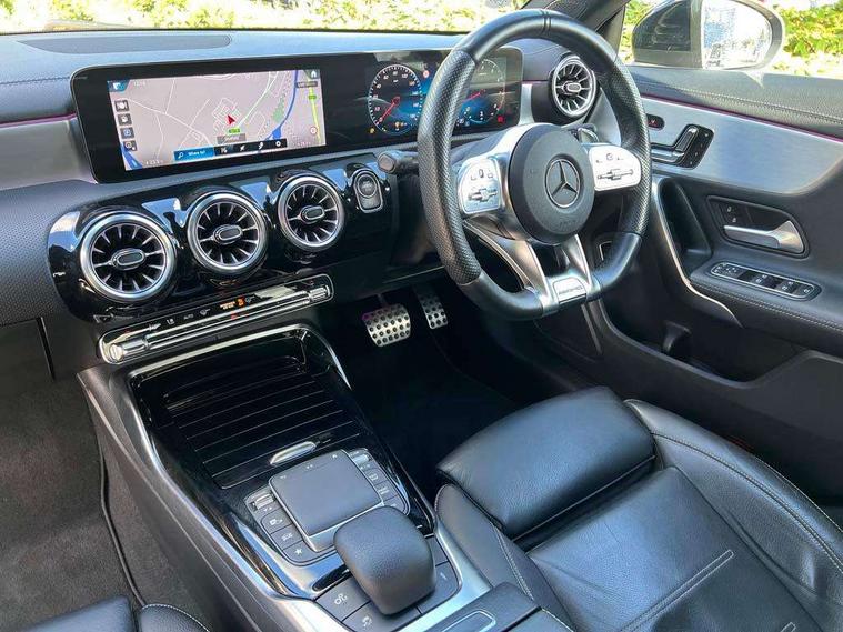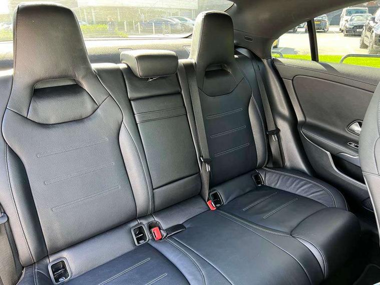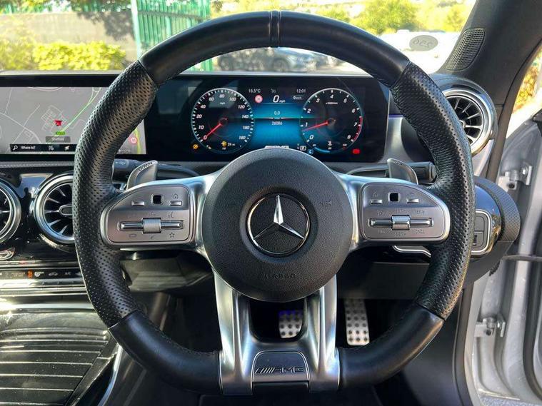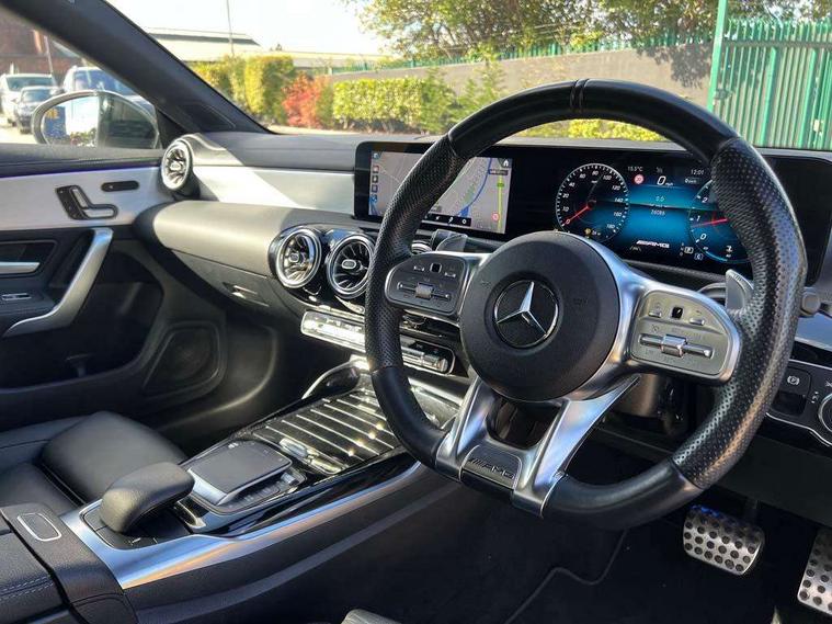 10.25 inch Instrument display with digital cockpit, 10.25 inch touchscreen central media display, Attention assist - Monitors steering behaviour and long journey fatigue, Bluetooth connection, Car wash mode, Digital instrument cluster with three AMG display styles and AMG menu, DYNAMIC SELECT with driving programs (Slippery, Comfort, Sport, Sport+ and Individual), ECO start/stop function, Fluid level warning indicator for fuel, oil, coolant and washer fluid, Hard-disk navigation, Hey Mercedes Voice activation, Lamp failure indicator, Mercedes me connect including emergency call system, accident recovery, breakdown and maintenance management, Mercedes me remote services, Outside temperature gauge, Owners manual and service booklet in English, Pre-installation of private car share, Preinstallation for Mercedes Benz link, Radio aerial integrated into front and rear windshields, Service indicator (ASSYST), Smartphone integration with Apple CarPlay and Android auto, Traffic sign assist, Trip computer in multifunction display with current consumption indicator, 7G-DCT 7 speed automatic transmission, Rear axle multi-link, Suspension with adaptive damping system, DAB digital radio tuner, MBUX multimedia system with DAB digital radio and touchpad including satellite navigation, Mercedes Benz sound system (100 W) with 6 speakers, USB (type C) ports (2) in stowage compartment and 1 in front of centre console, Adaptive brake lights, AMG body styling with AMG front apron and rear apron and visible exhaust tailpipe in chrome trim elements, AMG bodystyling side skirts, AMG Front apron with flics as air deflector elements on the outer air intakes, AMG radiator grille with twin blade lamella and AMG Lettering, AMG Rear apron with specific diffuser look with four vertical fins and two round chrome plated tailpipe trim elements with a diameter of 90 mm, AMG Sports exhaust system with two round tailpipes measuring 90 mm in diameter attached in rear apron, AMG lettering plus ribbing on the inside of the, Automatically controlled exhaust flap, Beltline strips in High gloss Black, Body colour bumpers, Body colour door handles, Chrome weather strip, Electric windows, Electrically adjustable and heated door mirrors with integrated LED indicators, Front splitter and trim elements on the louvres in the outer air inlets in silver chrome, Front wings with TURBO 4MATIC lettering, Headlamp assist automatic headlamp activation, Heated glass rear windscreen + timer control, High level LED third brake light, Integrated LED daytime running lights, Interior mirror with black reading lamps and frameless, LED tail lamp, Multibeam LED headlamps with adaptive highbeam assist plus, Privacy glass with dark tinting on rear side windows and rear window, Rain sensing windscreen wipers with two sensitivity settings, Rear fog lamp, Window line trim strip in high gloss black, 40:20:40 split folding rear seat backrests, Air conditioning - Two zone thermotronic luxury automatic climate control with display, Air vents with surround in silver chrome, AMG Performance steering wheel in nappa leather, Automatic child seat recognition sensor, Black roof lining, Brushed stainless steel sports pedals with rubber studs, Electrically adjustable front memory seats including lumbar support, Floor mats with stitched AMG lettering, Front centre armrest with stowage, Heated front seats, Illuminated front door sills with changeable cover, Illuminated glove compartment stowage, Interior lighting - 64 colour Ambient lighting, Luggage net on driver/front passenger seat backrest, Manually height and reach adjustable steering column, Rear armrest with two integral cup holders for drinks, Rear head restraints, Silver coloured aluminium gear shift paddles on steering wheel, Sport seats with fixed head restraints, Stowage compartment in centre console with retractable cover, Sunvisors with illuminated vanity mirrors, Touchpad on center console, Twin front cupholders, Two outer rear seat isofix and top tether child seat fixing points, Aerodynamics pack - CLA, AMG Night package - CLA 35/45, Light and sight pack - CLA, Mirror pack - CLA, Parking package - CLA, Seat comfort pack - CLA, Active bonnet pedestrain safety measure which detects an impact and raises bonnet by 65mm, Adaptive brake assist with hold function and hill start assist, Anti-lock braking system (ABS), Black seat belts, Bonnet with power domes, Brake pad wear warning indicator, Childproof locks manually operated for rear doors and electrically operated for rear power windows, Crash responsive emergency lighting, Driver and front passenger head and sidebags, Driver and front passenger windowbags, Drivers knee airbag, Dual stage driver and front passenger airbags, Electric parking brake, Electronic stability programme with acceleration skid control, ESP curve dynamic assist, Front and rear seatbelt reminder, Front brake calipers with AMG lettering, Front passenger seat occupancy sensor, Perforated front brake discs, Three point rear seat belts, Tyre pressure monitoring system, Warning triangle and first aid kit, Remote central locking and crash sensor with emergency opening function, Urban guard vehicle protection system with immobiliser and interior protection, Light aluminium with longitudinal grain interior trim, 19" AMG multi-spoke matt black painted light alloy wheels with high sheen finish, Summer tyres, Tirefit tyre sealant kit, Wheel arches wider for AMG wheels,