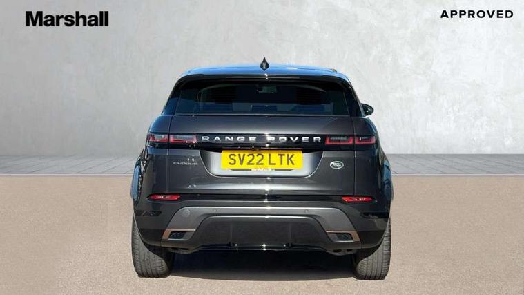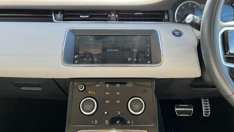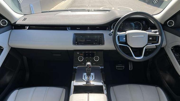 Adaptive cruise control, Android Auto, Apple car play, Blind spot assist, Bluetooth connectivity, Brake pad wear indicator warning light, Driver condition monitor, eCall emergency system, Electronic power assisted steering (EPAS), Front and rear parking aid, InControl remote, Land Rover InControl apps, Lane keep assist, Pivi pro connected includes upgraded infotainment, connected navigation pro, Nuance speech licence, Push button starter, Rear collision monitor, Rear traffic monitor, Traffic sign recognition with adaptive speed limiter, Voice control system, All terrain progress control, Efficient Driveline, Large fuel tank, Passive suspension, Terrain Response 2 Auto, Digital Audio Broadcast radio-DAB, Steering wheel mounted controls, Auto headlights, Automatic headlight levelling, Electric windows with one touch open/close and anti trap, Evoque and R-Dynamic badge, Flush deployable exterior door handles, Heated rear window with timer, Heated washer jets, Heated windscreen, Power fold, auto-dimming, heated door mirrors with approach lights and auto dimming driver side, Rain sensing windscreen wipers, Rear fog lights, Rear side wing doors, Rear wiper, Tailgate spoiler, Third brake light, 40:20:40 split folding rear seats with centre headrest and armrest, Ambient interior lighting, Bright metal pedals, Isofix system on outer rear seats, Overhead lighting console, Overhead stowage for sunglasses, Passive front head restraints, Rear air vents, Rear centre headrest, Rear head restraints, Satin chrome gearshift paddles, Single passenger seat, Sunvisors with illuminated vanity mirrors, Twin sliding front centre armrest, 3 rear 3 point seatbelts, Anti-lock braking system (ABS), Customer configurable autolock, DSC - Dynamic Stability Control, Electronic brake force distribution, Electronic parking brake, Electronic traction control, Emergency braking, Front and rear seatbelt reminder, Hill descent control, Hill launch assist, Low traction launch, Power operated child locks, Roll stability control, Six airbags - Driver and passenger airbags/driver knee airbag/front side airbag and curtain airbags, Torque vectoring brake, Tyre pressure monitoring system, Alarm, Immobiliser, Intrusion sensor, Keyless entry, Locking wheel nuts,