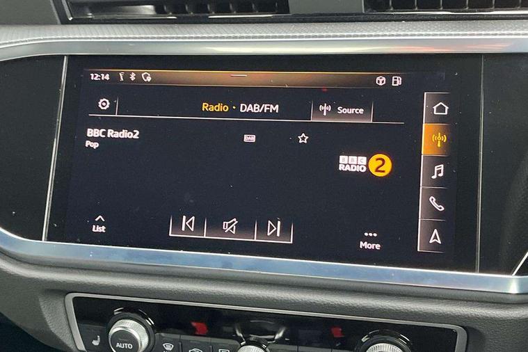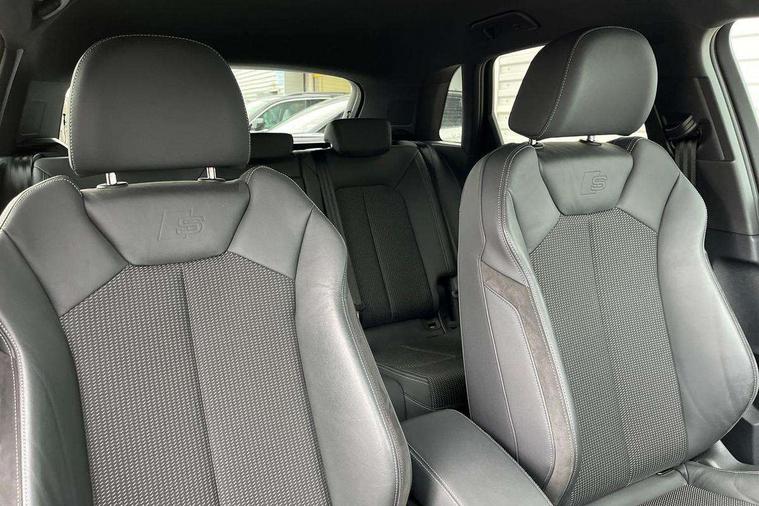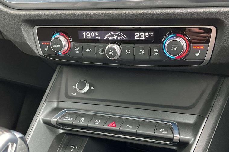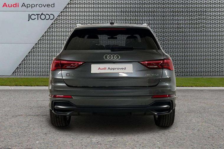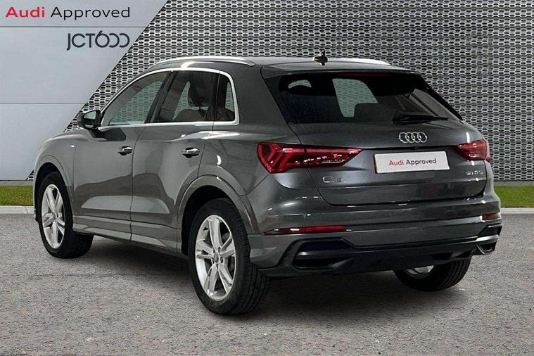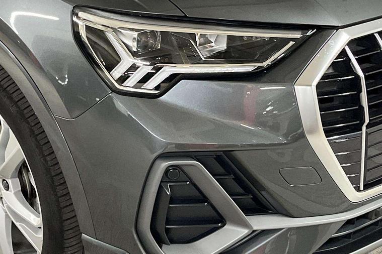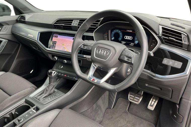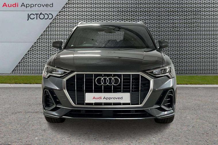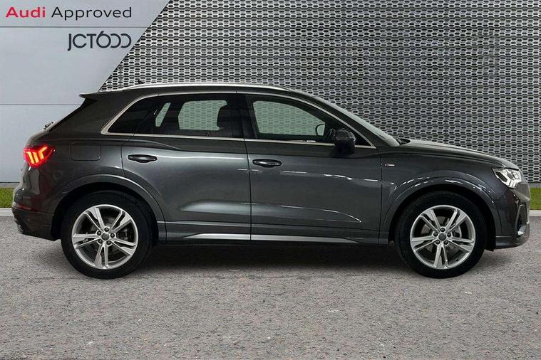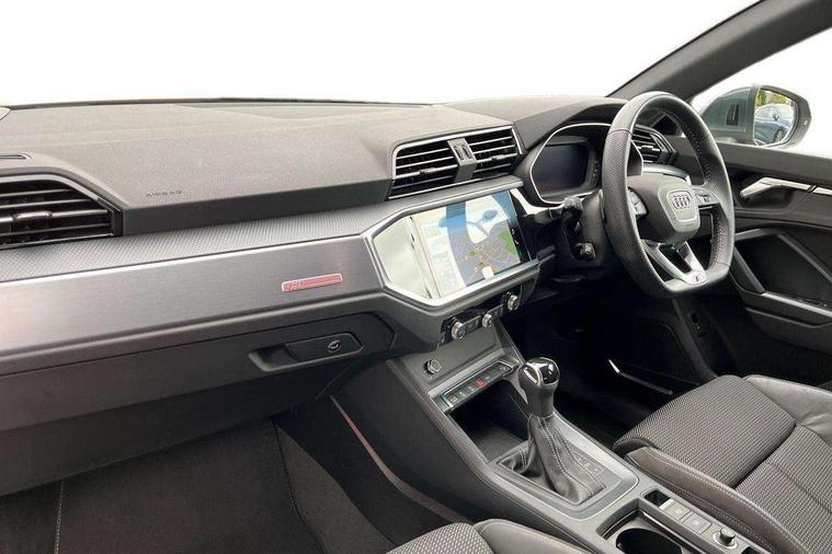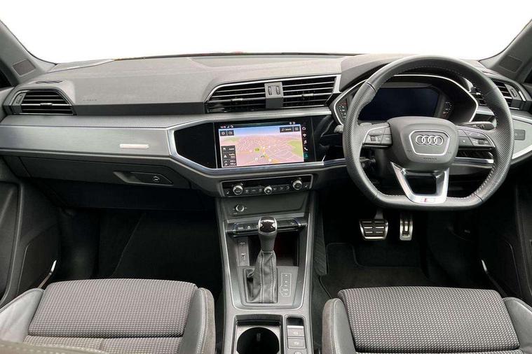 Audi connect safety and service (e-call), Audi drive select, Audi lane departure warning, Audi side assist, Audi Virtual Cockpit - 10.25" display, Bluetooth interface, Camera based traffic sign recognition, MMI Navigation Plus with high resolution 10.1 inch touchscreen colour display, Power operated tailgate, Progressive steering, Service interval indicator, Smartphone interface includes wireless Apple carplay/Android Auto, Start stop system with recuperation, Voice control system with natural language interaction, 48V Mild hybrid technology, Sports suspension, 1 x USB type C and 1 USB type A charging points, 6 passive loudspeakers, DAB digital radio module, Acoustic windscreen, Aluminium roof rails, Aluminium window trim, Auto dimming frameless rear view mirror, Body coloured bumpers, Electrically folding, adjustable and heated door mirrors with integrated LED side indicators and kerb view function for passenger side, Front and rear electric windows, Front fog lights, Front side air inlets in matt platinum grey, Front spoiler blade in matt platinum grey, Grille vertical bars in aluminium silver/Matt, High gloss black finish B and C pillars, LED headlights with LED daytime running lights and dynamic rear indicator, LED rear lights, Privacy glass dark tinted rear and rear-side windows (from B-pillar backwards), Rain and light sensors, Rear diffuser strip in matt titanium black, S line badges on front wings, S Line front and rear bumpers, Side skirt insert in matt Platinium grey, Silver chrome grille surround, Titanium black radiator grille, 12V socket in rear centre console, 40:20:40 folding with manual adjustment for 60:40 forwards/backwards position and backrest angle, Adjustable rear seat bench/backrest with centre armrest and cupholder, Black cloth headlining, Dual zone electronic climate control, Front and rear black floor mats with contrast stitching in rock grey, Front and rear headrests, Front and rear roof module including reading lights, Front centre armrest, Glove compartment lighting, Height and reach adjustable steering wheel, Illuminated door sill trims with S logo, ISOFIX child seat mounting for front passenger with airbag deactivation and outer rear seat including top tether attachment point for outer rear seats, Luggage compartment light, Manual front seats with height adjustment, Perforated leather gearknob, Stainless steel luggage compartment sill finisher, Stainless steel pedals, Non smoking pack - Q3, 3x3 point rear seatbelts, 6 airbags - Driver, front passenger, curtain and side windows, Audi pre-sense front with pedestrain and cyclist recognition, Electrically operated child locks on rear doors, Electromechanical parking brake, Electronic stabilisation control including ABS, ASR and EDL, Hill descent control, Hill hold assist, Pre sense basic, Seatbelt monitoring, Tyre pressure warning, Warning triangle and first aid kit, Anti theft alarm, Anti theft wheel bolts, Remote central locking, Dark matt brushed aluminium inlay, Detail dashboard around MMI touch colour display in glass look, black with surround in aluminium look, Leatherette door armrest, Tool kit, Tyre repair kit,