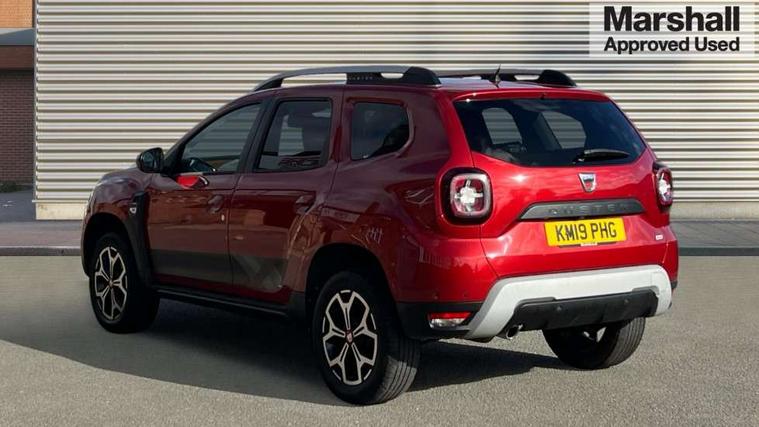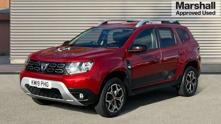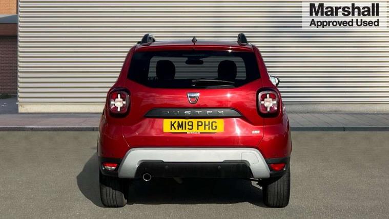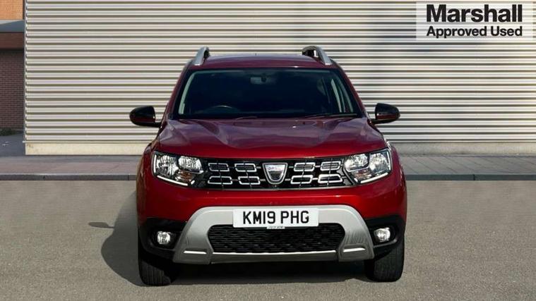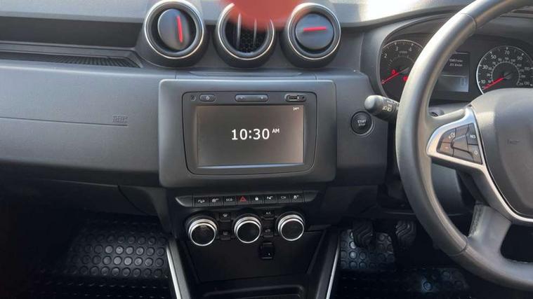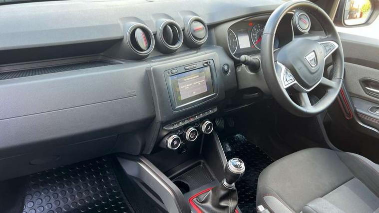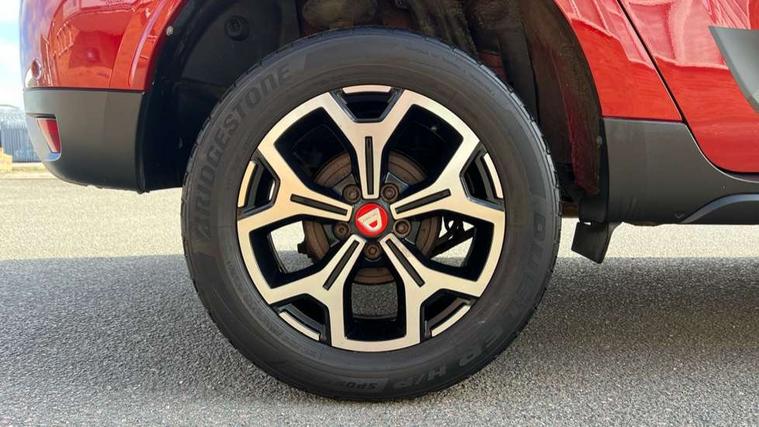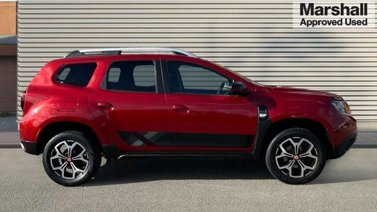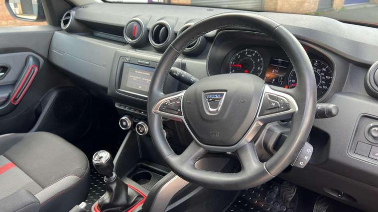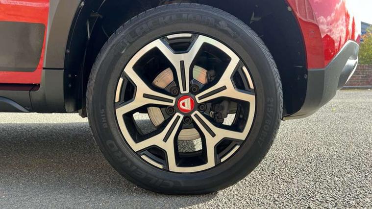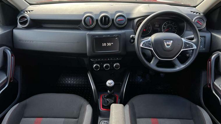 Blind spot monitoring, Bluetooth connectivity, Centre differential lock with selectable 2WD, Auto and Lock modes, Cruise control, Eco mode, Electric power assisted steering, MediaNav Evolution 7" touchscreen multimedia system with satellite navigation with Apple car play and Android auto, Multi view camera, On board computer, odometer, trip computer, average fuel consumption, average speed, service indicator, outside temperature gauge, Rear parking camera, Rear parking sensors, Rev counter, Speed limiter, Stop/start system, 4x 20W FM/AM/DAB tuner with steering column mounted fingertip controls, Aux-in socket, USB connection for MP3 players, 3 speed windscreen wipers, Black side sills, Body coloured door handles, Body coloured front and rear bumpers, Body-coloured door mirrors with red stripe, Chrome front grille, Dark tinted windows, Double optic headlights, Dusk sensor, Electric adjustable/heated door mirrors, Electric front windows, Electric rear windows, Front door sill protection strip, Front fog lights, Heated rear window, High level third rear brake light, LED daytime running lights, Metallic paint, Rear wash/wipe, Satin chrome front and rear skid plates, Satin chrome longitudinal roof bars, Tailgate trim with satin chrome Duster inscription in black background, 3 rear height adjustable headrests, 4 speed heating and ventilation with air recirculation, 60/40 split folding rear seat, Boot light, Climate control, Driver seat lumbar adjustment, Fabric decorative insert on door panels, Front passenger reading light, Front seat armrests, Gear shift indicator, Glovebox light, Height adjustable driver seat, Height adjustable front headrests, Height adjustable steering wheel, Isofix points for child seats in both outer rear seats, Map pocket on front seat backs, Matt black front door handles, Matt black rear door handles, Passenger sunvisor with vanity mirror, Rear passenger reading light, Satin chrome gear lever cap insert, Satin chrome lower steering wheel insert, Soft feel steering wheel, 3x3 point rear seatbelts, ABS and Emergency brake assist, ASR traction control with Electronic stability control, Child locks on rear doors, Door open warning, Driver airbag, Driver and passenger seatbelt not fastened - visual and audible warning, Front passenger airbag deactivation, Front seatbelt pretensioners, Front side airbags, Height adjustable front seatbelts, Hill descent control, Tyre pressure monitor, Keyless entry, Remote central locking, Thatcham approved engine immobiliser, Dark carbon central console surround, Matt black central console fascia, Piano black decorative insert on door panels, Satin chrome air vent surround, Satin chrome instrument dial surrounds, 17" Diamond cut alloy wheels with red center piece,