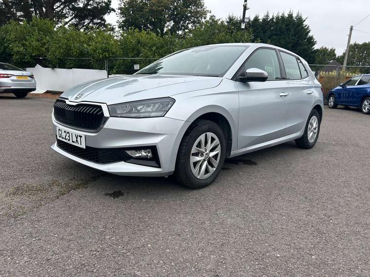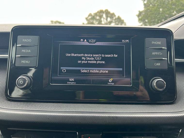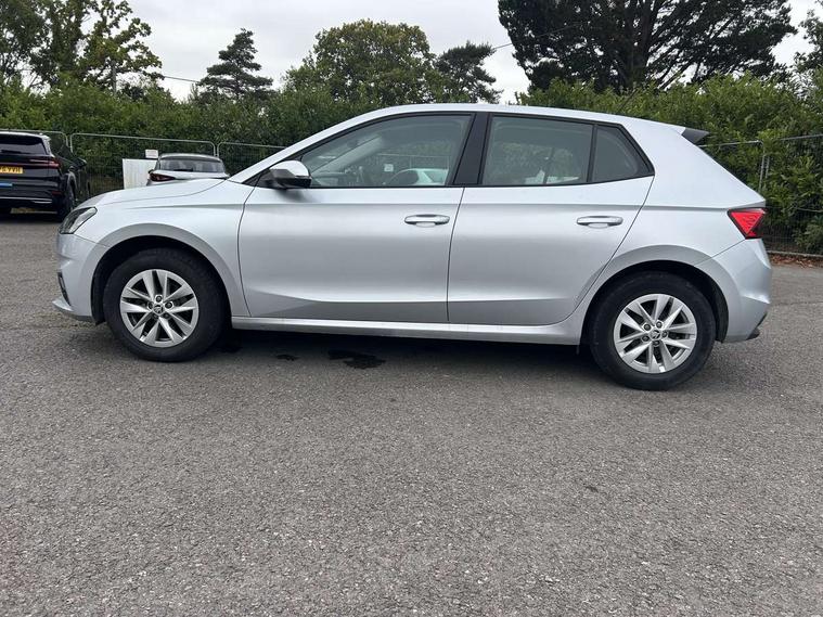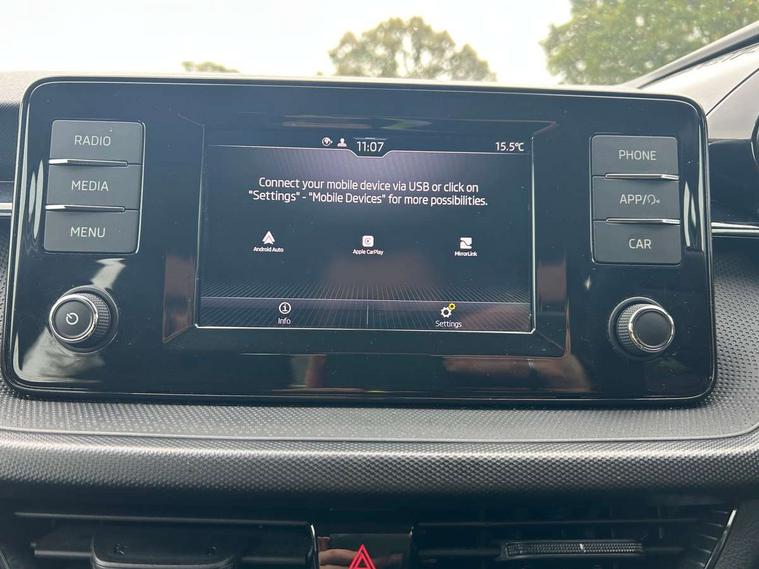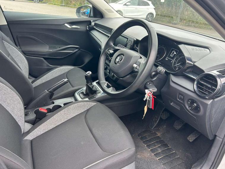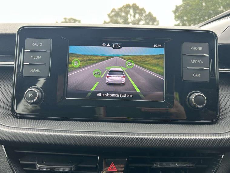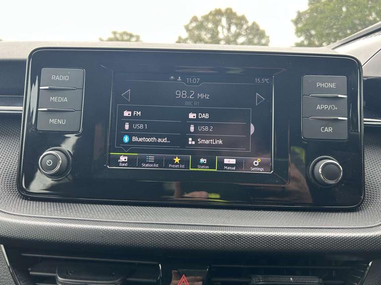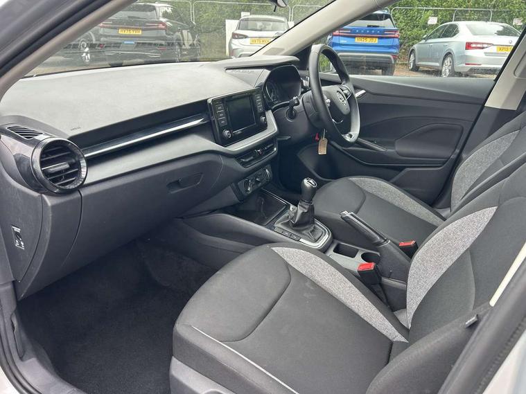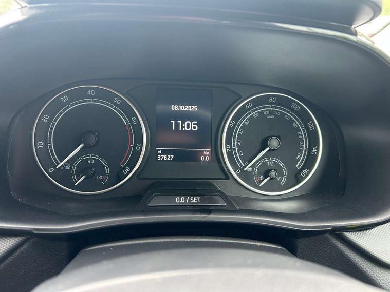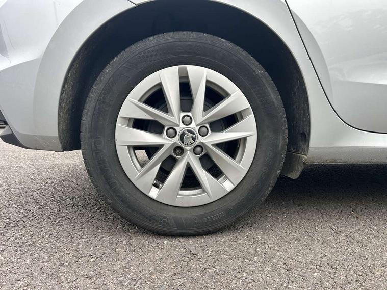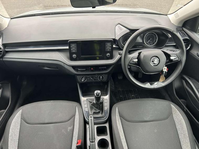 Bluetooth connection, Driver alert system - DAS, Electromechanical power steering, Exterior temperature gauge, Lane assist including road edge detection, Multifunction trip computer in black and white, Service interval indicator, Speed limiter, 2x USB-C in the front (for data transmission and charging), 4 speakers in front, Auxiliary socket for external MP3 player, DAB digital radio reception, Radio Swing with 6.5" colour display, Basic LED Headlights, Basic rear lights, Body colour door mirrors, Body coloured bumpers, Dimming rear view mirror with black frame, Door mirror integrated indicators, Electrically adjustable and heated door mirrors, Electrically adjustable front windows with function auto up/down, Front fog lights, Front window wiper intermittent control, Headlight range control - Automatic, Ice scraper in fuel cap, LED daytime running lights with coming and leaving home feature, Mechanical adjustable rear windows, Rain sensor, Rear LED fog light, Rear side wing doors, Rear window wiper with washing nozzles, Roof mounted spoiler, SKODA tailgate lettering in chrome, Third brake light, 2 reading lights in front and 2 reading lights in rear, 2 spoke leather multifunction steering wheel, 3 rear headrests, Backrest split and folding, Central console with fixed cup holder and storage box, Chrome handbrake release button, Fabric upholstery, Gearshift knob/handle in leather, Grain satin black interior door handles, Hand brake lever handle in leather, Height adjustable front headrests, Height adjustable front seats, Height adjustable steering wheel, ISOFIX and TopTether anchorage points to the outer rear seats, ISOFIX and TopTether on the front passenger seat, Luggage compartment lighting, Manual air conditioning, Manually adjustable lumbar support in front seats, Pollen filter, Rear seat bench unsplit, Single front passenger seat, Storm grey headlining, Sun visors with mirror and airbag label on passenger side, Ticket holder, 3-point height adjustable front seats belts with pretensioner and force limiter, Automatic warning lights in case of crash, Driver and passengers airbag with switch off function, e-Call+, ESC including ABS, MSR, ASR, EDS, HBA and XDS, Front and rear seat belt warning, FRONT ASSIST (AEB City and AEB Inter Urban), Front side airbags, Head airbags, One tone horn, Pedestrian protection, Three rear 3-points safety seat belts with pretensioner and force limiter including stop function for outer rear seat belts, Tyre pressure monitoring system, Anti-theft alarm system including immobiliser, interior monitoring, backup horn, and towing protection, Central locking with radio remote control, interior controls, SAFE function and 2 foldable keys, Black painted air vents, Glossy black decorative trim, Grain satin black central console cover, Grain satin black lower decorative trim, Satin black door and side trim panel in front, Anti-theft wheel bolts protection, Super-low rolling resistance tyres,