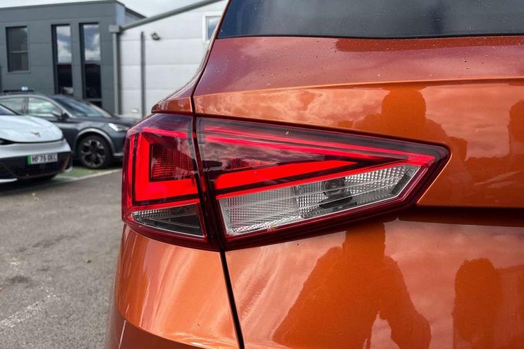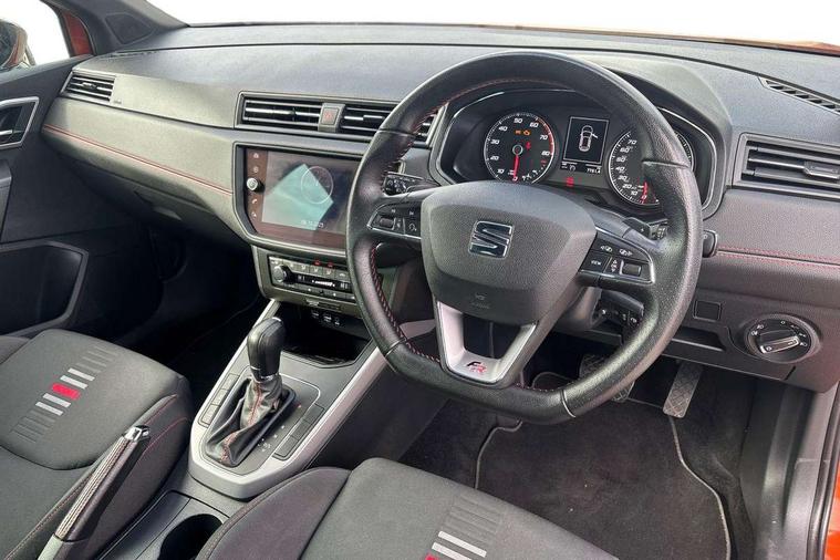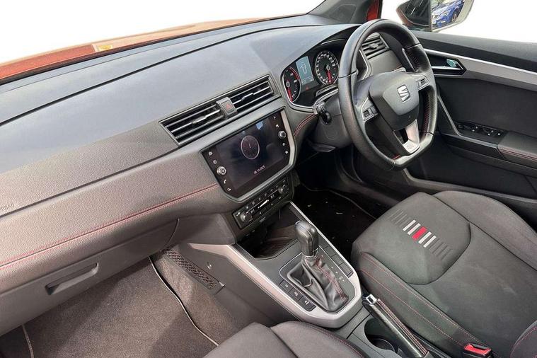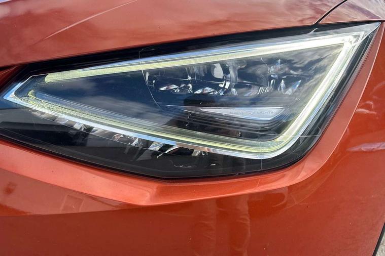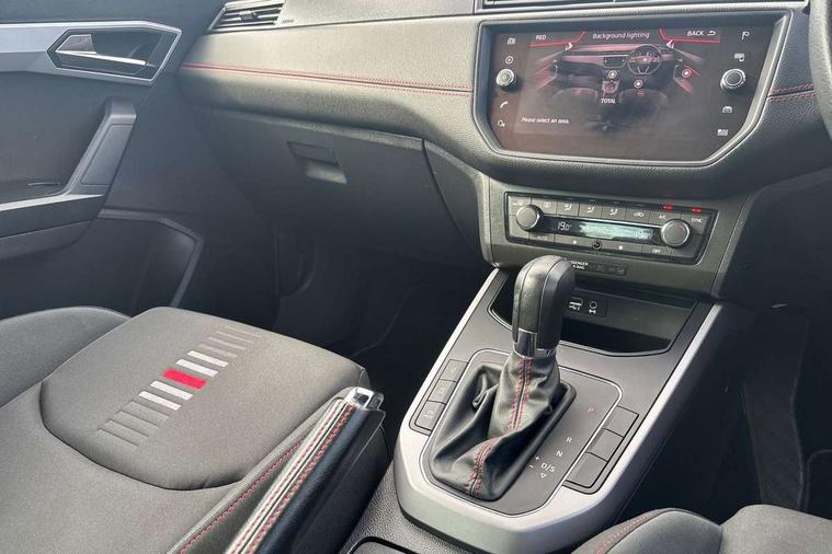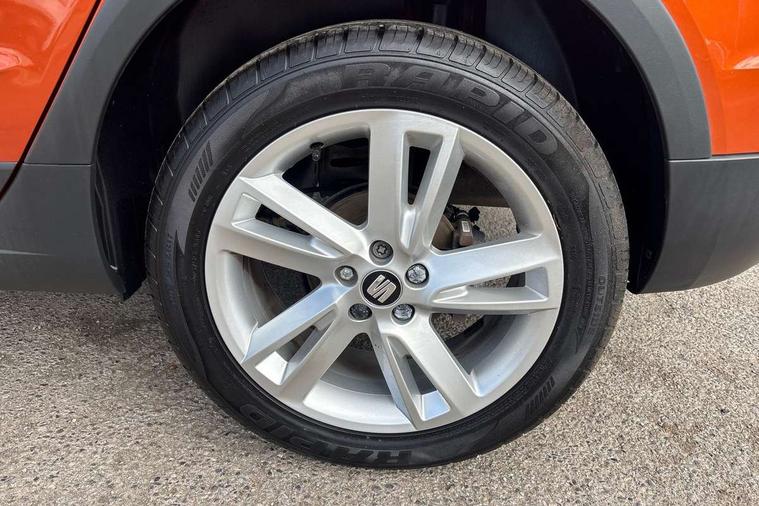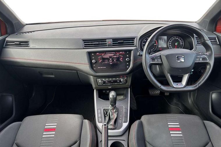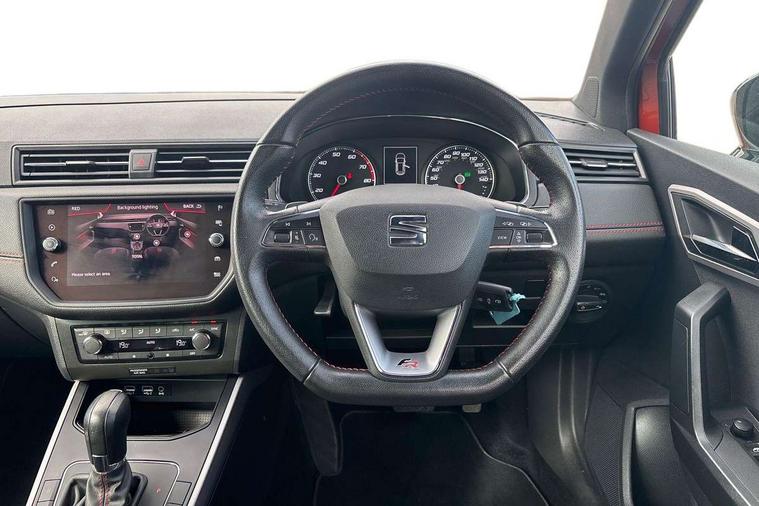 'Lights On' Reminder warning buzzer, Cruise control, Digital clock, Electric speed sensitive power steering, Front assistant collision mitigation, Full Link Smartphone Integration with Mirror Link, Apple Car Play, Google Android Auto, Low fuel warning light, Outside temperature display, Rear parking sensor, RPM counter, SEAT Drive profile, Trip computer, Sports suspension, 6 speakers, Bluetooth interface for hands free and audio streaming, DAB Digital radio, SEAT USB media cable, Steering wheel mounted audio controls, Anti theft roof antenna, Auto dimming interior rear view mirror, Automatic activation of hazard warning lights, Automatic headlights, Body coloured bumpers, Body coloured door handle inserts, Chrome grille surround, Chrome roof rails, Chrome window surround, Coming/leaving home lighting function, Dark tinted rear windows, Electric front/rear windows with one touch/auto up/down, Electrically adjustable and heated door mirrors, Electrically folding wing mirrors, Front fog lights, Full LED headlights, LED daytime running lights, LED licence plate lighting, LED tail lights, Rain sensor windscreen wipers, Rear fog lights, Rear window wash/wipe, Roof colour door mirrors, Twin exhaust pipes, Visible VIN plate, Windshield wiper with intermittent control and potentiometer, 2 cupholders, 3 rear height adjustable headrests, 60/40 split folding rear seat, Active head restraints, Ambient interior lighting, Card holder, Double boot floor, Driver and passenger sunvisors, Driver/front passenger seat height adjustment, Dual zone climate control, Dust/pollen filter, Flat bottomed steering wheel, Footwell ambient lighting, Front courtesy lights, Front reading light, Gear shift indicator, Gearshift paddles on steering wheel, Height/reach adjustable steering column, Illuminated boot, Instrument lighting with brightness control, Isofix attachments on rear seats, Leather handbrake, Leather steering wheel and gear knob, Multi-colour ambient interior lighting, Nora cloth upholstery, Sports seats, Connectivity pack plus - Arona, 3 point seatbelts on all rear seats, ABS+EBA, Child locks on rear doors, Driver/Front Passenger airbags, Electronic stability control, Front and rear seatbelt reminder, Front side/curtain airbags, Height adjustable active front headrests, Hill hold control + Tyre Pressure monitor, Multi-Collision braking, Passenger airbag deactivate switch, Tiredness recognition system, Traction control, 2 folding remote keys with window open/close function, Alarm with back-up horn, Immobiliser, Locking wheel bolts, Remote central locking + deadlocks, Tow away protection, Interior chrome line trim, 17" Dynamic alloy wheels,