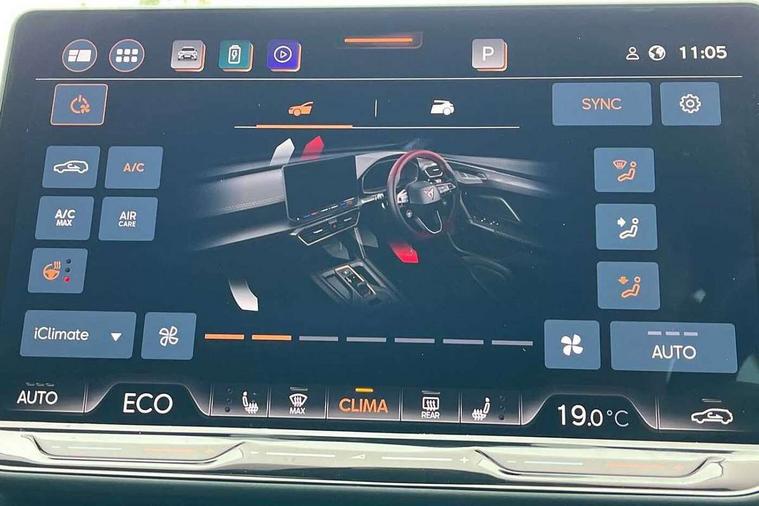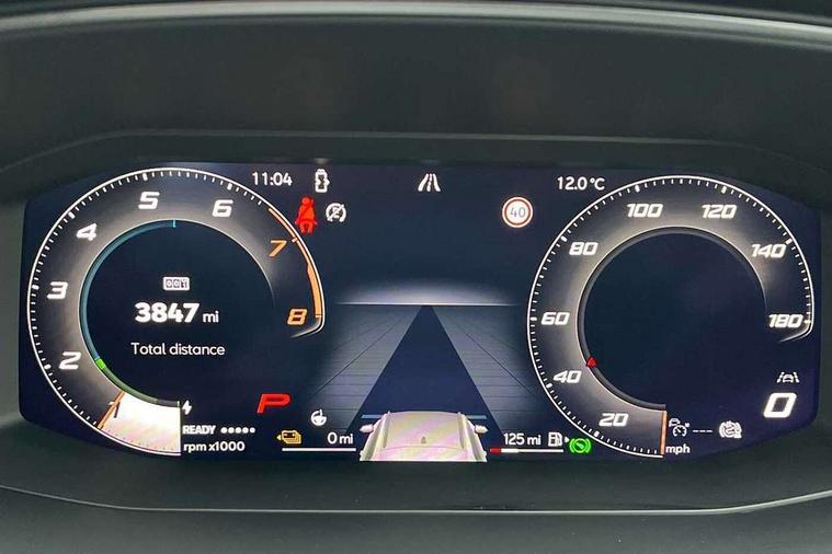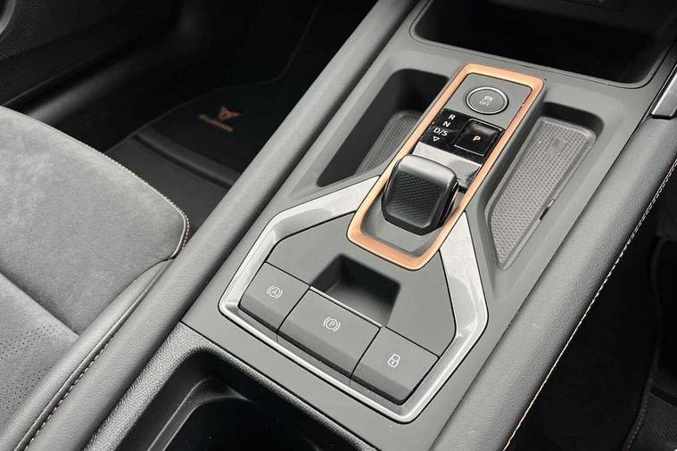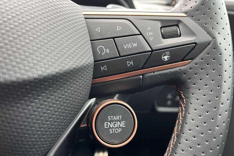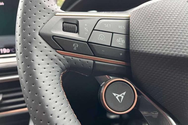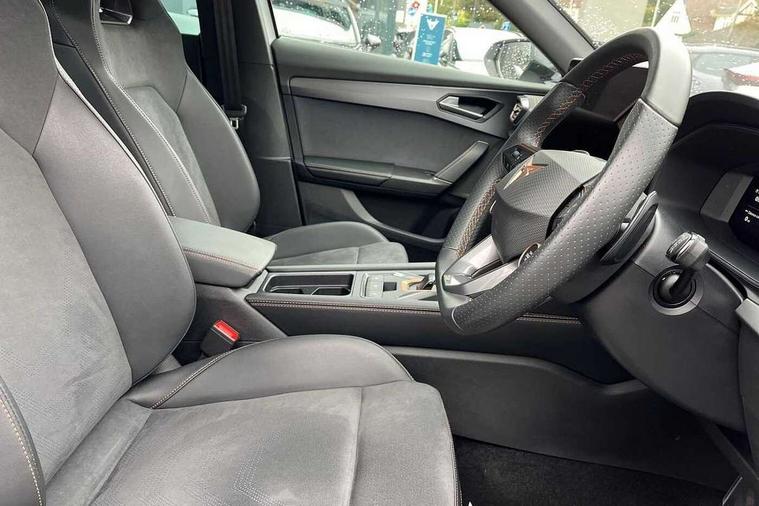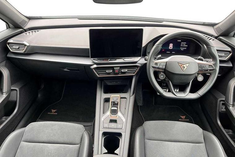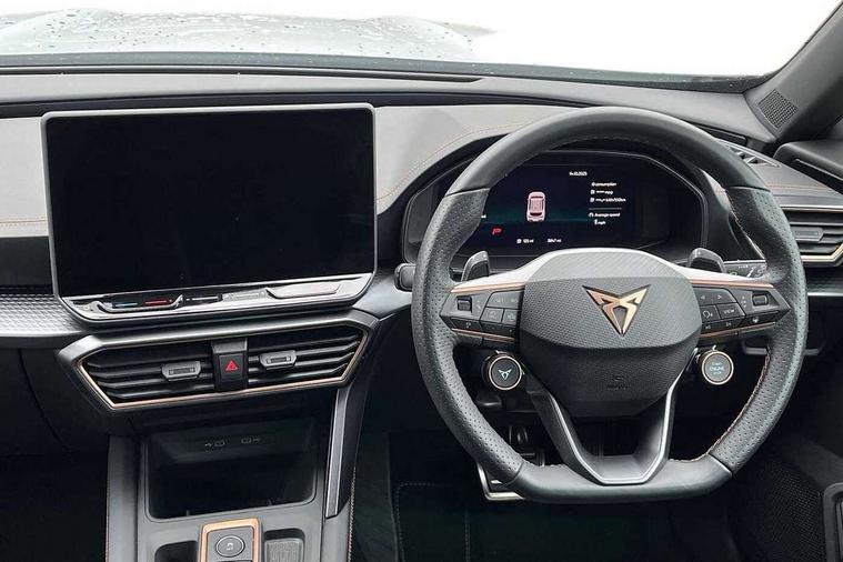 10.25" digital cockpit and configurable dashboard, Adaptive cruise control with follow-to-stop and speed limiter, Advanced driver alert system, Dynamic chassis control with driving profile selection (Comfort, Sport, CUPRA, Individual), Dynamic road sign display, Emergency steering support with turn assist, Forward collision warning with automatic braking, Front and rear parking sensors, Full link phone integration, Lane assist, Rear view camera, RPM, trip computer, outside temp gauge, instrument light brightness, low fuel warning light, lights on reminder, gearshift indicator, Service interval indicator, Speed sensitive power steering, Start/stop system with regenerative braking, Virtual pedal and electric tailgate, Voice control system, Wired Android Auto, Wireless apple carplay, Wireless phone charger, 10 amp mode 2 charging cable, 32 amp mode 3 charging cable, Adaptive chassis control with continuous operation, CUPRA sport suspension, Electronic locking differential and dynamic traction support, 2 front and 2 rear USB type C sockets, Media system with navigation, 12.9" touchscreen display, voice control, DAB, steering wheel mounted controls, Auto dimming rear view mirror, Body colour door handles, Body coloured bumpers, Dark grey wing mirror, Daytime running light with automatic headlight control and coming home feature, Door panel ambient lighting, Dynamic headlight range control, Electric front/rear windows, Electrically adjustable heated and folding door mirrors with memory function, Gloss black roof rails and window surrounds, High beam assist, LED 3rd brake light, LED front fog lamps with cornering function, LED Taillights with dynamic indicator, Matrix LED headlights with multifunction camera, Rain sensing wipers, Rear diffuser with copper simulated exhaust pipes, Rear fog lights, Rear side wing doors, Rear wash/wipe, Tinted rear windows, Welcome lights (within exterior mirror housing), 12V socket, 2 front and 2 rear reading lights, 3 seat bench in 2nd row, 60/40 split rear bench seat with armrest and mechanical seat release, Black headlining, Black interior roof lining, Cupra sports pedals, Dust/pollen filter, Electrically adjustable front seats with lumbar support and memory function, Front and rear head restraints, Front centre armrest, Heated front seats, Heated supersports multifunction leather steering wheel with satellite buttons and gear shift paddles, Height/reach adjust steering wheel, Illuminated aluminium doorsteps, Illuminated interior front door sills, Illuminated sunvisor with mirror, Isofix, Leather dashboard, door insert and side trim panel, LED smart wraparound lighting, PVC/Dinamica microfiber upholstery + bucket seats, Satellite steering wheel, Single front passenger seat, Storage pockets on rear of front seats, Three zone climate control with control panel in rear, 3 point seatbelts on all rear seats, ABS, Brake control system - ESC and brake booster, Child proof door locks, Driver and front passenger airbags with front passenger airbag de-activation, Electronic parking brake, Front and rear disc brakes, Front side curtain airbags, Hill hold control, Public e-call, Seat belt reminder for front and rear seats, Tyre pressure monitoring system, Anti theft alarm system, KESSY Advanced - Keyless start, keyless entry with SAFELOCK, Locking wheel bolts, Copper and aluminium interior detailing, 19" Sandstorm machined sport black and silver alloy wheels, Breakdown and tool kit,