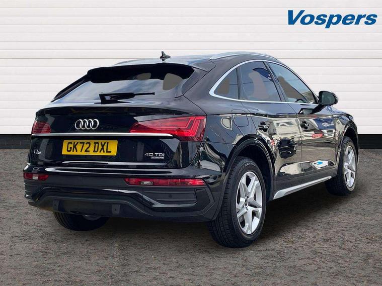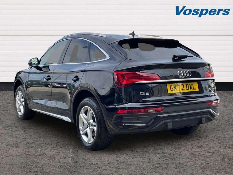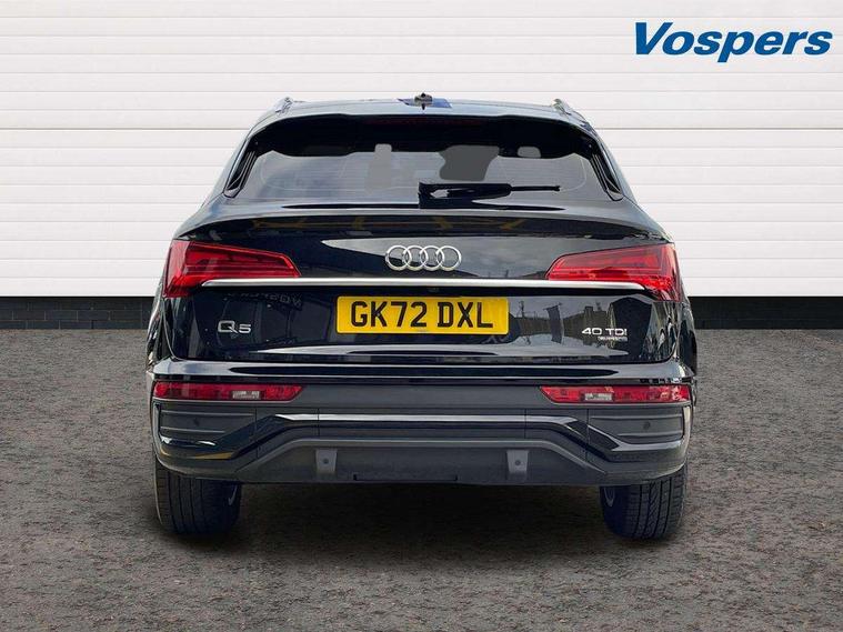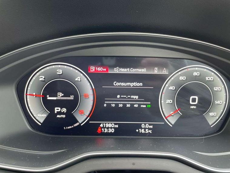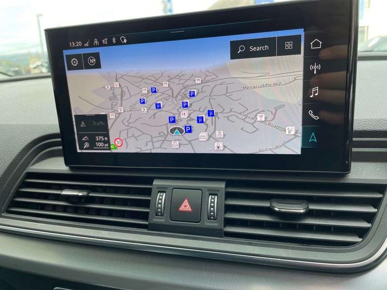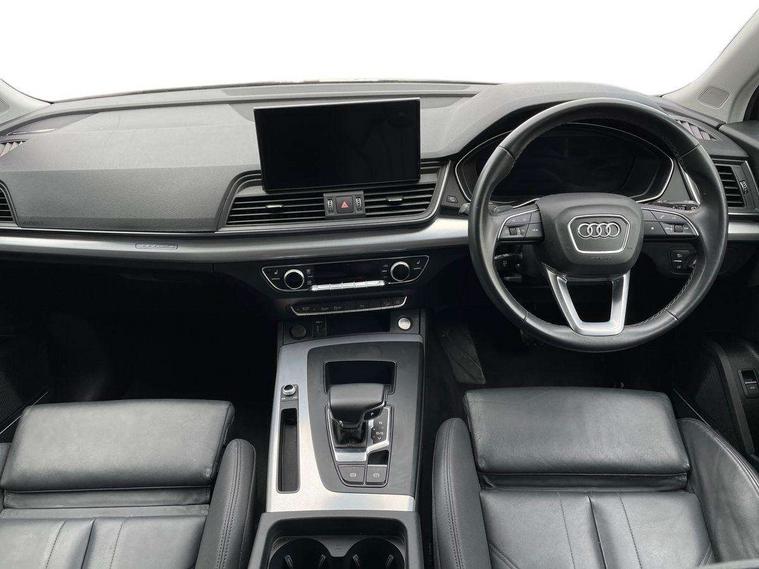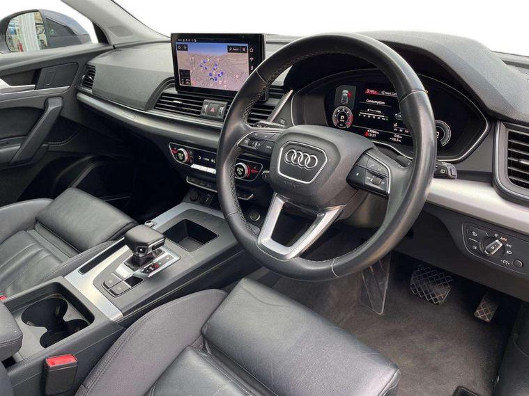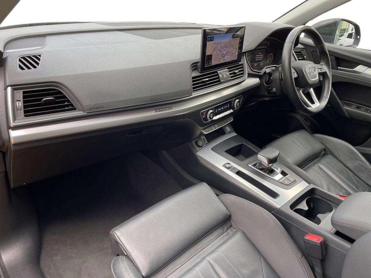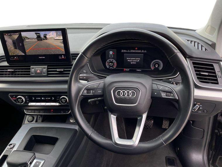 Audi connect safety and service (e-call), Audi connect with Amazon Alexa Integration, Audi drive select, Audi virtual cockpit plus with 12.3" screen and three different layout designs, Audi wireless smartphone interface, Automatic start-stop system with coasting functionality and efficiency programme, Bluetooth interface, Cruise control + speed limiter, Electro - mechanical power assisted steering, MMI navigation plus with 10.1" touch screen, Power tailgate, Reversing camera, Service interval indicator, Voice control system with Audi hotword activation "Hey Audi", Diesel particulate filter, Dynamic suspension, Quattro on demand, DAB Digital radio, Acoustic windscreen, Air inlets in matt titanium black with blades in matt aluminium silver, Aluminium roof rails, Auto dimming door mirrors, Auto dimming rear view mirror, Automatic headlights and windscreen wipers, Body colour door mirrors, Chrome plated exhaust trims, Daytime running lights, Door sills in Selenite silver, Electric adjustable/heated/folding door mirrors, Front and rear electric windows, High level LED brake light, LED headlights and LED tail lights, Lower bumpers painted in contrast Manhattan grey, Matt selenite silver underbody protection, Matt twilight grey radiator grille with chrome vertical struts, Rear chrome trim strip below lights, Rear diffuser strip in selenite silver, Rear side wing doors, Rear spoiler, Rear wiper, Roof bars, 2 x USB charging port with aux input socket, 3 rear headrests, 3 spoke multifunction leather steering wheel with shift paddles, 40:20:40 split folding 3 rear bench seat in 2nd row with rear centre armrest, Comfort front centre armrest, Deluxe 3 zone electronic climate control, Door sills trims with aluminium inlays, Front head restraints, Front/rear floor mats, Heated front seats, Height/reach adjustable steering column, ISOFIX child seat mounting and top tether, Manual seat adjustment with 4-way electric lumbar support, Removable luggage compartment floor, Silver cloth headlining, Single front passenger seat, Sunvisors with vanity mirrors, Trunk roller cover, Twin leather upholstery + front sports seats, High gloss pack - Q5, LED interior light pack - Q5, 3 point seatbelts on all seats, 6 airbags - Driver, front passenger, curtain and side airbags, Electrically operated child locks on rear doors, Electromechanical parking brake, Electronic stabilisation control including ABS, ASR and EDL, Front passenger airbag deactivation, Hill descent control, Hill hold assist, Multi collision brake assist, Pop-up bonnet for pedestrian protection, Pre sense city, Seat belt force limiter, Seatbelt monitoring, Tyre pressure warning, Warning triangle and first aid kit, Anti theft alarm, Anti-theft wheel bolts, Keyless Go access/ignition system, Remote central locking, Aluminium rhombus inlay,