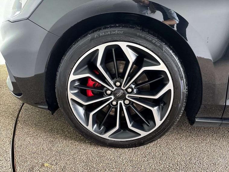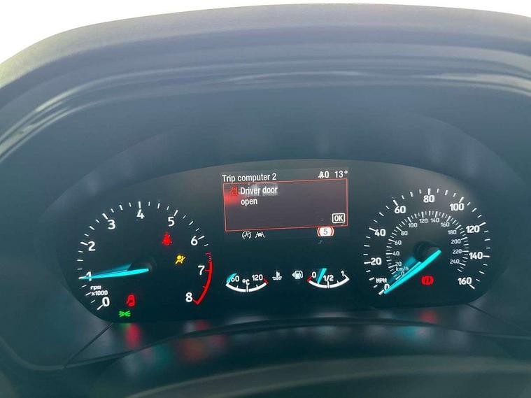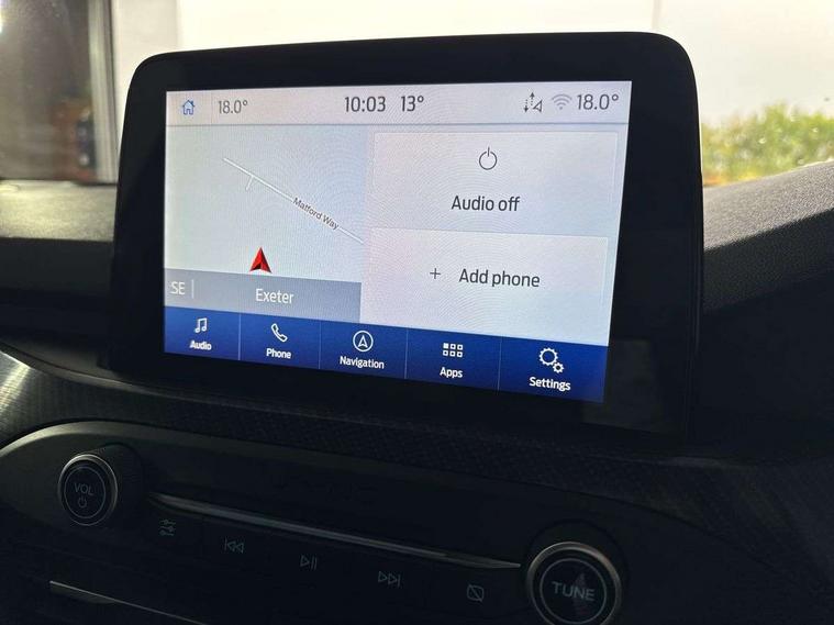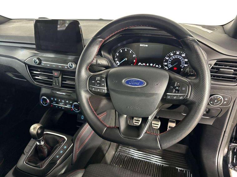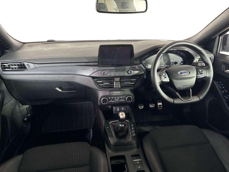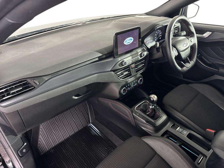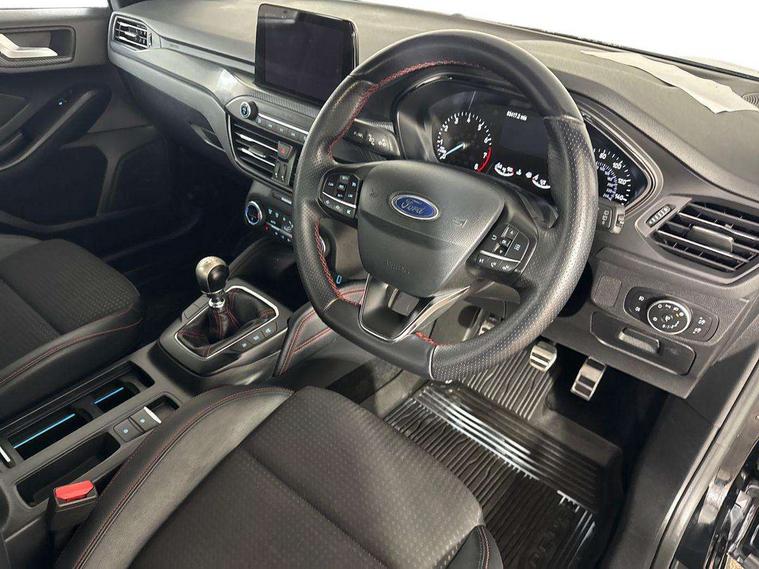 4" TFT coloured cluster screen, Bluetooth system, Digital clock, Easy fuel capless refuelling system, Eco mode, Ford pass connect, Ford SYNC 3 nav system with DAB radio, 8" colour touch screen, voice control, app link, Apple car play/Android auto and 4.2" TFT coloured cluster, Lane keeping aid with lane departure warning, PAS, Selectable drive mode, Trip computer, Sports tuned suspension, 2 USB ports, Aux input, 'Quickclear' heated windscreen/heated washer jets, Auto dimming rear view mirror, Auto headlamps (on/off), Automatic rain sensing wipers, Body colour large rear spoiler, Body colour side skirt, Body coloured bumpers, Body coloured door handles, Body coloured electrically operated and heated door mirrors with side indicators, Electrically operated front and rear windows with one touch opening and closing, Front variable intermittent wipers with electric wash, Heated rear window, LED daytime running lamp, LED front fog lamps with cornering function, Polished twin tailpipe, Power folding door mirrors with puddle lights, Rear privacy glass, Roof rails, ST-Line upper and lower grille with full body styling kit and wing badges, Tailgate wash/wipe, Unique door and instrument panel inserts, 3 spoke flat bottomed leather steering wheel with red stitching, 6 way power adjustable driver seat, 60/40 split back and cushion rear seats with 2 height adjustable headrests, Alloy finish pedals, Aluminium gear knob, Auto fold rear seats, Centre console with armrest, Dark headliner, Dual zone electronic air temperature control, Front and rear floor mats with red stitching, Front passenger seat manual height and lumbar adjust, Heated front seats, Height adjustable front headrests, Isofix child seat preparation, Part leather upholstery with red stitching, Reach + rake adjustable steering column, Rear centre headrest, Red stitching on steering wheel, Soft console knee pads with red stitching, ABS+Electronic Brake force Distribution, Auto hold function, Driver airbag, Electronic parking brake, Electronic stability control, Front and rear seatbelt reminder, Front inertia reel height adjustable seatbelts with pre-tensioners, Front passenger airbag, Front side airbags, Hill start assist, Passenger airbag deactivate switch, Post collision braking, Pre collision assist with autonomous emergency braking and pedestrian/cyclist detection, Red brake calipers, Side curtain airbags, Three rear inertia reel lap/diagonal seatbelts, Tyre pressure monitoring system, MyKey system, Remote central locking & engine immobiliser, Thatcham category 1 alarm, Contrast stitching - Red, 18" 5x2 spoke matt black machined finish alloy wheels, Mini steel spare wheel,