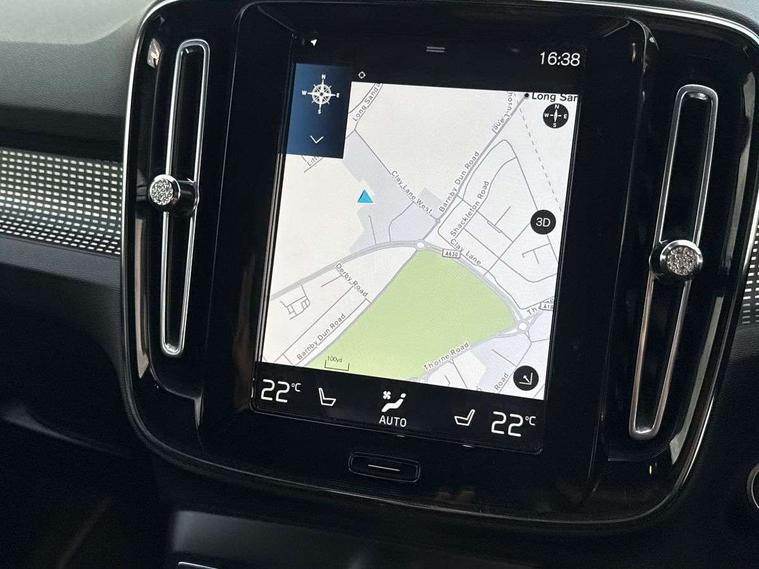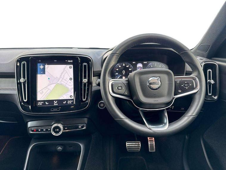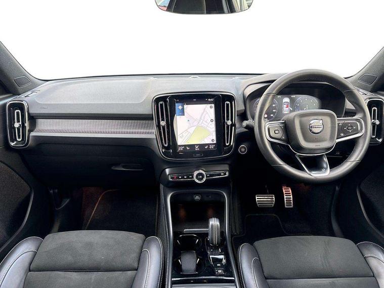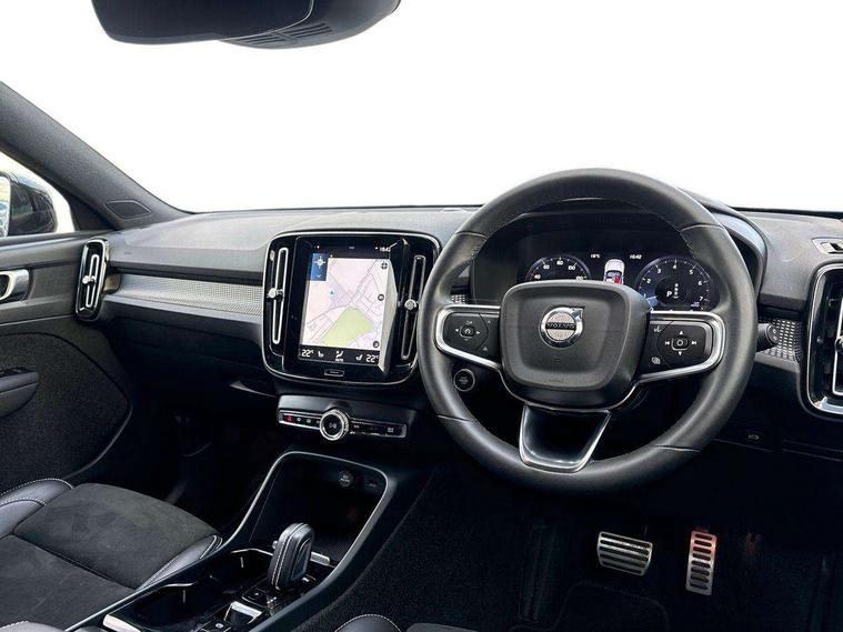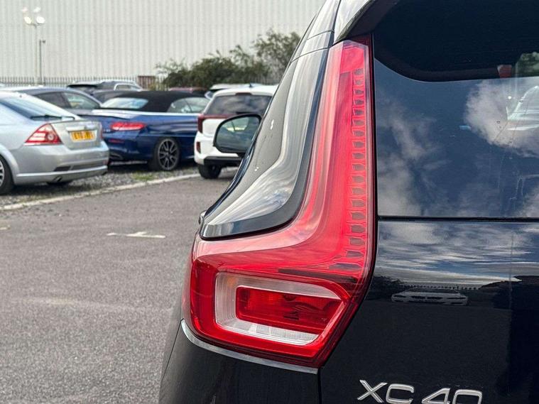 12.3" Active TFT crystal driver's instrument display, 9" centre console portrait touch screen, Adjustable steering wheel force, Bluetooth hands free telephone kit, Drive mode selector, E-call, Lane keep assist with driver alert control, Oncoming Lane Mitigation, Power operated tailgate, Sensus navigation with European mapping and traffic information, Speed limiter, Speed sensitive steering, Voice activated control for key functions, Volvo on call, Sports chassis, DAB Digital radio, Steering wheel mounted remote controls, Adaptive brake lights with high level LED brake lights, Auto dimming interior mirror, Automatic headlamp levelling, Automatic LED Headlights + Active high beam incorporating daytime running lights, Dark tinted windows for rear door side windows and cargo compartment, Electric adjustable/heated/auto folding door mirrors, Front aluminium tread plates, Front and rear electric windows, Heated front windscreen, High gloss black front and rear skid plate, High gloss black lower front bumper, High gloss black mesh front grille with high gloss black surround, High gloss black sensus surround deco, High gloss black window trim, Home safe and approach lighting, Integrated roof rails in high gloss black, Rain sensor with automatic windscreen wiper activation, Rear side wing doors, Rear wiper, Roof antenna, Roof spoiler, Visible VIN plate, 12V socket in front tunnel console and luggage compartment, 2 zone electronic climate control and rear air vent, 3 seat bench in 2nd row, 60/40 versatile split folding rear seat, A-pillar parking ticket holder, Bright metal luggage threshold, Centre console cupholders and storage, Charcoal headlining, Front footwell illumination, Front headrests, Front reading light and theatre lighting, Front seat cushion extensions, Front tunnel net pocket and integrated waste bin, Glovebox bag hook, Heated front seats, Height/reach adjustable steering column, Height/tilt adjustable driver's seat, High gloss centre tunnel deco, Illuminated glovebox, Illuminated luggage compartment, Illuminated vanity mirrors, Isofix attachments on outer rear seats, Leather gearknob, Load protection net, Multi directional lumbar support, Power driver seat with memory + exterior mirrors memory, Rear armrest / integral cup holders / storage tray, Rear coat hook, Single front passenger seat, Sports floor mats, Sports pedals, Sports tailored steering wheel, Underfloor cargo storage, Vanity mirror with ticket holder, Lighting pack - XC40, 3x3 point rear seatbelts, City safety includes pedestrian, cyclist and large animal detection and front collision warning with full auto brake, Drivers knee airbag, Dual stage driver/passenger airbags, Electronic parking brake with auto hold, First aid kit, Front and outer rear seatbelt reminder and pretensioners, Front seats SIPS airbags, Hill descent control, Hill start assist, Inflatable curtain, Passenger airbag cut-off device, Road sign information display, Run off Road Mitigation, Run off Road Protection, SIPS (Side Impact Protection System), Slippery road and hazard light alert, Stability and Traction Control with Spin control, Engine Drag Control and Corner Traction Control, Tyre pressure monitoring system, Vehicle deceleration control with Anti-lock Brake System, Electronic Brake Distribution and Emergency Brake Assist, Warning triangle, WHIPS whiplash protection system - front, Anti-theft alarm including immobiliser/volume sensor + level sensor, Care key with user defined top speed, Key integrated remote control central locking + fuel flap with deadlocking system and auto open/close power windows, Locking wheel nuts, Private locking for tailgate, Cutting edge aluminium inlay, Lower dashboard, tunnel console and door panel in charcoal,