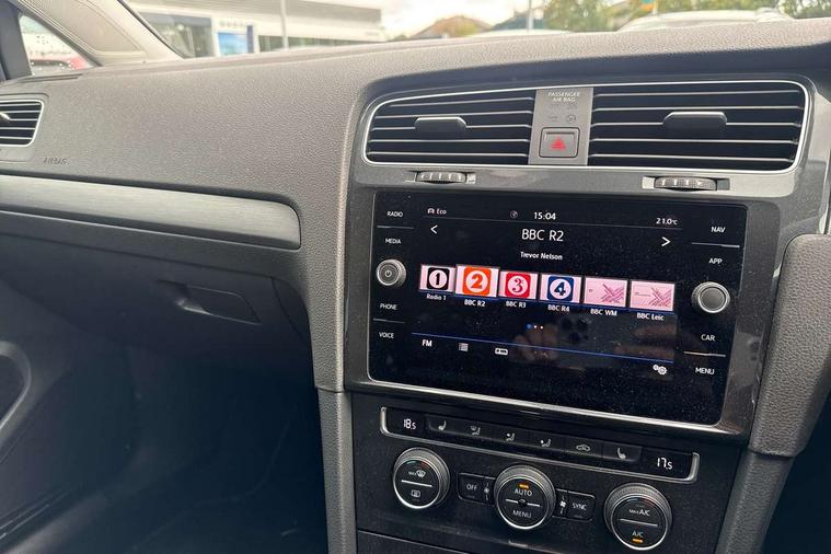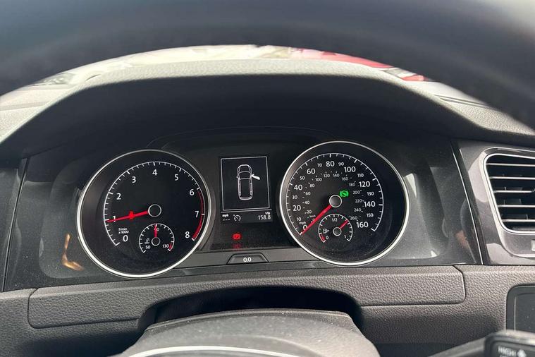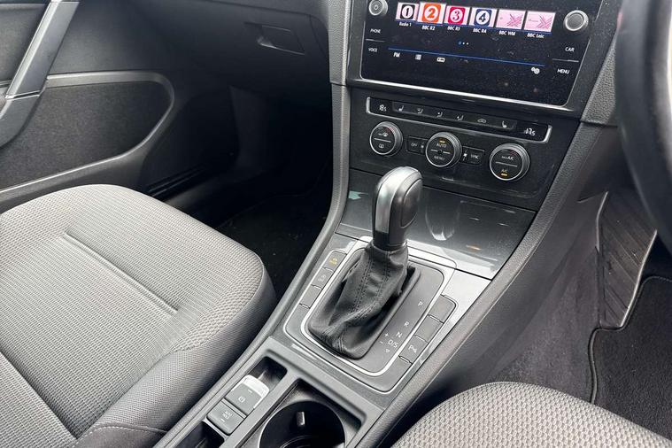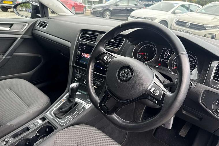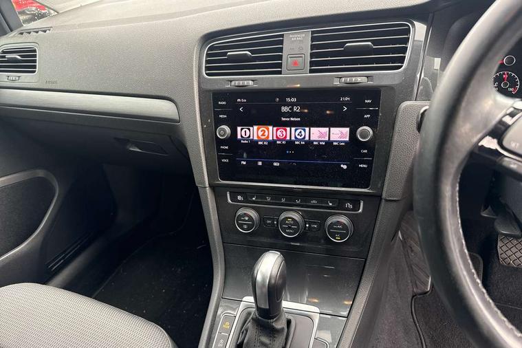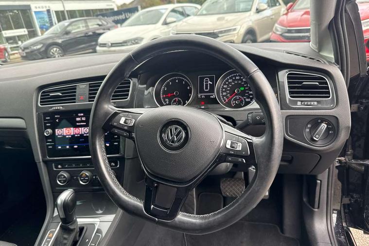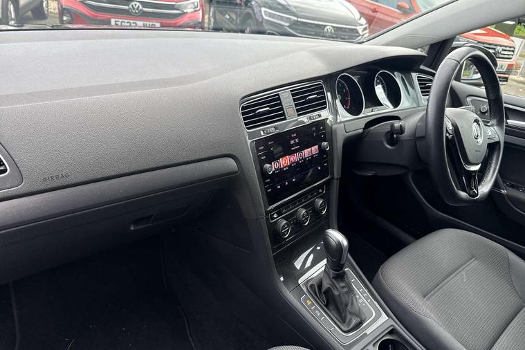 'Lights On' Reminder warning buzzer, ACC - Adaptive cruise control with front assist, forward collision warning, distance monitoring, city emergency brake and speed limiter, Bluetooth telephone and audio connection for compatible devices, Brake pad wear indicator warning light, Driver alert system, Driving Mode Selection with four preset modes - Eco, normal, sport or individual modes, Instrument cluster in white, Multifunction computer with visual gear change recommendation for fuel consumption, Power assisted speed sensitive electro-mechanical steering, Push tank flap, Speedo, rev counter, electronic odometer, trip, service interval display, exterior temperature and fuel gauge, Stop/start system, Think blue trainer driver tips and journey analysis, Warning buzzer and light for front seatbelts unfastened, We Connect Go Dongle, Battery regeneration during braking, XDS electronic differential lock, DAB Digital radio receiver, Driver Personalisation profile selection, MDI multi device interface, MP3/WMA compatability, Premium USB cable in choice of either Apple or Android smartphone compatibility, SD card slot, SMS Functionality, Title and cover art display, USB charging socket, Volkswagen media control, Automatic coming/leaving home lighting function, Black front air intake and radiator grille with chrome insert, Black rear diffuser, Black roof rails, Body colour bumpers, Body colour door handles, Body colour door mirrors with integrated indicators, Dusk sensor + automatic driving lights, Electrically adjustable and heated door mirrors, Front and rear electric windows, Fully galvanised body, Heated rear windscreen, Hidden exhaust pipe, High level 3rd brake light incorporating LED Technology, LED daytime running lights, LED front fog lights with static cornering light function, LED rear lights, LED rear number plate lights, Rain sensor and automatic dimming interior rear view mirror, Rear fog lamp, Rear tinted glass 65% light absorbing from B pillar backwards, Rear window aerial, Rear window wash/wipe with intermittent wipe, Reflectors in all doors, Tailgate with integrated rear roof spoiler, Windscreen wipers/ intermittent wipe + 4 position delay, 12V socket in luggage compartment, 3 rear headrests, 3 spoke steering wheel, 4 load lashing points in luggage compartment, 60/40 split folding rear seat backrest and flat folding into boot floor, Auto fold down lever in rear seat backrest, Bag hook in luggage compartment x 2, Black decorative sleeve on gear handles, Climate control - 2 zone electronic air conditioning with automatic air recirculation and allergy filter, Cooled glovebox, Cover for storage compartment in centre, Cupholder cover, Dust/pollen filter, Front and rear reading lights X 2, Front centre armrest with storage compartment and two rear air vents, Front seat back storage pockets, Grab handles front x 2, rear x 2 with integrated coat hooks, Height and reach adjustable steering wheel, Illuminated vanity mirrors, Instrument lighting white adjustable panel illumination, Interior light delay, Isofix preparation for 2 rear child seats, Load through provision with rear centre armrest and cupholders x2, Luggage compartment cover with stowable convenience opening, Luggage compartment lighting, Overhead storage box, Passenger underseat drawer, Pearl grey headlining, Storage box in luggage compartment, Storage compartment in roof console with cover, Storage compartments in front doors, Storage compartments in rear doors, Sun visors, Variable boot floor, height adjustable and removable, Convenience Pack - Golf, Mirror pack - Golf, Winter pack - Golf, 3 rear three point seatbelts, Airbags - Driver and rear passenger curtain, driver knee, front side impact, driver and passenger airbag with passenger deactivation switch, Anti-lock Braking System (ABS) with Hydraulic Brake Assist (HBA), Automatic post collision braking system, Child locks on rear doors, Driver/Passenger optimised head restraints, Electronic parking brake with auto hold, Electronic stability control (ESC) including Electronic differential lock (EDL) and ASR (Traction control) with deactivation via infotainment system, Front ventilated disc brakes and rear disc brakes, Pre crash preventive occupant protection, Predictive pedestrian protection, Three point height adjustable front seatbelts with tensioners, Tyre pressure loss indicator, Volkswagen roadside assistance, Alarm with interior protection and deactivation via infotainment system, Electronic engine immobiliser, Brushed dark silver decorative inserts in dash and door panels, Chrome plated air vent surround, Chrome-plated light switch surround, Polar night black decorative inserts in centre console, Full size wheel trims, Steel space saver spare wheel,