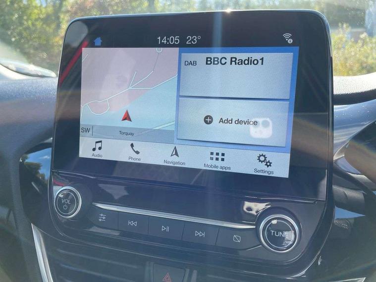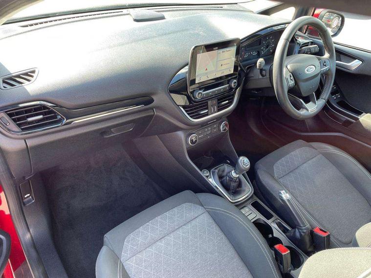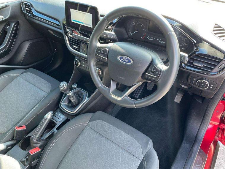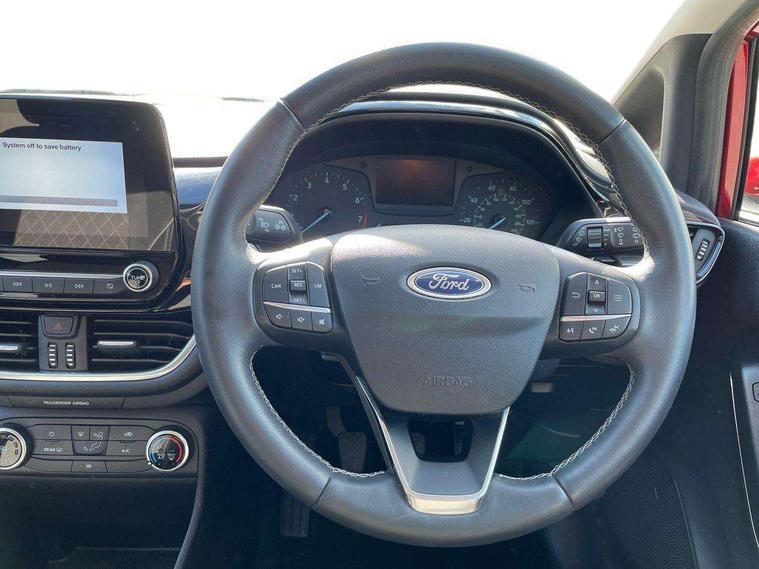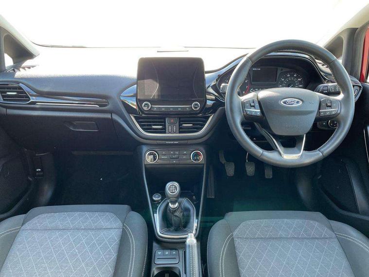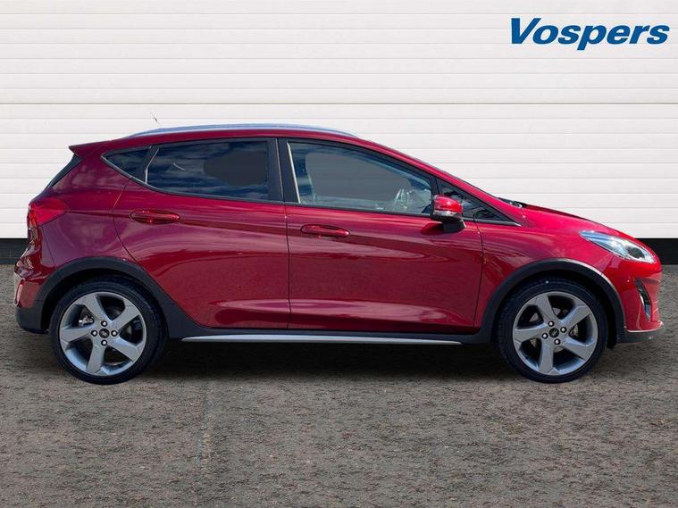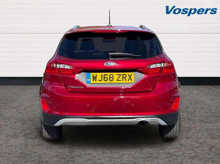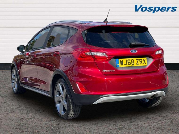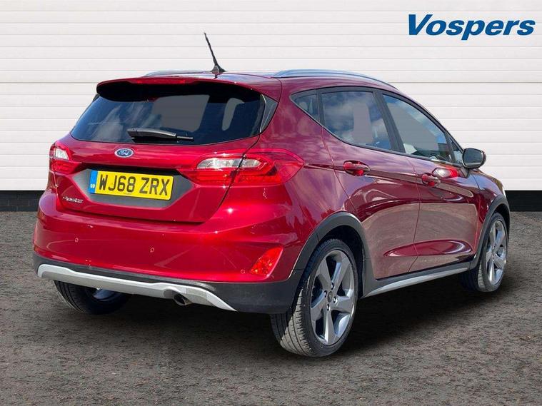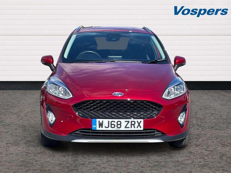Bluetooth system, Drive mode selector, Electric power steering, Ford easy fuel, Trip computer, Rough road suspension with increased ride height adjust, Auxiliary input socket, Steering wheel mounted controls, USB connection, Active logo front door thershold plates, Automatic headlights, Body colour bumpers, Body colour door handles, Body colour electric adjustable heated door mirrors with integral indicators, Body colour rear spoiler, Chrome beltline trim, Chrome lower window surround, Cornering front fog lights, Electric front windows/one touch facility, Electric rear windows, LED Night signature to rear lights, LED rear lights, Quickclear heated windscreen, Rear privacy glass, Rear wiper, Rugged body styling kit with active front wing badges, Tinted glass, Upper front grille chrome surround, 12V Accessory socket in centre console, 3 spoke leather trimmed steering wheel with audio control, 60/40 split folding rear seat, Adjustable head restraints, Ambient lighting, Boot carpet, Chrome inner door handles, Cloth upholstery, Driver's lumbar support, Footwell illumination, Front floor mats, Front map reading lights, Front seat and rear pockets, Height adjustable driver's seat, Illuminated glovebox, Leather gear knob, Leather trimmed handbrake handle, Load area light, Luxury woven headliner, Manual air conditioning, Overhead console with sunglasses holder, Pollen filter, Rake/reach adjustable steering wheel, Rear centre head restraint, NCAP Pack - Fiesta, 3 point seatbelts on all rear seats, ABS+EBA, Curtain airbags, Driver and passenger airbags, Drivers knee airbag, Electronic stability control with hill start assist, Front passenger airbag deactivation, Front side airbags, Seatbelt warning, Tyre pressure monitoring system, MyKey system, Remote central locking & engine immobiliser, Thatcham Cat.1 alarm, 17" 5 spoke alloy wheels with rough metal machined finish,