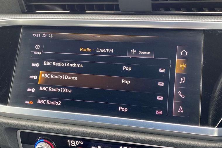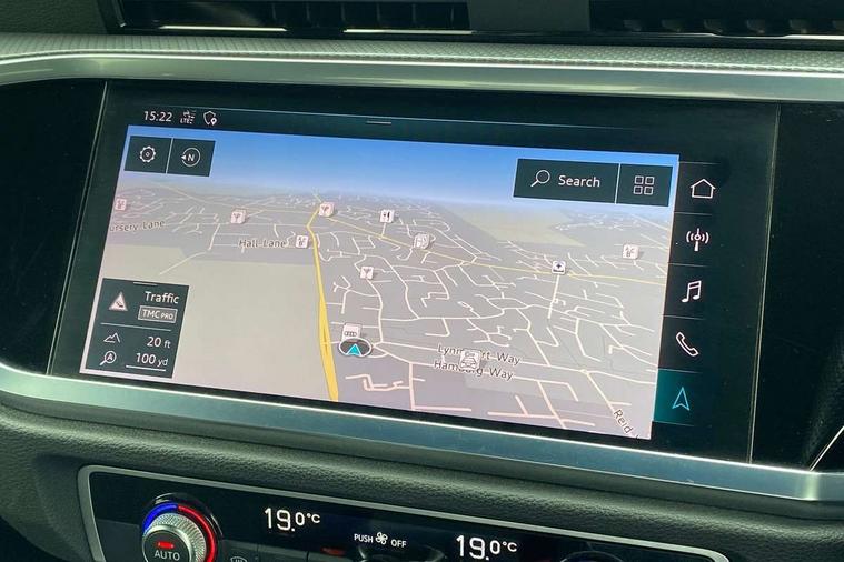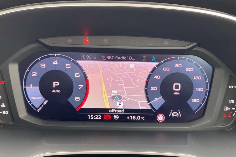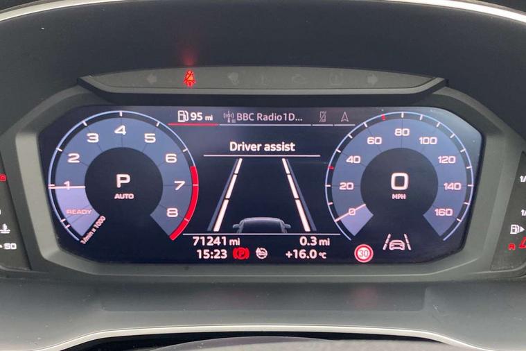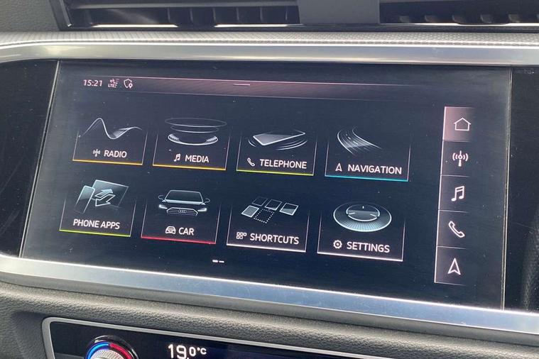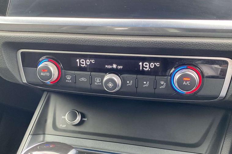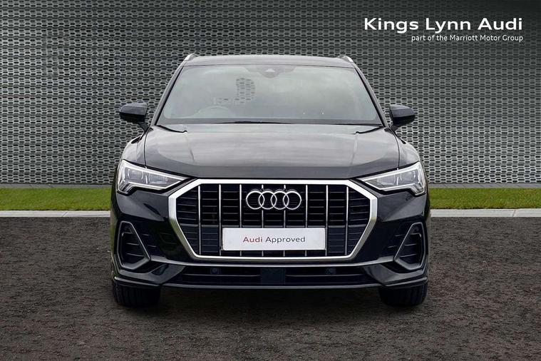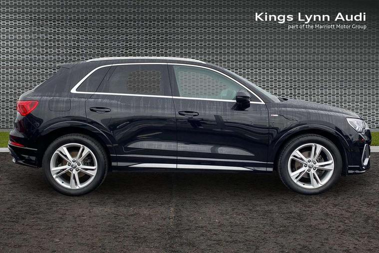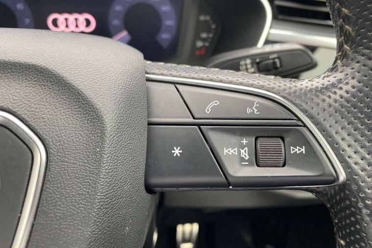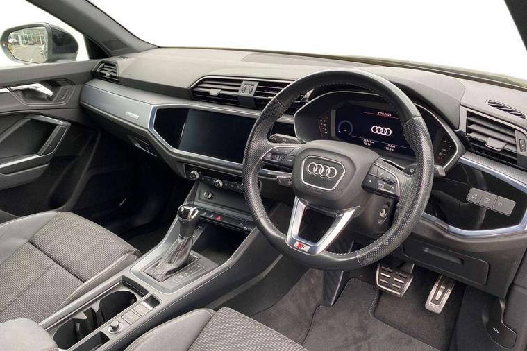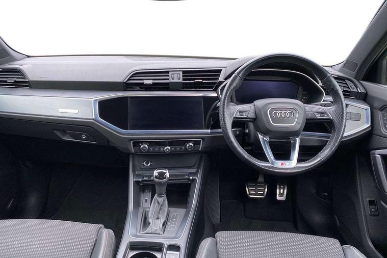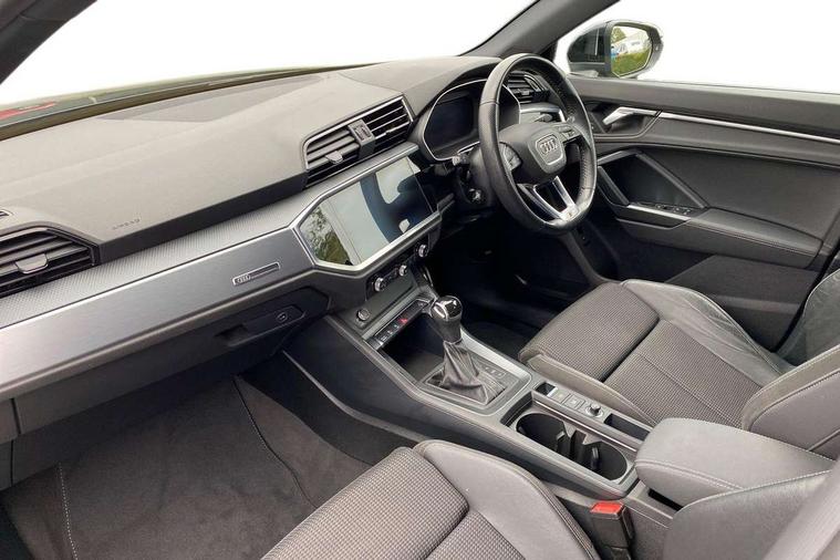Audi connect safety and service (e-call), Audi drive select, Audi lane departure warning, Audi side assist, Audi Virtual Cockpit - 10.25" display, Bluetooth interface, Camera based traffic sign recognition, MMI Navigation Plus with high resolution 10.1 inch touchscreen colour display, Power operated tailgate, Progressive steering, Service interval indicator, Smartphone interface includes wireless Apple carplay/Android Auto, Start stop system with recuperation, Voice control system with natural language interaction, 48V Mild hybrid technology, Sports suspension, 1 x USB type C and 1 USB type A charging points, 6 passive loudspeakers, DAB digital radio module, Acoustic windscreen, Aluminium roof rails, Aluminium window trim, Auto dimming frameless rear view mirror, Body coloured bumpers, Electrically folding, adjustable and heated door mirrors with integrated LED side indicators and kerb view function for passenger side, Front and rear electric windows, Front fog lights, Front side air inlets in matt platinum grey, Front spoiler blade in matt platinum grey, Grille vertical bars in aluminium silver/Matt, High gloss black finish B and C pillars, LED headlights with LED daytime running lights and dynamic rear indicator, LED rear lights, Privacy glass dark tinted rear and rear-side windows (from B-pillar backwards), Rain and light sensors, Rear diffuser strip in matt titanium black, S line badges on front wings, S Line front and rear bumpers, Side skirt insert in matt Platinium grey, Silver chrome grille surround, Titanium black radiator grille, 12V socket in rear centre console, 40:20:40 folding with manual adjustment for 60:40 forwards/backwards position and backrest angle, Adjustable rear seat bench/backrest with centre armrest and cupholder, Black cloth headlining, Dual zone electronic climate control, Front and rear black floor mats with contrast stitching in rock grey, Front and rear headrests, Front and rear roof module including reading lights, Front centre armrest, Glove compartment lighting, Height and reach adjustable steering wheel, Illuminated door sill trims with S logo, ISOFIX child seat mounting for front passenger with airbag deactivation and outer rear seat including top tether attachment point for outer rear seats, Luggage compartment light, Manual front seats with height adjustment, Perforated leather gearknob, Stainless steel luggage compartment sill finisher, Stainless steel pedals, Non smoking pack - Q3, 3x3 point rear seatbelts, 6 airbags - Driver, front passenger, curtain and side windows, Audi pre-sense front with pedestrain and cyclist recognition, Electrically operated child locks on rear doors, Electromechanical parking brake, Electronic stabilisation control including ABS, ASR and EDL, Hill descent control, Hill hold assist, Pre sense basic, Seatbelt monitoring, Tyre pressure warning, Warning triangle and first aid kit, Anti theft alarm, Anti theft wheel bolts, Remote central locking, Dark matt brushed aluminium inlay, Detail dashboard around MMI touch colour display in glass look, black with surround in aluminium look, Leatherette door armrest, Tool kit, Tyre repair kit,
