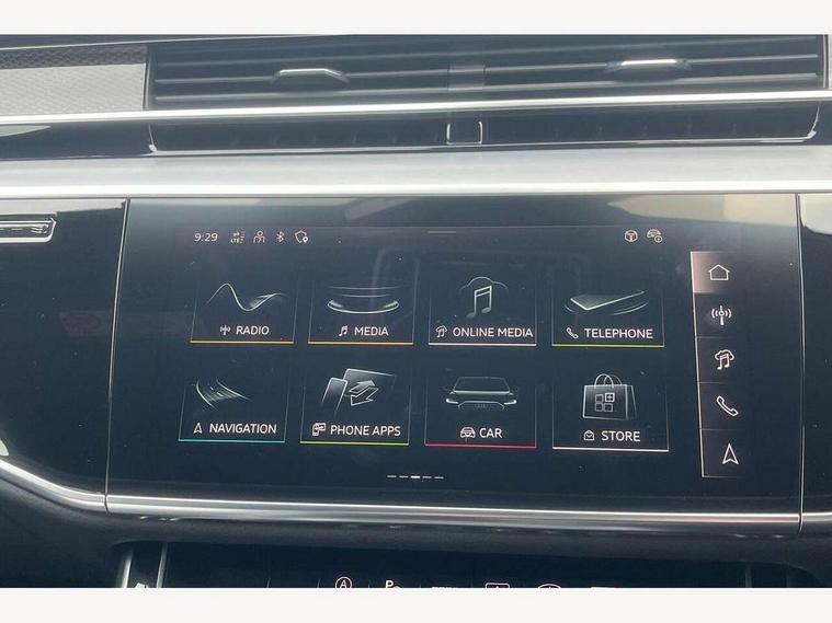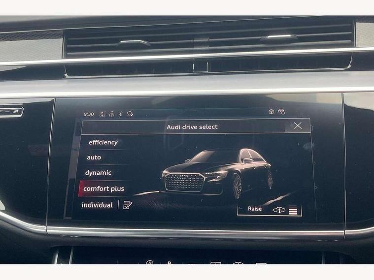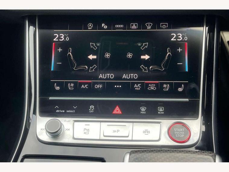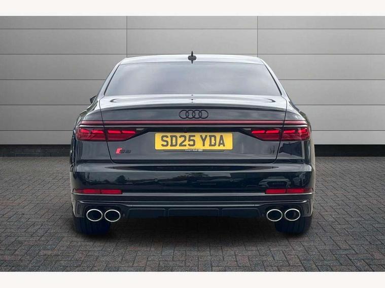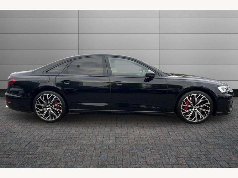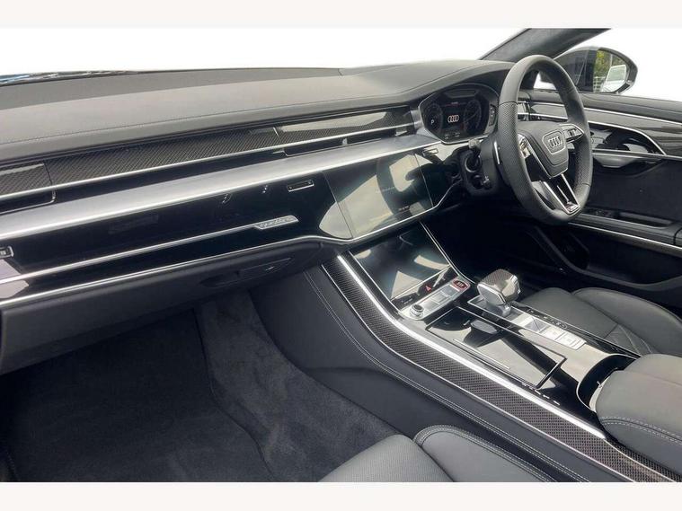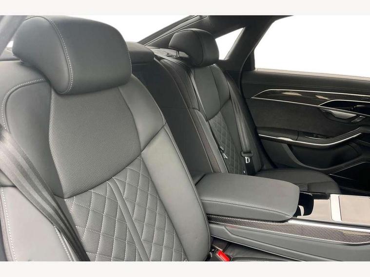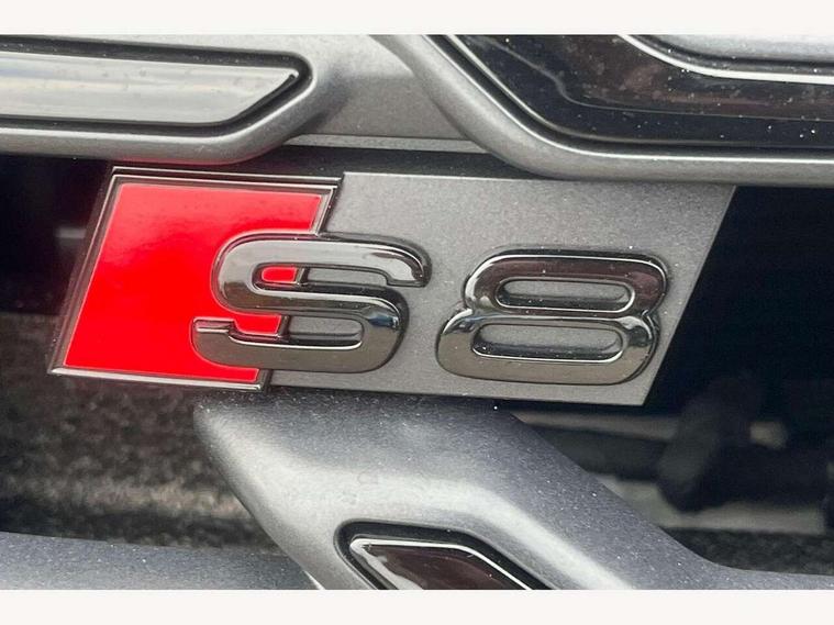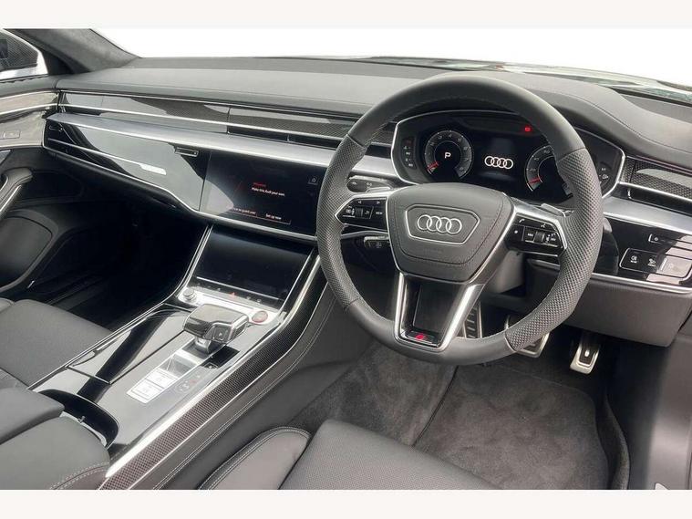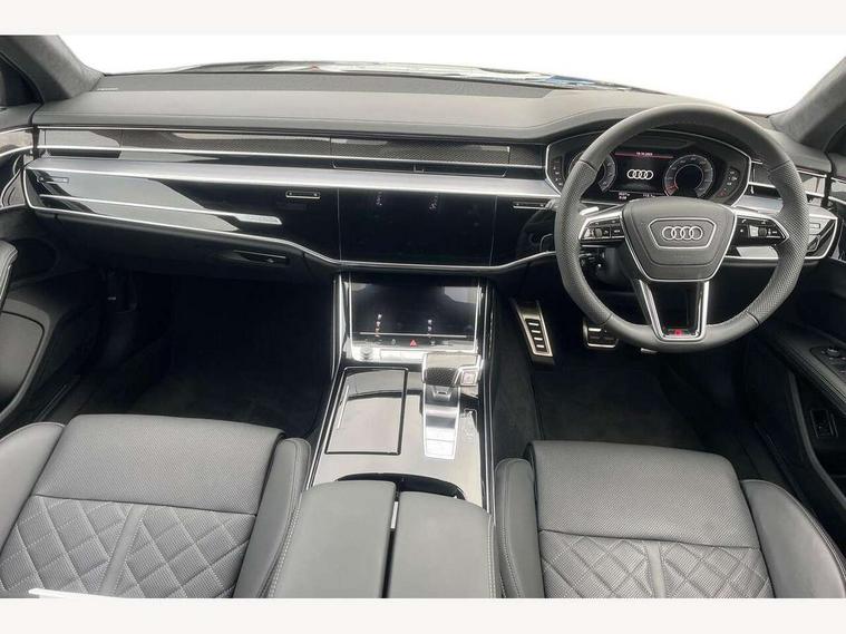 'Lights On' Reminder warning buzzer, 360 degree camera with top view, Active noise cancellation, Adaptive cruise control with cruise assist, emergency assist, efficiency assist, swerve assist, turn assist and speed limiter, Audi connect safety and service (e-call), Audi drive select, Audi smartphone interface with app store includes wireless Apple carplay, Android auto and Amazon alexa integration, Audi virtual cockpit plus, Bluetooth interface, Camera based traffic sign recognition, Convenience key, Crossing assist, Dynamic all wheel steering, Head up Display, MMI navigation plus with MMI touch + Twin touch screens with haptic feedback, Operating buttons in black, glass look with haptic feedback including extended aluminium look, Parking assist plus with remote parking, Power door closure, Power operated tailgate, Remote fuel filler release, Service interval indicator, 48V Mild hybrid technology, 8 speed transmission with hill hold assist, 82 litre fuel tank, Predictive active suspension, Quattro all wheel drive with sport differential, Audi music interface, DAB digital radio module, MMI radio plus, USB connection, Acoustic double glazing, Adaptive windscreen wipers with integrated washer jets, All-weather, manoeuvring, position, static cornering, turning and motorway lights with automatic dynamic headlight range control, Audi high beam assist with Vorsprung illuminated text, Audi space frame, Auto dimming rear view mirror, Body colour bumpers, Body colour door handles, Carbon exterior mirror housings, Digital matrix LED headlights with lane light, direction indicator, extended traffic information and extended light sequencing, Dynamic front and rear indicators, e-tron signature in DRL and dipped beam, Electric front windows, Electric rear windows with isolation switch, Electric sunblinds for rear window and rear door windows, Electrically adjustable heated folding + automatically dimming exterior mirrors with memory function and integrated LED indicators, Headlight cleaning system, Heat insulating darkened glass in side and rear windows, Heat insulating glass windscreen, Heated rear window, Heated windscreen washer jets, LED brake lights, LED daytime running lights, LED third brake light, OLED rear lights with changeable rear light signature, Privacy glass, Rear boot, Rear side wing doors, Welcome/leaving lighting, 12V socket, 3 seat rear bench with centre armrest in 2nd row, 4 way electric lumbar support for driver and front passenger, Audi phone box light, Black dinamica microfiber headlining, Carbon gear selector, Centre console with cupholders, Comfort centre armrest, Door pockets with bottle holder, Driver and front passenger side sunvisors with illuminated vanity mirrors, Dust/pollen filters, Electric front seats with memory function, Front floor mats, Glove compartment cooling, Height/reach electric steering column with easy exit function, Illuminated door sill trims with aluminium inlays and S diamond emblem, Isofix child seat mounting points on outer rear seats, Leather gearknob, Matrix LED reading lights, Passenger footwell storage net, Rear floor mats, Rear headrests, Roof mounted sunglasses holder, Single front passenger seat, Stainless steel pedals and footrest, Valcona leather upholstery with front sports seats in diamond quilted with S embossed logo, Air quality Pack - A8, Black exterior styling pack - A8, City assist pack - A8, Extended leather pack - A8, Extended LED Interior multi coloured light pack - A8, Exterior style pack - S8, Technology pro pack - S8, 3 point seatbelts on all rear seats, ABS/EBD, Active front headrest system, ASR traction control, Audi pre sense basic, Audi pre sense front, Driver/Front Passenger airbags, EDL traction control, Electromechanical parking brake, ESP, Extended pedestrian protection measures, Front and rear disc brakes, Front and rear side airbags with head airbag system, Front passenger airbag deactivation, Rear child proof door locks, Seatbelt reminder + electric contact in buckle + advanced safety equipment, Tyre pressure loss indicator, Warning triangle and first aid kit, Anti theft alarm tow away protection, Anti-theft wheel bolts and wheel loosening detection, Remote central locking, Carbon vector upper inlays, Dark matt brushed aluminium lower inlays, Tyre repair kit,