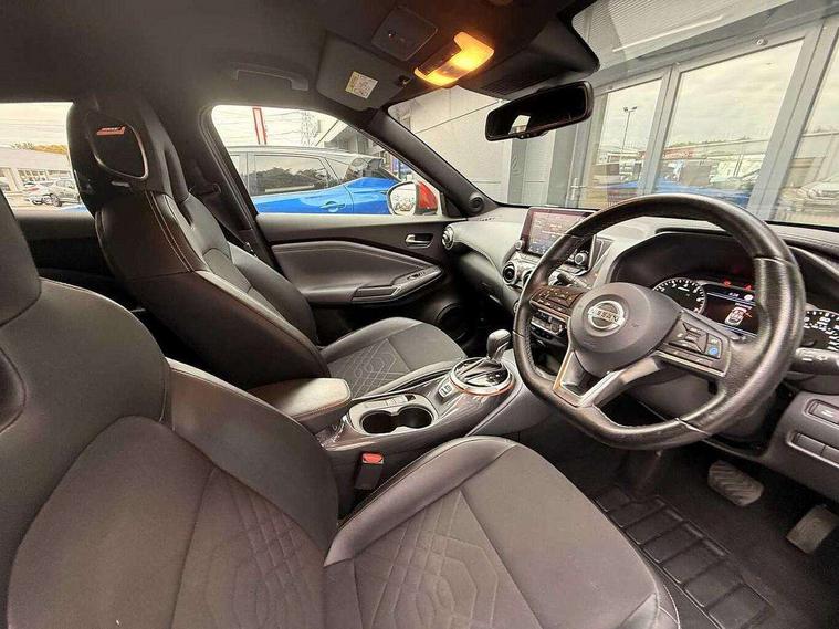 7" full colour TFT screen combimeter, 8" infotainment colour display with touch screen, Apple CarPlay and Google Android auto, Drive modes select (Eco, normal and sport), Emergency and breakdown call, Front parking sensor, Idle start/stop system, Intelligent lane intervention, Lane departure warning system, Nissan connect nav with TomTom traffic, Nissan connect services and Wifi connection, Outside temperature sensor, Power Steering, Rear parking sensor, Traffic sign recognition, Trip computer, Gasoline particulate filter, Bluetooth system, USB, Aux-in and 12V socket, Bose personal plus audio system with 8 speakers(4 speakers and 2 headrest speaker for driver and passenger seats), Bose personal sound stage control, DAB Digital radio, Rear console USB port, Auto dimming interior rear view mirror, Automatic hazard signal with emergency stop signal, Body colour bumpers, Body colour door handles, Electrically adjustable door mirrors with integrated indicators, Follow me home headlights, Front and rear electric window with one touch driver and passenger window, Heated and auto folding door mirrors, High beam assist, LED daytime running lights, LED front fog lights, LED headlamps, LED rear fog lamp, LED rear lamps, Rain sensor windscreen wipers, Rear privacy glass, Rear spoiler, Rear wiper, Thermaclear heated windscreen, Three blink turn signal, 3 height adjustable rear headrests, 60/40 split folding rear seat, Automatic climate control, Card holder on driver sunvisor, Cloth/Synthetic leather upholstery, Door ambient lighting, Driver and passenger sliding and reclining seats, Driver seat back pocket, Driver side rear coat hanger, Driver/passenger sunvisors and illuminated vanity mirrors, Front and rear cabin lights, Front armrest, Front door pockets with bottle holders, Front head restraints, Front passenger isofix child seat anchorage point, Front/rear passenger grab handles, Gear console ambient circle lighting, Grey synthetic leather kneepad, Heated front seats, Height adjustable driver's seat, Height adjustable passenger seat, Internal chrome door handles, Leather gearshift knob, Leather steering wheel, Luggage board, Luggage space lighting, Monoform sporty seats, Multifunction steering wheel, Passenger seat back pocket, Rear door bottle holders, Steering wheel mounted gearshift paddles, Telescopic steering wheel adjustment, Two cupholders in front centre console, Two rear isofix child seat anchorage points with top tether, Voice recognition switch on steering wheel, Welcome light and console tray ambient lighting, ProPilot pack - Juke, ABS with EBD and brake assist, Active ride control, Active Trace Control, Driver and passenger airbags, Driver and passenger side airbags, Electric handbrake with auto hold function, Electronic Stability Programme (ESP), Front and rear curtain airbags, Height adjustable seatbelts, Hill start assist, Intelligent emergency braking with pedestrian and cyclist recognition, Seatbelt reminder for driver/front passenger and rear seats, Single tone horn, Three 3 point rear seatbelts, Traction control, Tyre pressure monitoring system, VDC Dynamic Vehicle Control, Ventilated rear brake discs, Alarm, Immobiliser, Intelligent Key with push button starter, Remote central locking,