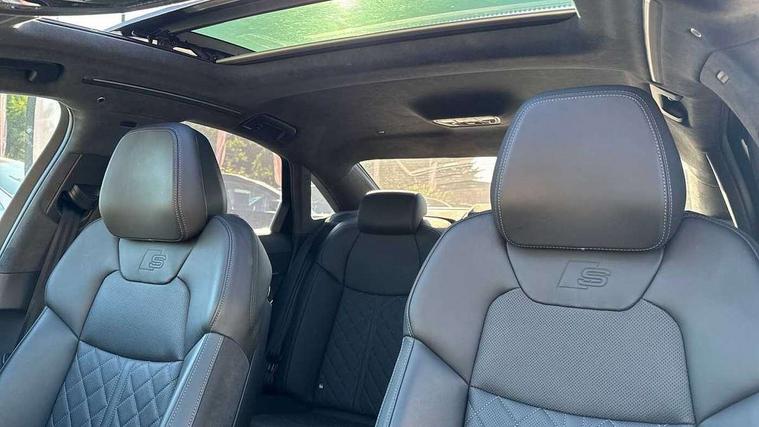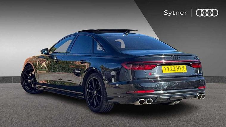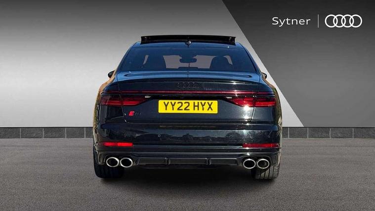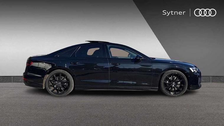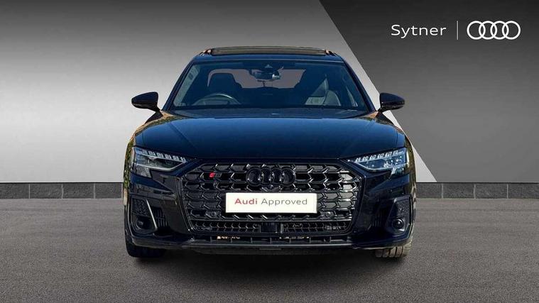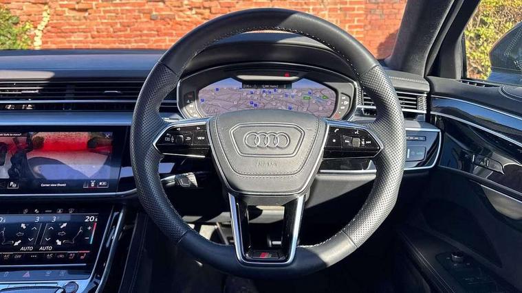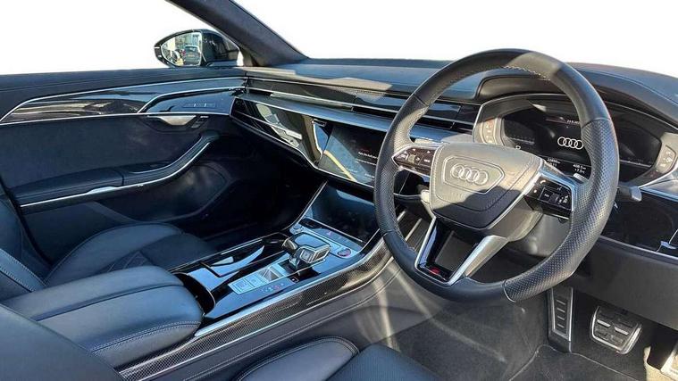 'Lights On' Reminder warning buzzer, 360 degree camera with top view, Active noise cancellation, Adaptive cruise control with cruise assist, emergency assist, efficiency assist, swerve assist, turn assist and speed limiter, Audi connect safety and service (e-call), Audi drive select, Audi phone box with wireless charging, Audi virtual cockpit plus, Audi wireless smartphone interface, Bluetooth interface, Camera based traffic sign recognition, Convenience key, Dynamic all wheel steering, Head up Display, MMI navigation plus with MMI touch + Twin touch screens with haptic feedback, Operating buttons in black, glass look with haptic feedback including extended aluminium look, Parking assist plus with remote parking, Power door closure, Power operated tailgate, Rear central control unit, Remote fuel filler release, Service interval indicator, 48V Mild hybrid technology, 8 speed transmission with hill hold assist, 82 litre fuel tank, Predictive active suspension, Quattro all wheel drive with sport differential, Audi music interface, DAB digital radio module, DVD System, MMI radio plus, USB connection, USB ports with charging function in the rear, Acoustic double glazing, Adaptive windscreen wipers with integrated washer jets, Audi Beam with Vorsprung illuminated text, Audi space frame, Auto dimming rear view mirror, Body colour bumpers, Body colour door handles, Body colour side protection with aluminium trim strips, Digital matrix LED headlights with highbeam assist, static cornering light, all weather lights, automatic dynamic headlight range control, Dynamic front and rear indicators, Electric front windows, Electric rear windows with isolation switch, Electrically adjustable heated folding + automatically dimming exterior mirrors with memory function and integrated LED indicators, Headlight cleaning system, Heat insulating glass in side and rear windows, Heat insulating glass windscreen, Heated rear window, Heated windscreen washer jets, LED brake lights, LED daytime running lights, OLED rear lights with specific rear light signature 2, Panoramic sunroof, Privacy glass, Rear boot, Rear side wing doors, Side skirts, Third brake light, 12V socket, 3 seat rear bench with centre armrest in 2nd row, 4 way electric lumbar support for driver and front passenger, 4 zone control automatic air conditioning, Carbon gear selector, Centre console with cupholders, Comfort centre armrest, Door armrest with storage, Door pockets with bottle holder, Driver and front passenger side sunvisors with illuminated vanity mirrors, Dust/pollen filters, Electric front seats with memory function, Electric sunblinds for rear window and rear door windows, Front floor mats, Glove compartment cooling, Heated front seats, Heated rear seats, Height/reach electric steering column with easy exit function, Illuminated door sill trims with aluminium inlays and S diamond emblem, Isofix child seat mounting points on outer rear seats, Leather gearknob, Massage and ventilation function for front seats, Matrix reading lights, Passenger footwell storage net, Rear floor mats, Rear headrests, Roof mounted sunglasses holder, Single front passenger seat, Stainless steel pedals and footrest, Valcona leather upholstery with front sports seats in diamond quilted with S embossed logo, Air quality Pack - A8, Black exterior styling pack - A8, City assist pack - A8, Extended leather pack - A8, Extended LED Interior multi coloured light pack - A8, Exterior style pack - S8, 3 point seatbelts on all rear seats, ABS/EBD, Active front headrest system, ASR traction control, Audi pre sense basic, Audi pre sense front, Driver/Front Passenger airbags, EDL traction control, Electromechanical parking brake, ESP, Extended pedestrian protection measures, Front and rear disc brakes, Front and rear side airbags with head airbag system, Front passenger airbag deactivation, Rear child proof door locks, Seatbelt reminder + electric contact in buckle + advanced safety equipment, Tyre pressure loss indicator, Warning triangle and first aid kit, Anti theft alarm tow away protection, Anti-theft wheel bolts and wheel loosening detection, Remote central locking, Carbon vector upper inlays, Dark matt brushed aluminium lower inlays, Tyre repair kit,