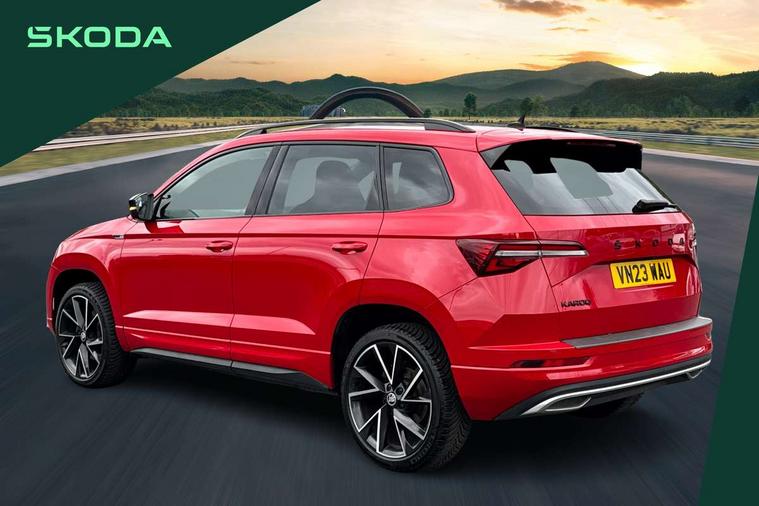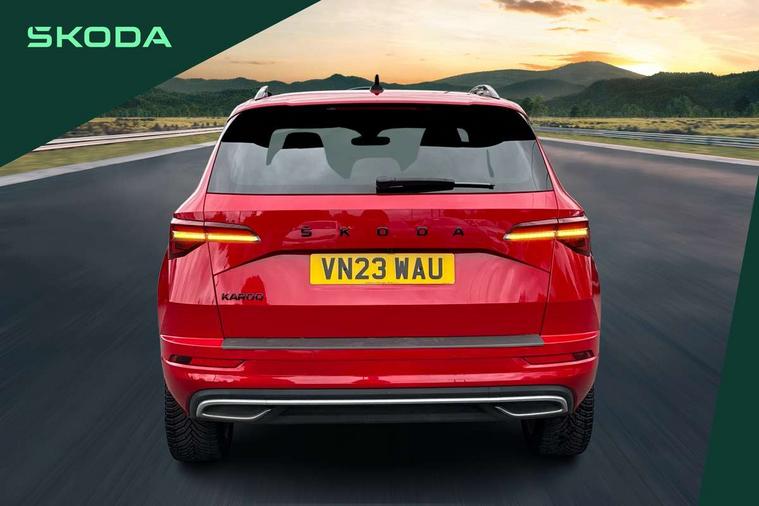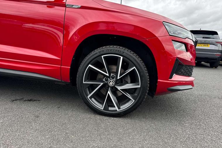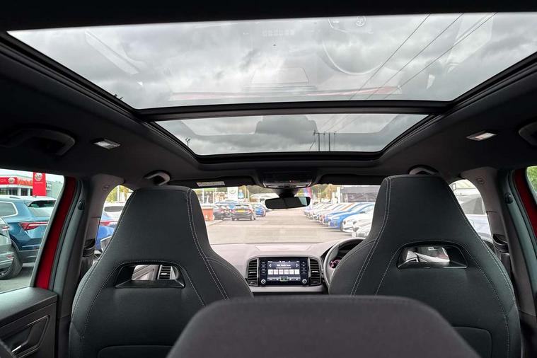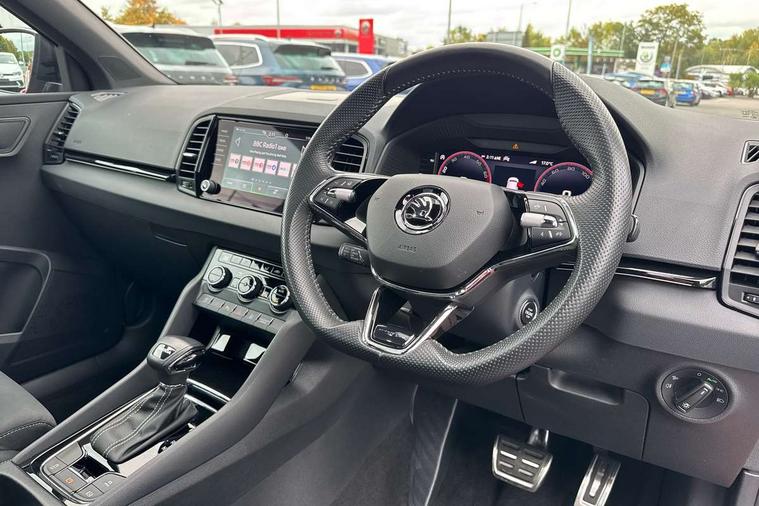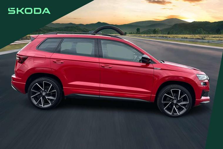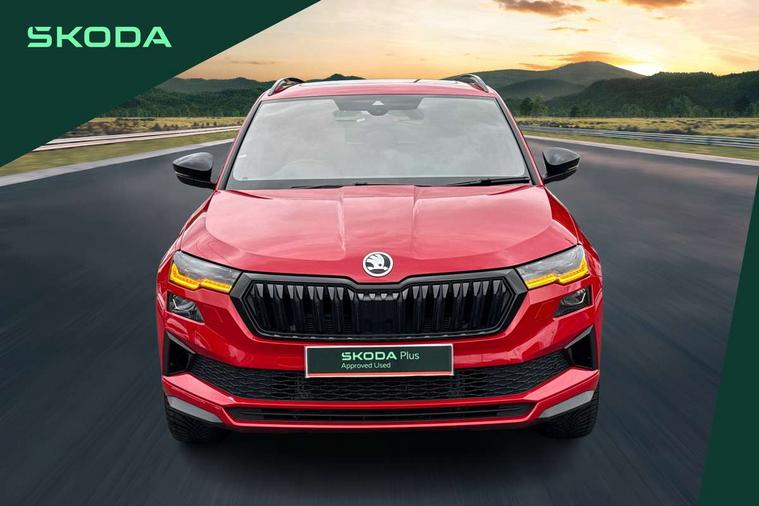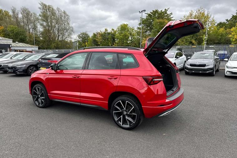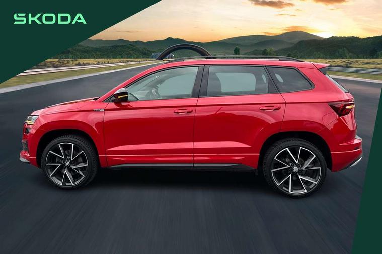 8" Digital display, Care connect, Driver fatigue sensor, Emergency services call system, Outside temperature gauge, Service interval indicator, SmartLink wireless for Apple and wired for Android, Start/stop system with regenerative braking, USB C Port x 2 in front centre console, Virtual cockpit, Virtual pedal with electrically operated boot door, 8 Speakers, DAB radio with Bluetooth, USB connection, Wireless charging without wireless aerial connection, Acoustic glass, Aero front windscreen wipers with intermittent function, Auto dimming rear view mirror with light and rain sensors, Black door mirrors, Black electric window control buttons, Black radiator grille, Black roof rails, Body colour door handles, Dynamic headlight range control with cornering light function, Electric front and rear windows with child proof lock, Front door steps with SportLine logo, Heated rear windscreen, LED daytime running lights, LED rear lights with high functionality welcome effect and dynamic indicators, Light assistant (coming/leaving home/tunnel light), Panoramic sliding sunroof, Plastic scuff plates, Privacy glass, Protective door side sills in body colour, Rear diffuser, Rear side wing doors, Rear spoiler, Rear window wiper with washer system and intermittent control, Safety reflectors on front doors, Skoda lettering on tailgate in black, Sportline badge on front fender, Sportline decorative inserts with badging, Sports front and rear bumpers, 1.5 litre bottle holders in driver and front passenger door panels, 12V socket in boot, 12v socket in front centre armrest with storage compartment and rear air vents, 3 rear height adjustable headrests, 3 seat bench in 2nd row, 3 spoke leather sports multifunction steering wheel and silver stitching with gear shift paddles, 4 foldable roof handles with rear coat hooks, Black floor carpet, Black roof headlining, Chrome inner door handles, Double sided boot floor, Foldable hooks in the boot, Front head restraints, Height adjustable front three point seats belts with tensioners, Height/reach adjust steering wheel, Ice scraper, Illuminated glovebox, Illuminated luggage compartment, Isofix child seat preparation outer rear, Manual lumbar support for front seats, Pen holder, Pollen filter, Rear boot cover, Rear reading lights, Rear seats fixed folding and divided 60:40, Rubbish bin door, Safety vest holder, Single front passenger seat, Storage box in upper central dashboard closed, Sunvisors with illuminated vanity mirrors, Textile floor mats, Ticket holder, Titan black interior ceiling, Welcome animation with sportline logo, Boot pack - Karoq, Light Pack - Karoq, Parking pack - Karoq, Automatic door unlocking in case of crash, Automatic fuel cut off in case of crash, Child locks on rear doors, Driver airbag, Electronic parking brake with auto hold function, Emergency rear braking signal, ESC including ABS, MSR, ASR, EDS, HBA, DSR, RBS, MKB and traction control, Front side airbags, Hill hold control, Knee airbags, Passenger airbag with switch-off function, Pedestrian monitor, Seatbelt reminder signalisation and pretensioner for all seats, Three point seatbelts rear, Two tone horn, Tyre pressure display, Tyre pressure monitor, Alarm with interior monitoring, back up horn and tilt sensor with safe function, Electronic engine immobiliser, Keyless entry and start/stop, Remote central locking with 2 remote folding keys, Black air vent surround, Black centre console, Satin black dashboard, Satin black door trim, 19" Vega black polished alloy wheels, Anti-theft wheel bolts protection, Matt black aero hub caps, Storage on wheel cover, Tool kit,
