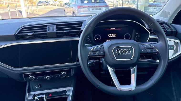 Audi drive select, Audi lane departure warning, Audi Virtual Cockpit - 10.25" display, Bluetooth interface, Camera based traffic sign recognition, Legal emergency call, MMI Navigation Plus with high resolution 10.1 inch touchscreen colour display, Power operated tailgate, Progressive steering, Service interval indicator, Smartphone interface includes wireless Apple carplay/Android Auto, Start stop system with recuperation, Voice control system with natural language interaction, Sports suspension, 2 USB-C ports with charge and data functions, 6 passive loudspeakers, DAB digital radio module, Acoustic windscreen, Aluminium window trim, Auto dimming frameless rear view mirror, Bumpers and underbody protection in contrasting manhattan grey paint finish, Diffuser grille in grained matt black, Diffuser trim in manhattan grey metallic, Door sill trims with illuminated aluminium inlay, Electrically folding, adjustable and heated door mirrors with integrated LED side indicators and kerb view function for passenger side, Front and rear electric windows, Front fog lights, Front side air inlets in Manhattan grey metallic, Grille surround in aluminium silver matt, High gloss black finish B and C pillars, Honeycomb design radiator grille in matt titanium black, LED Dynamic rear indicators, LED headlights with LED daytime running lights, LED rear lights, LED third brake light, Rain and light sensors, Rear side wing doors, Rear wiper, Variable front intermittent wipers, 12V socket in rear centre console, 3 seat bench in 2nd row, 3 spoke multi-function leather steering wheel, 40:20:40 folding with manual adjustment for 60:40 forwards/backwards position and backrest angle, Dual zone electronic climate control, Front and rear floor mats, Front and rear headrests, Front and rear roof module including reading lights, Front centre armrest, Glove compartment lighting, Height and reach adjustable steering wheel, ISOFIX child seat mounting for front passenger with airbag deactivation and outer rear seat including top tether attachment point for outer rear seats, Luggage compartment light right in white, Luggage compartment sill protection in stainless steel, Lunar silver cloth headlining, Manual front seats with height adjustment, Single front passenger seat, Non smoking pack - Q3, 3x3 point rear seatbelts, 6 airbags - Driver, front passenger, curtain and side windows, Audi pre-sense front with pedestrain and cyclist recognition, Electrically operated child locks on rear doors, Electromechanical parking brake, Electronic stabilisation control including ABS, ASR and EDL, Front seatbelt reminder, Hill descent control, Hill hold assist, Pre sense basic, Seatbelt monitoring, Tyre pressure warning, Warning triangle and first aid kit, Anti theft alarm, Anti theft wheel bolts, Immobiliser, Remote central locking, Black dashboard, Detail dashboard around MMI touch colour display in glass look, black with surround in aluminium look, Micrometallic silver inlay,