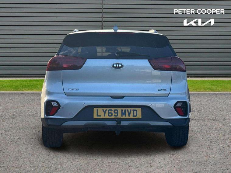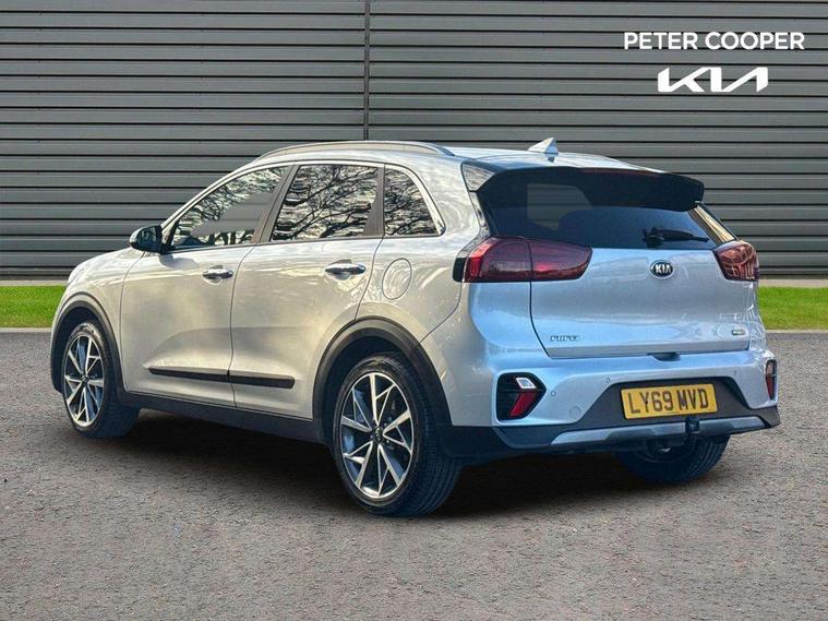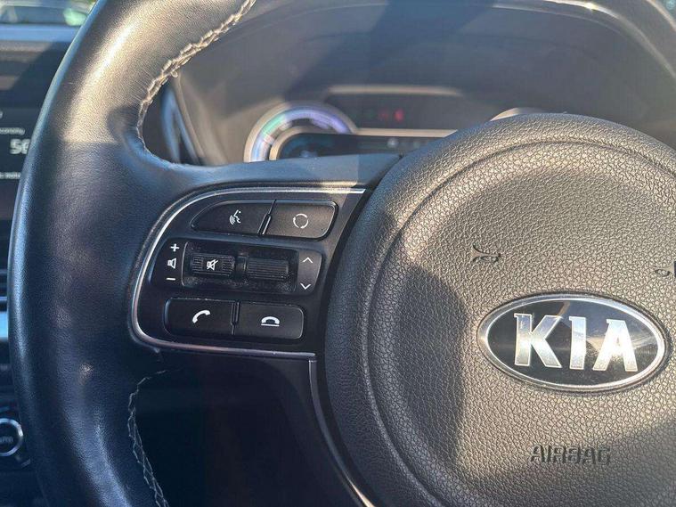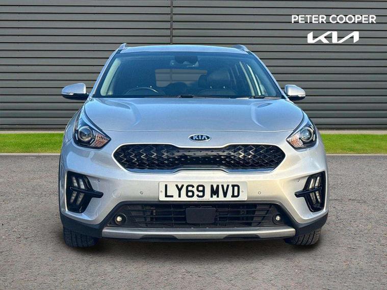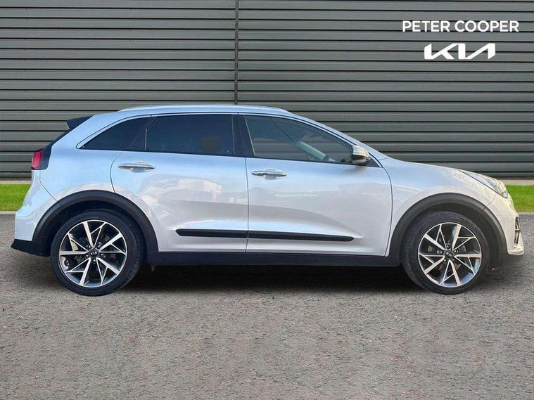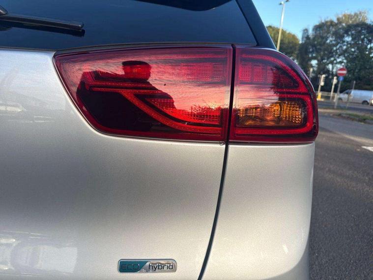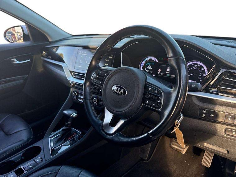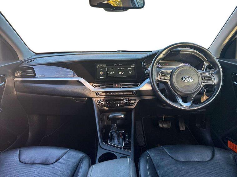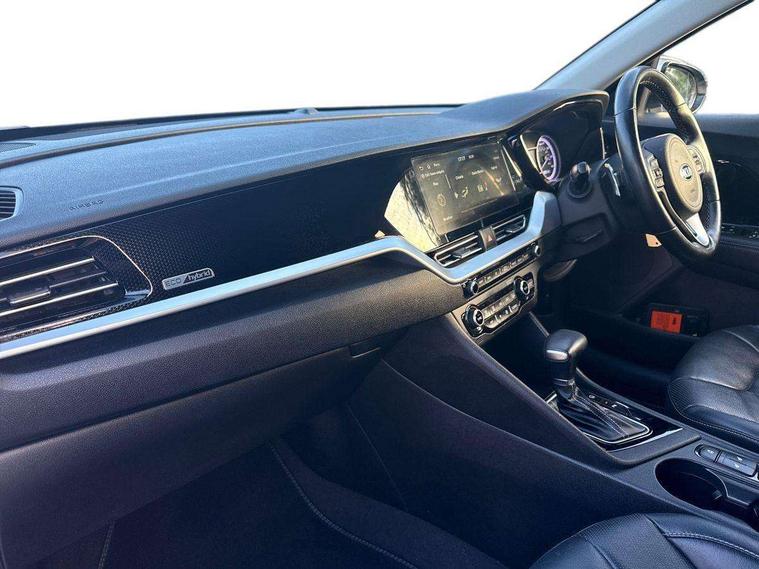 10.25" Touch screen satellite navigation with european mapping and traffic messaging channel, Adaptive smart cruise control function (SCC) with stop and go, Apple car play/Android Auto with voice control, Digital clock, Drive mode selector, Driver attention warning, Emergency stop signalling system, Forward collision avoidance assist, Front parking sensors, Kia connected services featuring TomTom live, Lane Following Assist (LFA), Lane keep assist, Motor driven power steering, Rear parking sensors, Reversing camera, Speed limiter, Telematics system with UVO connect services, Trip computer with distance/fuel consumption/average speed, Wireless Smartphone charger, 'Shark fin' mobile antenna, 4.2" supervision cluster with TFT colour display, 6 speakers, Bluetooth with music streaming, DAB Radio with MP3, Steering wheel mounted controls, USB connection located in centre console, USB port, All round electric windows with drivers and front passenger auto up/down function, Auto dimming rear view mirror, Automatic defog system, Automatic headlight control system, Black beltline mouldings, Black side sills, Body colour bumpers, Body coloured/high gloss door mirrors, Chrome door handles, Driver's side wide angle mirror, Electrically folding/adjustable/heated door mirrors with LED indicators, LED daytime running lights, LED fog lights, LED rear combination lights, Manual headlight levelling, Matt black radiator grille, Privacy glass - Rear windows and tailgate, Projector headlamps, Rain sensing front wipers, Rear spoiler, Rear wiper, Roof rails, Solar glass, Welcome and follow-me home light functionality, Wheel arch mouldings, 3 x passenger assist grips, 60/40 split/folding 2nd row of seats, 8 way electric adjustable drivers seat, All-round height adjustable headrests, Aluminium door scuff plates, Centre console storage box, Centre rool lamp, Door armrest in leather, Driver's electric lumbar adjustment, Driver/passenger sunvisors with illuminated vanity mirrors, Dual zone automatic air conditioning, Front and rear door storage, Front seatback pocket, Front/rear centre armrests, Headlining in Light grey, Heated front seats, Heated steering wheel, High gloss black lower console trim, High gloss black steering wheel trim, Illuminated ignition key hole, Interior door lock/unlock function, ISOFIX Child seat top tethers and anchor fixings, Leather trimmed gearshift, Leather trimmed steering wheel, Leather upholstery, Luggage area lamp, Luggage compartment cover, Luggage net hooks, Overhead console lamp with sunglasses case, Passenger seat height adjuster, Rear armrests with cupholder, Satin finish inner door handles, Steering wheel mounted paddle shift, Tilt/telescopic adjustable steering wheel, Under floor storage box, Ventiliation ducts to rear compartment, Towing pack - Niro, 3 point seatbelts on all seats, ABS, Automatic unlocking of doors in case of impact, Drivers knee airbag, Electric parking brake with auto hold function, Electronic stability control, Front passenger airbag cut-off switch, Height adjustable front seatbelts, Hill start assist control (HAC), Traction control, Twin curtain airbags with roll over sensor, Twin front and side airbags, Tyre pressure monitoring system, Alarm system and engine immobiliser, Deadlocks, Locking wheel nuts, Remote central door locking with fold away key, Speed sensitive auto door locking, Visible vehicle identification number, High gloss black centre fascia, High gloss black door inserts, 18" alloy wheels, Tyre mobility kit,