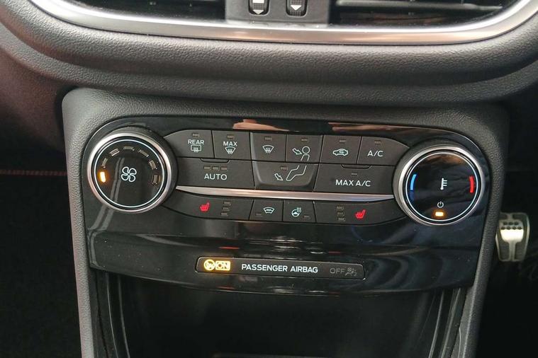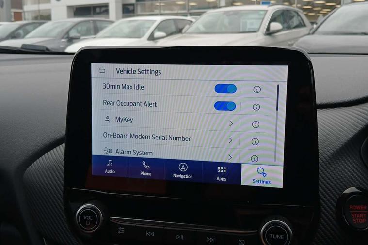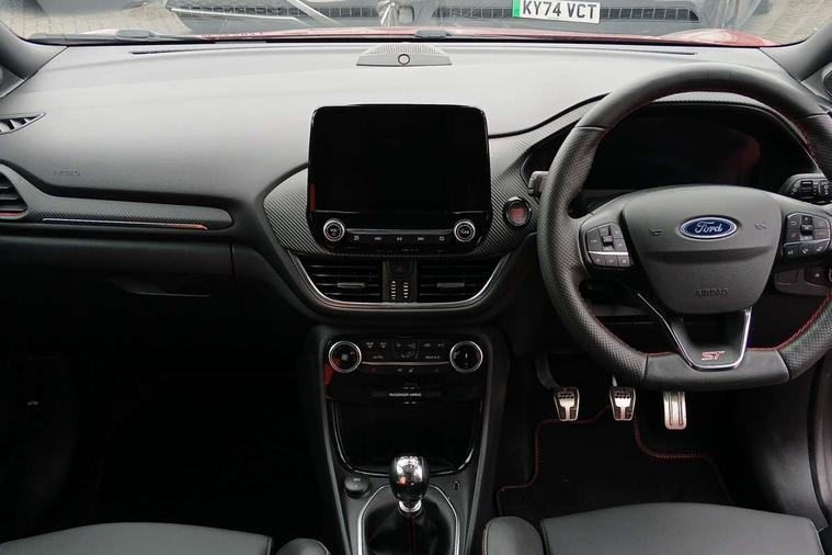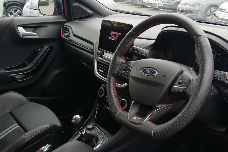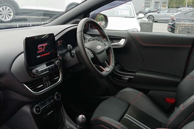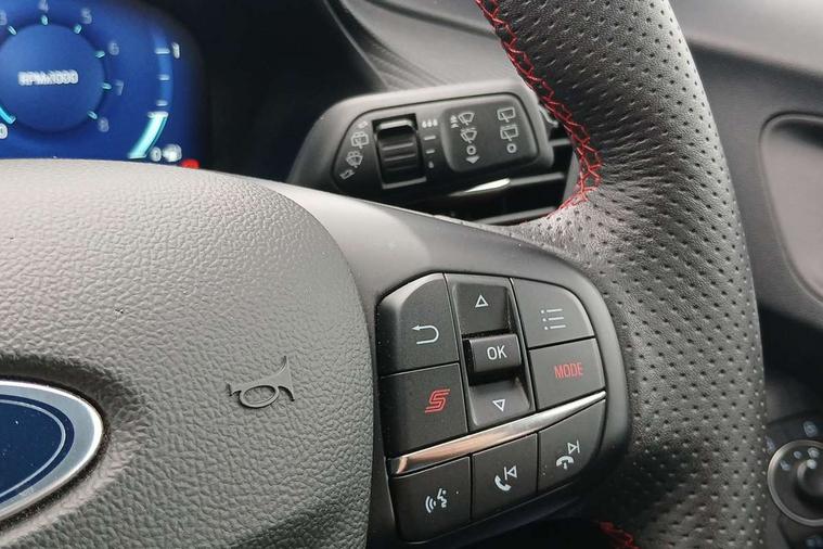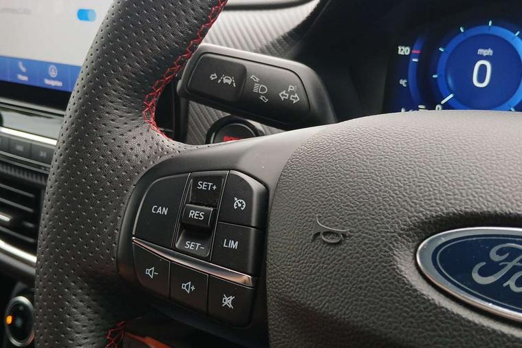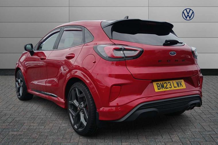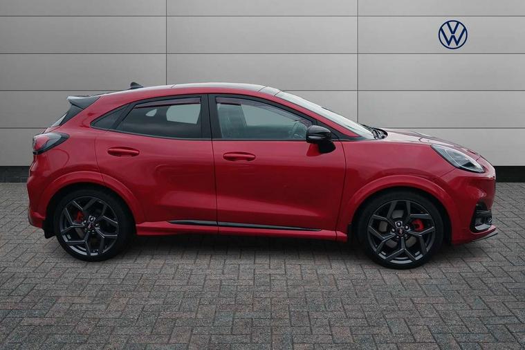 Cruise control with Intelligent speed assist, Driver impairment monitor, Emergency call service, Ford easy fuel, Front and rear parking sensors, Full digital 12.3" instrument cluster, Lane keeping aid with lane departure warning, Power assist steering, Selectable drive modes (normal, sport, eco, track), Speed sign recognition, Engine sound enhancer, ST suspension, Automatic headlights with auto high beam, Automatic rain sensing wipers, Dual chrome exhaust, Fixed LED signature headlamps, Front fog lamps, LED daytime running lights, LED rear lamps, Power foldable heated door mirrors with puddle lamps and puma logo protection, Privacy glass to side rear windows and tailgate glass, Quickclear heated windscreen, Rear side wing doors, Rear wiper, ST scuff plates, Third brake light, Unique ST body styling kit including contrast black roof, large rear spoiler and wing mirrors, plus Ford Performance embossed splitter, 3 seat bench in 2nd row, Alloy sports pedals, Centre console with armrest and stowage, Ford megabox extended bootspace, Ford Performance sensico partial premium leather upholstery with metal grey stitching, Front and rear floor mats, Front and rear head restraints, Manual 6 way driver seat adjust with lumbar adjustment, Manual 6 way passenger seat with lumbar seat adjustment, Single front passenger seat, ST flat bottomed steering wheel with metal grey stitching, ST logo projection, Unique ST gear shift knob, Wireless charging pad with electronic air temperature control (EATC), B&O Premium Audio system + Ford SYNC 3 navigation pack - Puma, Winter pack - Puma, 3 rear seatbelts, Child safety lock, Electronic stability control (ESC) and hill start assist, Pedestrian/cyclist detection & post-collision braking, Pre collision assist system, Red brake calipers, Tyre pressure monitoring system (TPMS), Keyless entry and power start button, Thatcham alarm, Carbon look interior deco spears, 19" 5 Spoke magnetite dark finished alloy wheel, Tyre inflation kit,