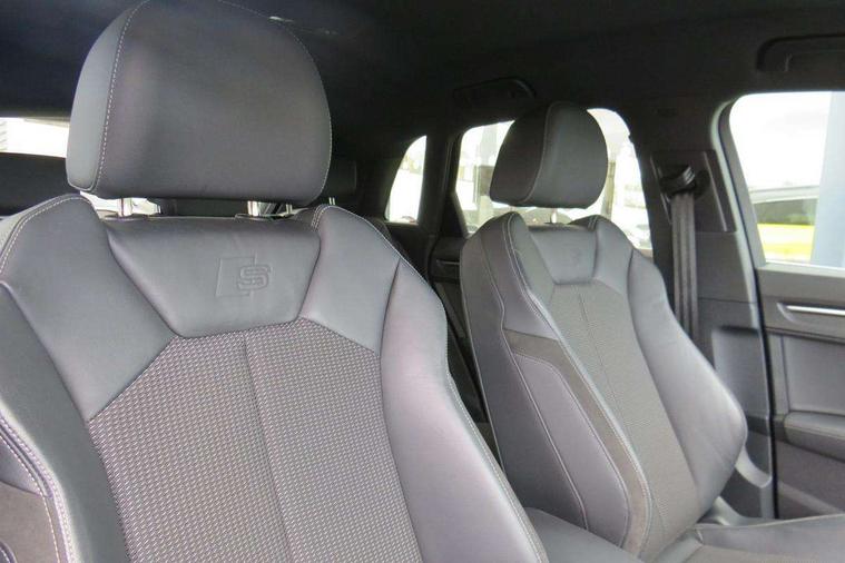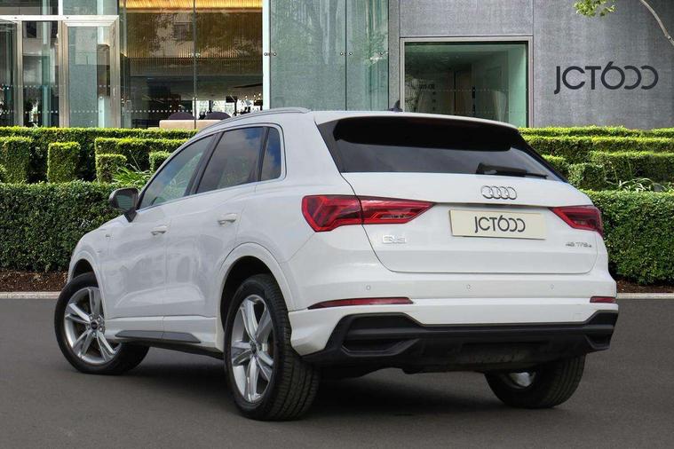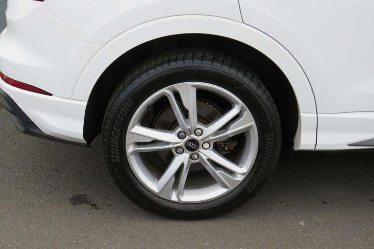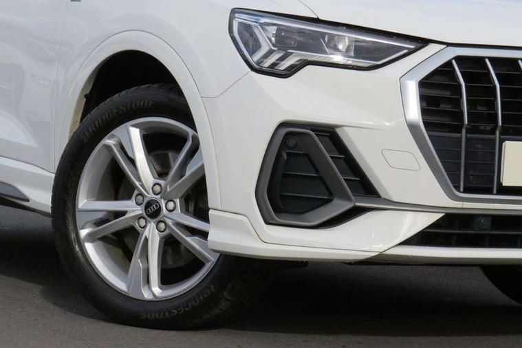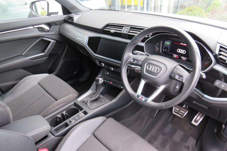 Amazon alexa Integration, Audi drive select, Audi lane departure warning, Audi Virtual Cockpit - 10.25" display, Bluetooth interface, Camera based traffic sign recognition, Legal emergency call, MMI Navigation Plus with high resolution 10.1 inch touchscreen colour display, Power operated tailgate, Progressive steering, Service interval indicator, Smartphone interface includes wireless Apple carplay/Android Auto, Start stop system with recuperation, Voice control system with natural language interaction, 3 pin 10 amp domestic charging cable, 3.6 kw On-board charger, Type 2 mode 3 32 amp charging cable, Type 2 socket for AC charging, 2 USB-C ports with charge and data functions, 6 passive loudspeakers, DAB digital radio module, Acoustic windscreen, Aluminium roof rails, Aluminium window trim, Auto dimming frameless rear view mirror, Body colour front spoiler blade, Body coloured bumpers, Electrically folding, adjustable and heated door mirrors with integrated LED side indicators and kerb view function for passenger side, Front and rear electric windows, Front fog lights, Front side air inlets in matt platinum grey, Grille vertical bars in aluminium silver/Matt, High gloss black finish B and C pillars, LED headlights with LED daytime running lights, LED rear lights, LED third brake light, Privacy glass dark tinted rear and rear-side windows (from B-pillar backwards), Rain and light sensors, Rear diffuser grille in grained matt black, Rear diffuser strip in matt titanium black, Rear side wing doors, Rear wiper, S line badges on front wings, S Line front and rear bumpers, Side skirt insert in matt Platinium grey, Titanium black radiator grille, Variable front intermittent wipers, 12V socket in rear centre console, 3 seat bench in 2nd row, 40:20:40 folding with manual adjustment for 60:40 forwards/backwards position and backrest angle, Adjustable rear seat bench/backrest with centre armrest and cupholder, Black cloth headlining, Dual zone electronic climate control, Front and rear black floor mats with contrast stitching in rock grey, Front and rear headrests, Front and rear roof module including reading lights, Front centre armrest, Glove compartment lighting, Height and reach adjustable steering wheel, Illuminated door sill trims with S logo, ISOFIX child seat mounting for front passenger with airbag deactivation and outer rear seat including top tether attachment point for outer rear seats, Luggage compartment light, Manual front seats with height adjustment, Perforated leather gearknob, Single front passenger seat, Stainless steel luggage compartment sill finisher, Stainless steel pedals, Non smoking pack - Q3, 3x3 point rear seatbelts, 6 airbags - Driver, front passenger, curtain and side windows, Audi pre-sense front with pedestrain and cyclist recognition, Electromechanical parking brake, Electronic stabilisation control including ABS, ASR and EDL, Front seatbelt reminder, Hill descent control, Hill hold assist, Manual child lock in rear doors, Pre sense basic, Seatbelt monitoring, Tyre pressure warning, Warning triangle and first aid kit, Anti theft alarm, Anti theft wheel bolts, Immobiliser, Remote central locking, Dark matt brushed aluminium inlay, Detail dashboard around MMI touch colour display in glass look, black with surround in aluminium look, Leatherette door armrest, Tool kit, Tyre repair kit,