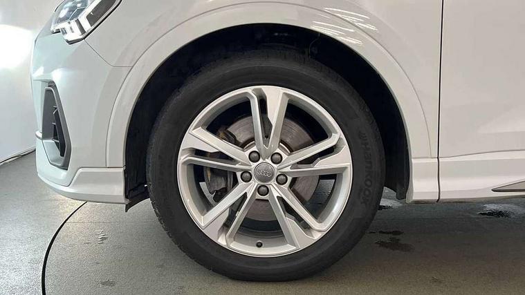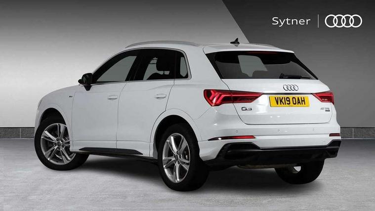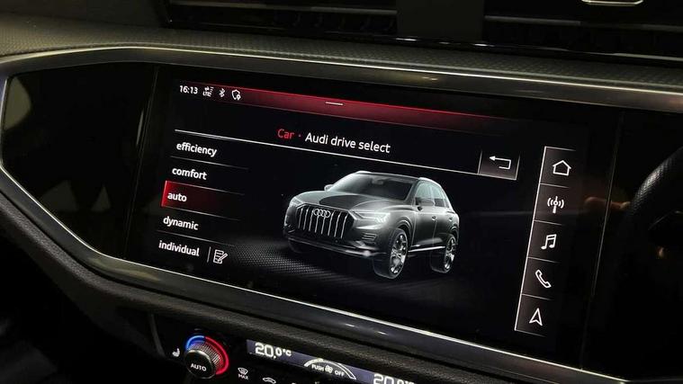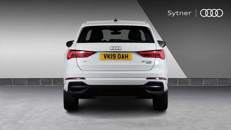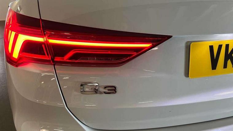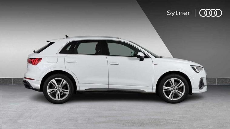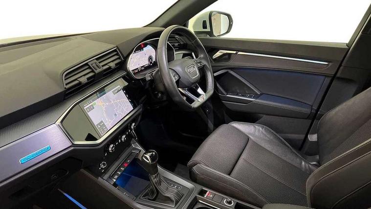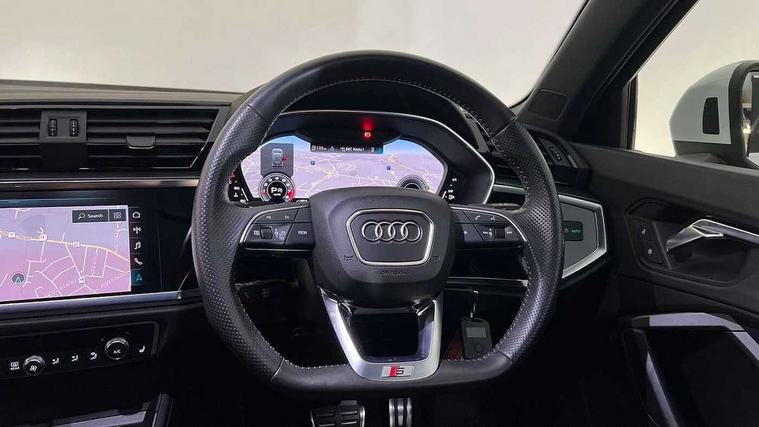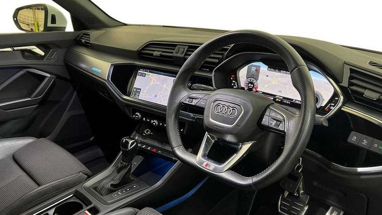 Audi connect safety and service (e-call), Audi drive select, Audi lane departure warning, Audi side assist, Audi smartphone interface, Audi Virtual Cockpit - 10.25" display, Bluetooth interface, MMI navigation plus with MMI touch, Power opening/closing tailgate, Progressive steering, Service interval indicator, Stop/start system, Voice control system, DAB digital radio module, Acoustic windscreen, Aluminium roof rails, Aluminium window trim, Auto dimming rear view mirror, Body colour door mirrors, Body coloured bumpers, Diffuser in matt Platinum grey, Electrically adjustable and heated door mirrors with integrated LED side indicators, Front and rear electric windows, Front fog lights, Front side air inlets in matt platinum grey, Front spoiler blade in matt platinum grey, Grille vertical bars in aluminium silver/Matt, High gloss black finish B and C pillars, Privacy glass, Rain and light sensors, Rear diffuser strip in selenite silver, S Line badge on wings, S Line front and rear bumpers, Side skirt insert in matt Platinium grey, Titanium black radiator grille, 12V socket in rear centre console, 40:20:40 split folding rear bench seat, Adjustable rear seat bench/backrest with centre armrest and cupholder, Aluminium door sill trims, Black cloth headlining, Dual zone climate control, Front and rear black floor mats with contrast stitching in rock grey, Front and rear headrests, Front centre armrest with storage compartment and angle adjustment, Illuminated door sill trims with S logo, ISOFIX child seat mounting and Top Tether with front passenger airbag deactivation, Perforated leather gearknob, Stainless steel luggage compartment sill finisher, Stainless steel pedals, Non smoking pack - Q3, 3x3 point rear seatbelts, 6 airbags - Driver, front passenger, curtain and side windows, Audi pre-sense front with pedestrain and cyclist recognition, Electronic stabilisation control including ABS, ASR and EDL, Hill hold assist, Pre sense basic, Seatbelt monitoring, Tyre pressure warning, Warning triangle and first aid kit, Anti theft alarm, Anti theft wheel bolts, Remote central locking, Dark matt brushed aluminium inlay, MMI touch colour display in gloss black with aluminium surround,