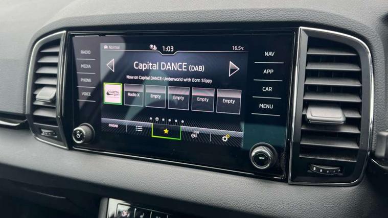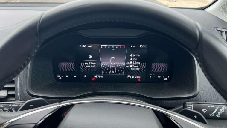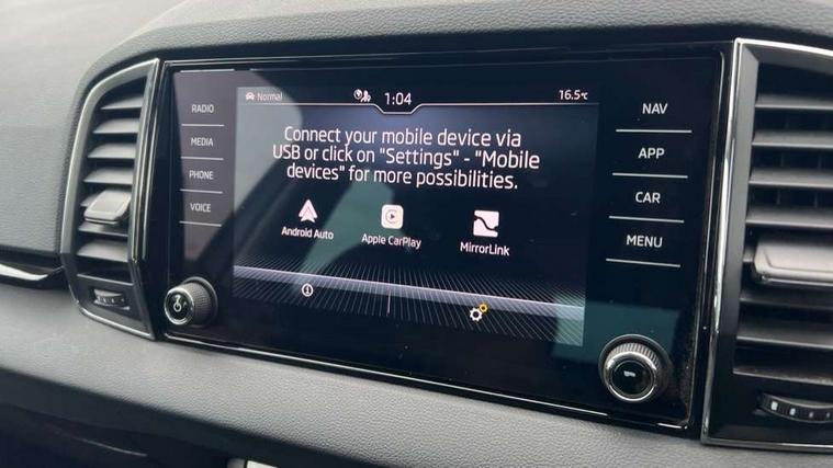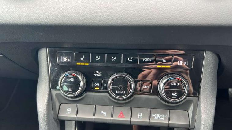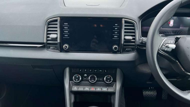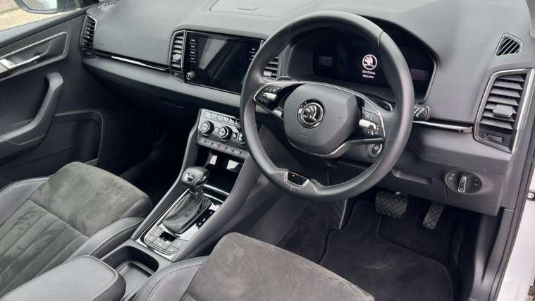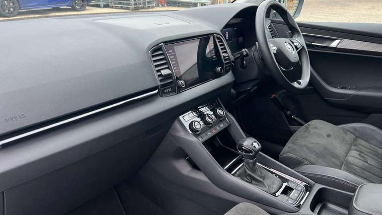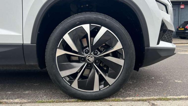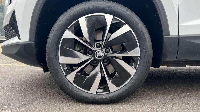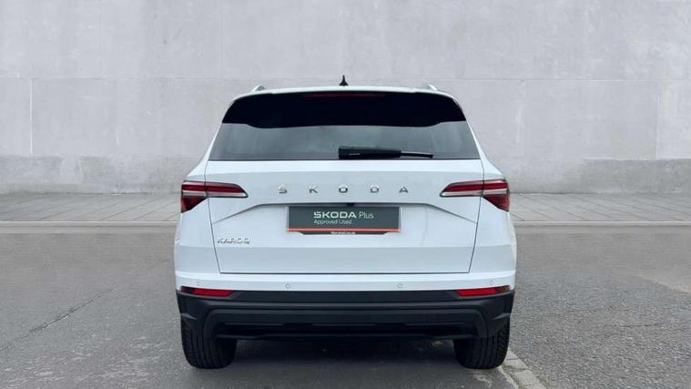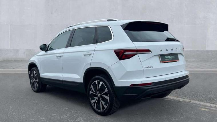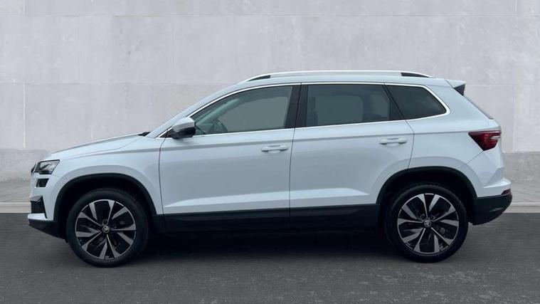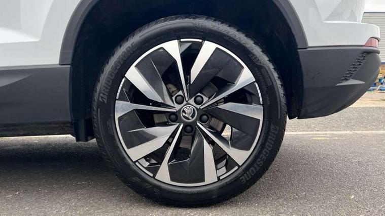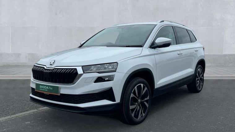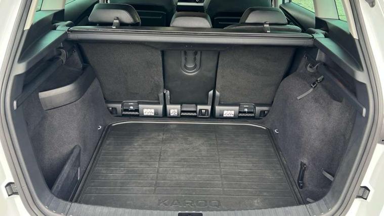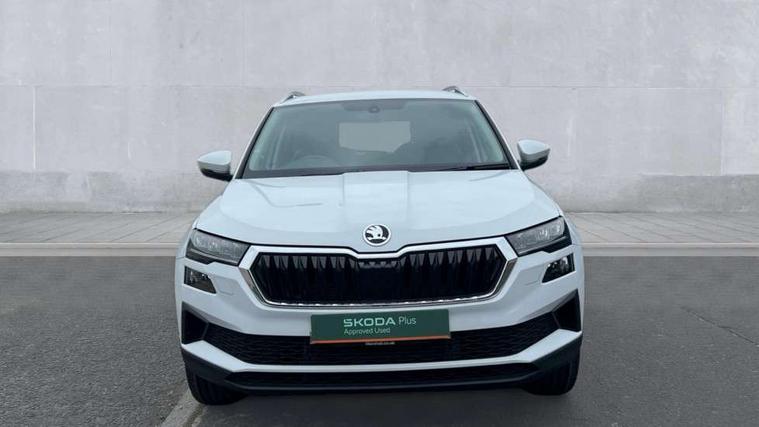 8" Digital display, Care connect, Driver fatigue sensor, Emergency services call system, Outside temperature gauge, Service interval indicator, SmartLink wireless for Apple and wired for Android, Start/stop system with regenerative braking, USB C Port x 2 in front centre console, 8 speakers, DAB radio with Bluetooth, USB connection, Acoustic glass, Aero front windscreen wipers with intermittent function, Auto dimming rear view mirror with light and rain sensors, Black electric window control buttons, Body colour door mirrors and handles, Dynamic headlight range control with cornering light function, Electric front and rear windows with child proof lock, Heated rear windscreen, LED daytime running lights, LED rear lights with high functionality welcome effect and dynamic indicators, Light assistant (coming/leaving home/tunnel light), Plastic scuff plates, Privacy glass, Rear side wing doors, Rear spoiler, Rear window wiper with washer system and intermittent control, Safety reflectors on front doors, 1.5 litre bottle holders in driver and front passenger door panels, 12V socket in boot, 12v socket in front centre armrest with storage compartment and rear air vents, 2 spoke leather heated multifunction steering wheel with DSG paddles, 2 x Tablet holder, 3 rear height adjustable headrests, 3 seat bench in 2nd row, 4 foldable roof handles with rear coat hooks, Black floor carpet, Chrome inner door handles, Decorative door sills with KAROQ badging, Double sided boot floor, Foldable hooks in the boot, Front head restraints, Height adjustable front three point seats belts with tensioners, Height/reach adjust steering wheel, Ice scraper, Illuminated glovebox, Illuminated luggage compartment, Isofix child seat preparation for front passenger seat, Isofix child seat preparation outer rear, Manual lumbar support for front seats, Pen holder, Pollen filter, Rear boot cover, Rear reading lights, Rubbish bin door, Safety vest holder, Single front passenger seat, Storage box in upper central dashboard closed, Sunvisors with illuminated vanity mirrors, Textile floor mats, Ticket holder, Tool kit, VarioFlex seats with standard rear seat release, Boot pack - Karoq, Chrome roof rails + chrome pack - Karoq, Parking pack - Karoq, Automatic door unlocking in case of crash, Automatic fuel cut off in case of crash, Child locks on rear doors, Driver airbag, Electronic parking brake with auto hold function, Emergency rear braking signal, ESC including ABS, MSR, ASR, EDS, HBA, DSR, RBS, MKB and traction control, Front side airbags, Hill hold control, Knee airbags, Passenger airbag with switch-off function, Pedestrian monitor, Seatbelt reminder signalisation and pretensioner for all seats, Three point seatbelts rear, Two tone horn, Tyre pressure display, Tyre pressure monitor, Alarm with interior monitoring, back up horn and tilt sensor with safe function, Electronic engine immobiliser, Keyless entry and start/stop, Remote central locking with 2 remote folding keys, Chrome framed air vents, 18" Procyon silver alloy wheels with anthracite aero inserts, Anti-theft wheel bolts protection, Storage on wheel cover,