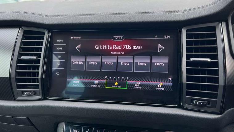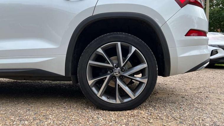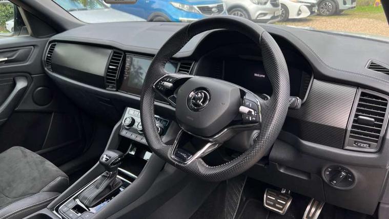Bluetooth system, Columbus satellite navigation with 9.2" touchscreen, integrated Wi-Fi, web radio, Digital voice enhancement, E-call, ECO Stop/start function, Exterior temperature indicator, Progressive steering, Rear view camera, Smartlink wireless for apple carplay and wired for android auto, Speed limiter, Tailgate unlocking from outside, USB C Port x 2 in front centre console, Wireless charging, 8 Speakers, DAB Digital radio, Aero front windscreen wipers with intermittent function, Aero rear window wiper, Auto dimming rear view mirror, Black roof rails, Black sports styling including front grille and window surrounds, Black wheel arch surrounds, Body colour bumpers, Body colour door handles, Electric adjustable/heated/folding door mirrors, driver side auto dimming with boarding sports and memory function, Electric front and rear windows, Extended rear spoiler with finlets in gloss black, Front fog lights, Full LED matrix headlights with AFS (adaptive front light system), cornering function and AWL (all weather lighting system), Gloss black door mirrors, Headlight washers, Heated rear window, Invisible tailpipe, LED daytime running lights, LED rear fog light, LED third brake light in rear spoiler, Light assistant (coming/leaving home/tunnel light), Off-road style lower front bumper element, Privacy glass, Rain and light sensors, Rear diffuser, Rear LED lights (high functionality) with welcome effect and dynamic indicators, Rear side wing doors, Safety reflectors on front and rear doors, Sportline badge on front fender, Sports front and rear bumpers including lower rear chrome strip, Tailgate lettering in Black, Window control switches with black trim, Without engine designation, 12V socket in boot, 2 rails with 2 hooks, 2 seat bench in 3rd row, 3 seat bench in 2nd row, 4 foldable roof handles with rear coat hooks, 60:40 foldable rear seat with sliding adjustment and backrest angle adjustment, Aluminium pedals, Black roof headlining, Bottle holders in door panel in the 1.5 litre front and 1 litre rear, Cargo storage compartments, Chrome headlight control button, Chrome interior door handles, Coat hooks on B pillar, Covered storage compartment on driver side, Front centre armrest with storage compartment, cup holder and 12V socket, Front courtesy lights, Gear shift lever with chrome frame and black gloss insert, Grey stitching in front and rear armrests and door armrests + door inserts, Height adjustable front headrests, Illuminated and cooled glovebox, Illuminated luggage compartment, Isofix child seat fittings in outer rear seats with top tether, Manually adjustable steering column, Microsuede door panels, Net programme in boot (1x horizontal Net, 2x vertical Nets), Overhead glasses storage compartment, Pollen filter, Rear centre armrest with cupholders, Single front passenger seat, Sliding trunk cover, Small Bags on the inner sides of the front backrests, Sports seats, Sunvisors with illuminated vanity mirrors, Three rear height adjustable headrests, Ticket holder on A Pillar, Umbrella in door panel, Variable boot floor, LED Interior light pack - Kodiaq, Auto door release and activation of warning lights in the event of an accident, Child locks on rear doors, Driver and front passenger airbag with knee airbag and front passenger airbag deactivation, Electronic parking brake with hill start assist, Emergency rear braking signal, ESC (incl. ABS+MSR+ASR+EDS+HBA+DSR+RBS+MKB), Front assist with autonomous emergency braking, Front side airbags with curtain airbags, Fuel cut off safety device, Height adjustable front 3 point seatbelts + pretensioners, Hill hold control, Rear disc brakes, Safety vest holder in door, Seat belt reminder for all seats, Three point rear seat belts, Two tone horn, Tyre pressure monitor, Alarm with interior monitoring and tilt sensor with safe function, Anti-theft wheel bolts, Immobiliser, Keyless entry and start system (KESSY), Remote central locking with 2 keys, Black air vent surround, Carbon finish dashboard and door inserts, Grey stitching in dashboard, 20" Vega Anthracite alloy wheels, Temporary spare wheel (space saver),