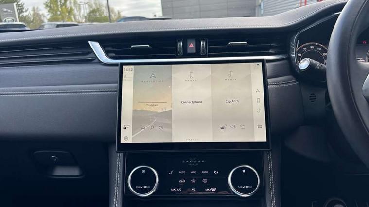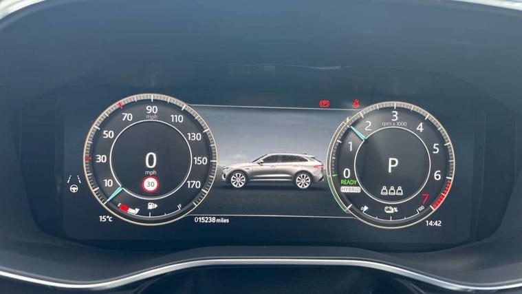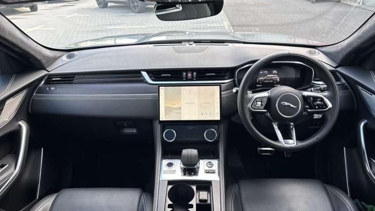 11.4" touchscreen, Adaptive cruise control with steering assist, Android Auto, Apple car play, Blind spot assist, Bluetooth connectivity, Clear exit monitor, Driver alert system, Driver condition monitor, eCall emergency call system, Eco driving style assistant, Electric power assisted steering, InControl remote, Interactive driver display digital with 12" TFT display, Jaguar Toggle shift selector, Lane departure warning system, Lane keep assist, Outside temperature gauge, Personalisation profile management, Pivi pro connected navigation system with app interface and media storage, Pro services and wifi hotspot, Push button starter, Rear collision monitor, Rear traffic monitor, Service interval indicator, Speed proportional steering, Start up sequence with movement in dials and lighting, Traffic sign recognition with adaptive speed limiter, Trip computer, Voice control system, Wireless device charging, 7 kW onboard charger, 8 speed automatic transmission, AC/DC charging, Adaptive dynamics, All terrain progress control, All Wheel Drive (AWD), Configurable dynamics, Home charging cable, Open differential with torque vectoring by braking, Public charging cable, AM/FM radio, Bluetooth streaming, DAB Radio (Digital Audio Broadcasting), Dynamic volume control, InControl apps, InControl protect, iPod integration, 3 flash lane change indicators, Animated directional indicators, Approach Illumination, Auto dimming rear view mirror, Auto high beam assist, Automatic headlights, Electric heated/power fold memory door mirrors with approach lights and auto dimming driver side, Electric windows with one touch open/close and anti trap, F-Pace and R Dynamic badge, Green tinted glass, Heated front windscreen + heated washer jets, Heated rear window with timer, Illuminated metal tread plates with Jaguar script, Jaguar script and leaper, LED High level third brake light, LED tail lights, Metal load space scuff plates, Non acoustic front windscreen, P400e AWD badge, Privacy glass, R Dynamic badge on side door, Rain sensor windscreen wipers, Rear fog lights, Rear metal tread plates, Rear side wing doors, Rear wiper, Trailer stability assist, Variable front intermittent wipers, 12V power point front, 3 rear headrests, 3 seat bench in 2nd row, Additional power sockets - Two additional USB sockets in rear centre console and one 12V socket in trunk, Air distribution speed, Bright metal foot pedals, Centre armrest console, Centre console with side storage, Configurable cabin lighting, Deletion loadspace storage rails, Door sill tread plates, Ebony suede cloth headlining, Electrically adjustable steering column, Fold flat front seats, Front centre armrest with storage compartment, Front door storage space, Glovebox finisher with jaguar script, Heated steering wheel, Hooks in loadspace, Illuminated glovebox, Interior front door handles with separate locking switches, ISOFIX on outer rear seats, Jaguar sense, Leather steering wheel, Luggage tie downs in loadspace, Mist sensing, Multifunction steering wheel, Overhead lighting console, Overhead stowage for sunglasses, Passive front head restraints, Premium carpet mats, Rear air vents, Rear armrest with twin cupholders, Rear centre headrest, Rear door storage space, Reversible boot floor, Satin chrome gearshift paddles, Shopping bag hook, Single front passenger seat, Sunvisors with illuminated vanity mirrors, Twin front cupholders with cover, Online Pack with data plan - F-Pace, 380mm front brakes and 325mm rear brakes, 3x3 point rear seatbelts, ABS, All surface progress control (ASPC), Brake pad warning light, DSC - Dynamic Stability Control, Electric parking brake (EPB), Emergency brake assist, Front airbags with passenger seat occupant detector, Front and rear seatbelt reminder, Front side airbags, Full length side window curtain airbag, Hill launch assist, Power operated child locks, Traction control, Tyre pressure monitoring system, Immobiliser, Keyless entry, Keyless Start, Locking wheel nuts, Perimeter alarm, Remote central locking, Valet mode,