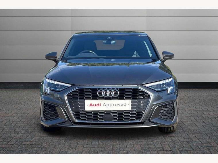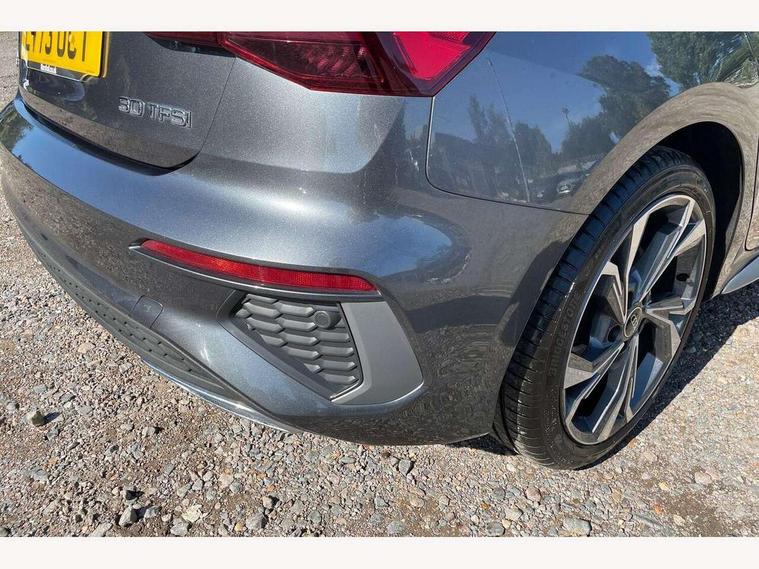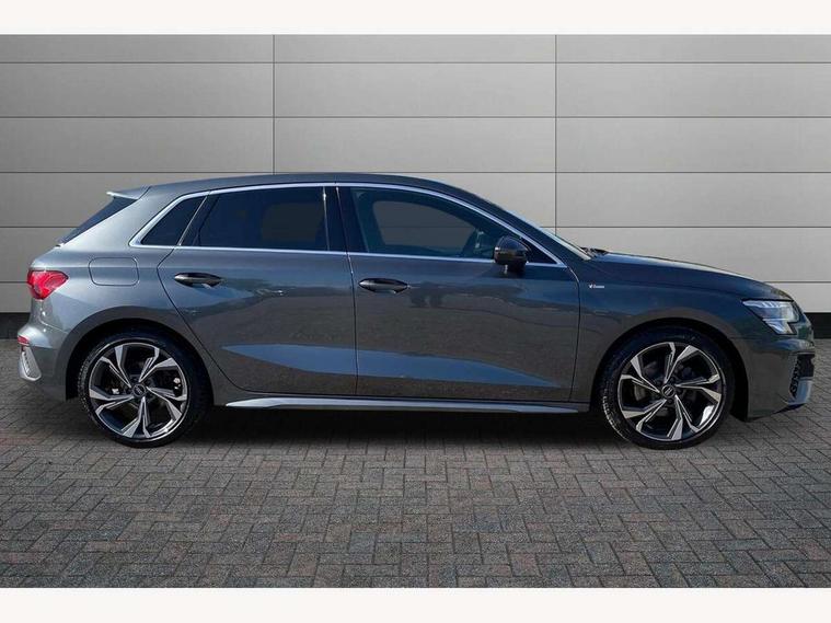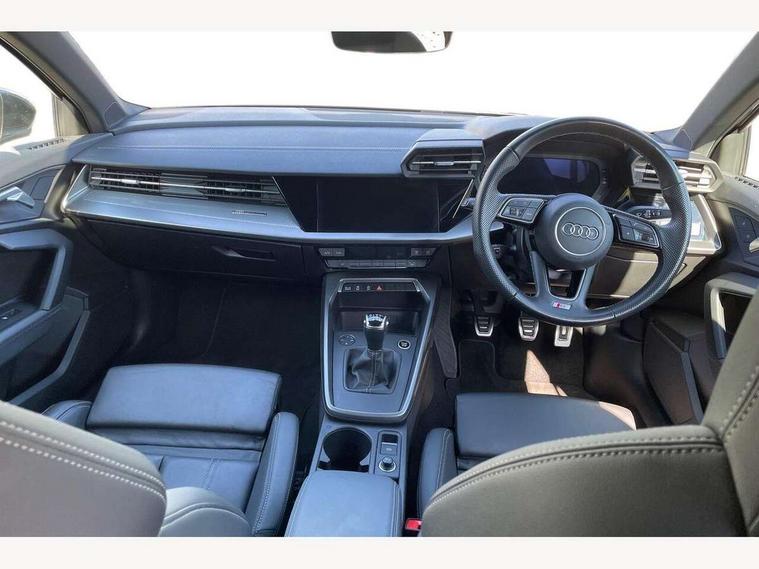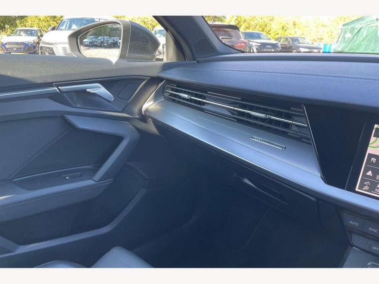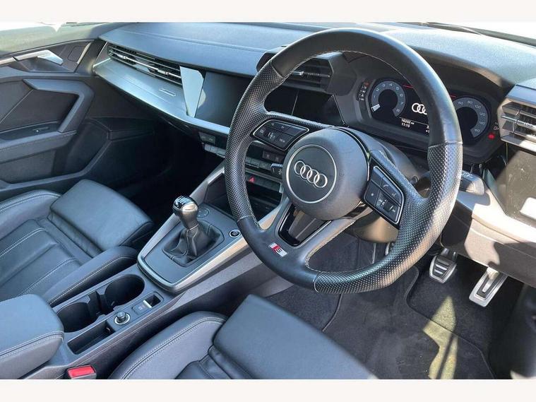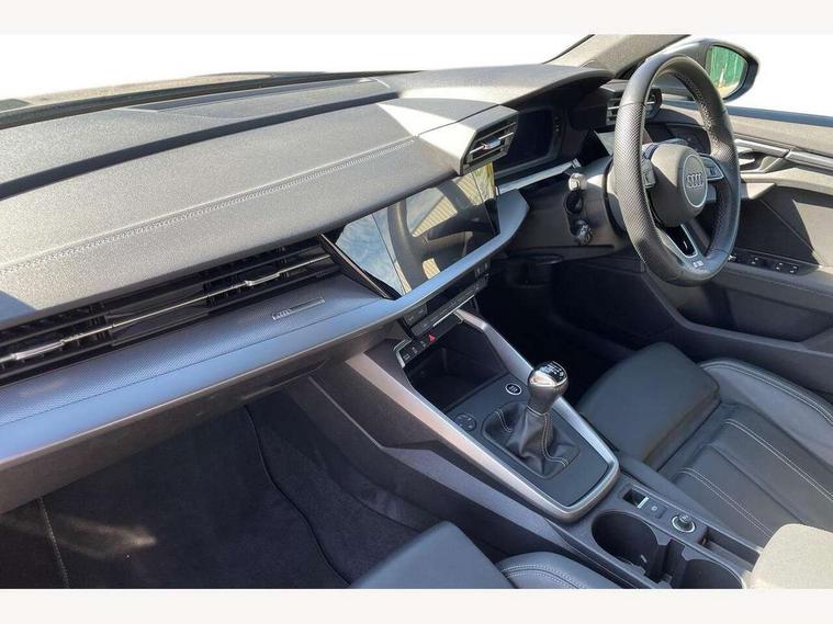 Audi drive select (Auto, Comfort, Dynamic and Individual), Audi smartphone interface, Audi Virtual Cockpit - 10.25" digital and colour instrument cluster, Automatic start/stop system with recuperation, Bluetooth interface, Camera based traffic sign recognition, Collision avoidance assistant, Cruise control, e-Call (emergency call), Electromechanical power speed sensitive steering, Lane departure warning system, MMI Navigation Plus with high resolution 10.1" colour touch screen display, Rear parking sensors, Service indicator, Trip computer, Voice control system with natural language interaction, Sports suspension, 2xUSB-C connection with data and charging functions, 6 passive loudspeakers, DAB Digital radio, 3rd brake light, Acoustic glass windscreen, Aluminium window trim, Auto dimming frameless rear view mirror, Body colour exterior mirrors, Electrically adjustable/heated/folding/auto dimming door mirrors with integrated LED indications + kerb view function for passenger side, Front electric windows, Illuminated door sills with aluminium inserts at the front with S logo, LED daytime running lights, LED headlights with LED rear lights and dynamic rear indicators, Light and rain sensors, Privacy glass - dark tinted rear window, rear door and side windows, Rear electric windows, Rear side air outlets in grained matt black, Rear side wing doors, Rear wiper, S line bumpers, S roof spoiler, 12V socket and storage compartment in front centre console, 3 seat bench in 2nd row, 3 spoke leather multifunction steering wheel, 4 way electrically adjustable lumbar support for driver and front passenger, 60/40 split folding rear seat bench, Black cloth headlining, Dual zone electronic climate control, Front and rear centre armrest in artificial leather, Front and rear headrests, Front/rear floor mats, Height and reach adjustable steering wheel, Interior lighting - glove compartment light and right hand side, Luggage compartment floor covering, Manual boot compartment lid, Manually adjustable front seats, Seat side bolsters, Single front passenger seat, Stainless steel pedals and front footrest in black, Twin leather upholstery with front sports seats S embossed logo, Aluminium interior elements pack - A3 Sportback, LED interior lighting pack - A3 Sportback, S line styling pack - A3 Sportback, 3x3 point rear seat belts, Driver and front passenger airbag with passenger airbag deactivation, Electronic Stabilisation Control (ESC) including ABS, ASR and EDL, First aid kit with warning triangle and 2 safety vests, Front side airbags with head airbags and interaction airbag, Pre-sense front with pedestrian and cyclist detection, Seatbelt monitoring, Tyre pressure loss indicator, Anti theft alarm, Anti-theft wheel bolts, Electronically operated child locks, Immobiliser, Remote control central locking, Dark spectrum aluminium inlays, accent surfaces in the dashboard and centre console in platinum grey silk effect paint finish,