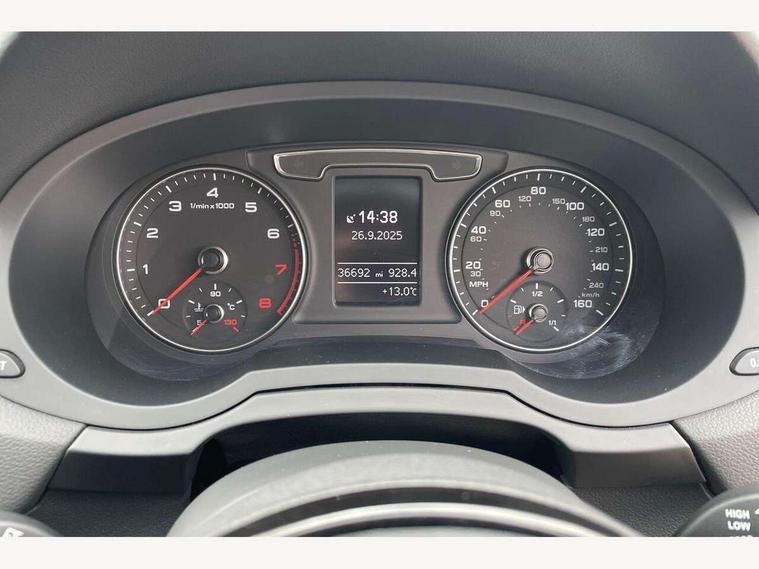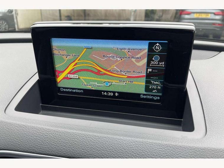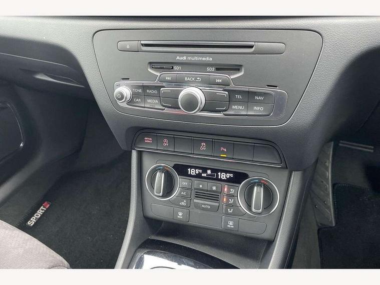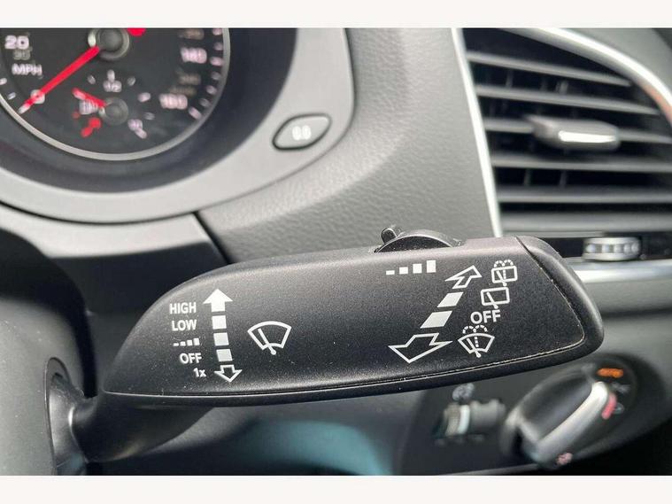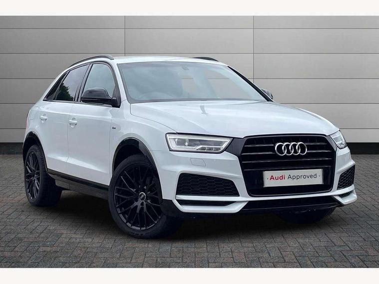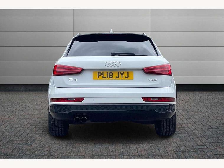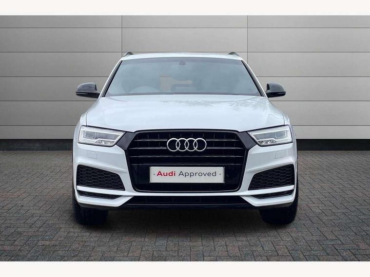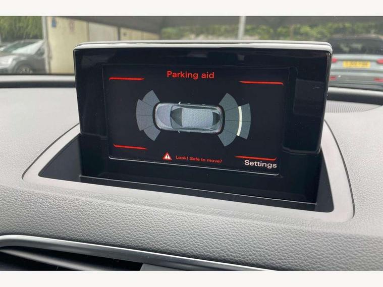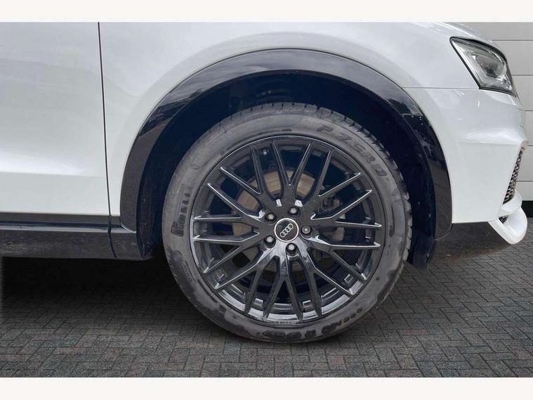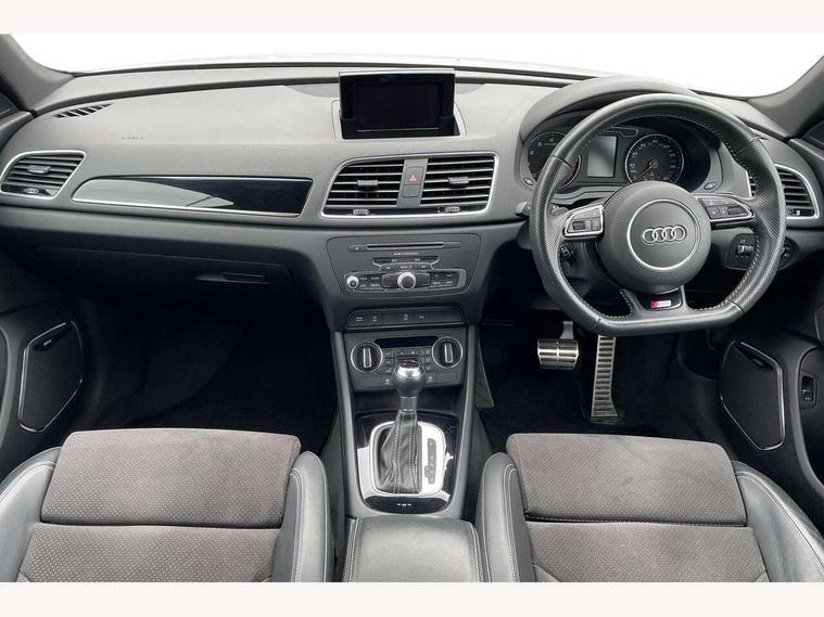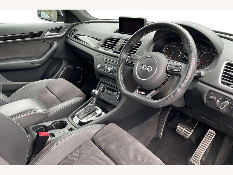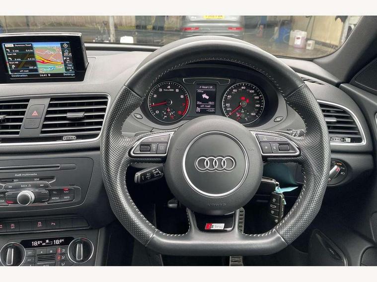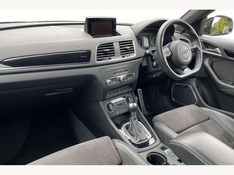 6.5" colour display screen, Audi drive select, Cruise control, Electro-mechanical PAS, Low washer fluid indicator, MMI - Multi Media Interface control system, On board computer, Remote electric boot opening/closing, Service interval indicator, Voice control system, Sports suspension, Audi music interface, BOSE sound system, DAB digital radio module, Acoustic windscreen, Aluminium window surround, Auto dimming rear view mirror, Black exhaust tailpipes, Black high gloss door mirrors, Black roof rails, Coming home function, Door mirror integrated indicators, Front and rear electric windows, Front fog lights, Front lip spoiler, Heated windscreen washer jets, High Gloss Black Contrast Bumpers, High Gloss Black rear spoiler, LED daytime running lights, LED headlights with headlight washers, LED rear lights, Light and rain sensor for auto activation of lights and windscreen wipers, Loading sill protector in stainless steel, Privacy glass, Rear diffuser with platinum insert, Rear wiper, S Line body styling, Sunband for windscreen, 12V socket in rear centre console, 3 spoke flat bottom multi-function perforated leather steering wheel with contrast stitching and aluminium gearshift paddles, Aluminium door sill trims, Aluminium gear knob, Black cloth headlining, Door sill trim strips, Dual zone climate control, Electric front lumbar adjustment, Front and rear headrests, Front and rear velour floor mats, Front centre armrest with storage compartment and angle adjustment, Front sports seats, Height/reach adjust steering wheel, ISOFIX on front passenger and rear outer seats, Jack and tool kit, Retractable luggage cover, Reversible boot floor, Split fold rear seat, Stainless steel pedals, Storage compartment and 12V socket, Under floor storage in luggage area, Audi Exclusive black styling pack - Q3, LED interior light pack - Q3, 3x3 point rear seatbelts, ABS+Electronic Brake force Distribution, Curtain airbags, Driver and passenger airbags, Driver and passenger side airbags, EDL + ASR, Electrically operated child locks on rear doors, Electromechanical parking brake, ESP, First aid kit, Front passenger airbag deactivation, Head airbags, Seatbelt warning light, Tyre pressure monitoring system, Warning triangle, Locking wheel bolts, Remote central locking, Thatcham category 1 alarm + immobiliser, Piano black finish inlay,