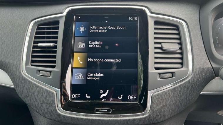 12.3" Active TFT crystal driver's instrument display, 9" centre console portrait touch screen, Adjustable steering wheel force, Bluetooth hands free telephone connection, Drive mode settings, Driver alert control with lane keeping aid, Front and rear park assist, Handsfree power tailgate opening and closing, Intellisafe assist - Adaptive cruise control with pilot assist, Oncoming Lane Mitigation, Sensus navigation with European mapping and traffic information, Service interval indicator, Speed limiter, Speed sensitive steering, Trip computer, Voice activated control for key functions, Volvo on call, Wireless internet connection, 8 speed automatic transmission with start/stop + manual change functions, All wheel drive system, Touring chassis, DAB Radio (Digital Audio Broadcasting), Steering wheel audio controls, Steering wheel remote infotainment controls, Adaptive brake lights with high level LED brake lights, Auto dimming interior + exterior mirrors, Automatic headlight levelling system, Automatic LED Headlights + Active high beam incorporating daytime running lights, Body colour bumpers, Chrome door handles deco strip and window surround, Colour coordinated auto folding and heated power door mirrors, Dual integrated exhaust pipes, Front and rear power windows, Home safe and approach lighting, Integrated roof rails in silver, LED front fog lights, Piano black waterfall front grille, Puddle lights, Rain sensor with automatic windscreen wiper activation, Rear wash/wipe with intermittent wipe setting, Roof antenna, Roof spoiler, Visible VIN plate, 2nd Row centre armrest with storage and cupholders, 3 spoke leather steering wheel and illuminated gear knob with chrome trim, A-pillar parking ticket holder, B Pillar ventilation, Bright metal luggage threshold, Cargo divider with grocery bag holder, Centre console cupholders and storage, Driver's side lower dashboard storage compartment, Floor mats, Front and rear aluminium tread plates, Front and rear reading lights, Theatre lighting and centre armrest storage illumination, Front footwell and side step illumination, Front headrests, Heated front seats, Height/reach adjustable steering column, Illuminated luggage compartment, Illuminated vanity mirrors + ticket holder, Illumination lockable glovebox compartment, Leather faced upholstery, Load protection net, Outboard armrest with cupholder and storage for third row passengers, Power driver seat with lumbar support and memory for seat and exterior door mirrors, Power passenger seat with lumbar support, Rear headrests, Semi automatic load cover, Single front passenger seat, Three 2nd row individual folding passenger seats with fore/aft adjustment, Two 3rd row individual folding passenger seats, Underfloor cargo storage, 7 three point seatbelts, City safety includes pedestrian, cyclist and large animal detection and front collision warning with full auto brake, Drivers knee airbag, Dual stage driver/passenger airbags, First aid kit, Front and rear curtain airbags, Front seat side impact airbags, Front seats SIPS airbags, Hill descent control, Hill start assist, IC (Inflatable Curtains) - Full Length, Passenger airbag cut-off switch, Power parking brake with auto hold function, Run off Road Mitigation, Run off Road Protection, Seatbelt reminder and pretensioners for all seats, SIPS (Side Impact Protection System), Slippery road and hazard light alert, Stability and Traction Control with Spin control, Engine Drag Control and Corner Traction Control, Tyre pressure monitoring system, Vehicle deceleration control with Anti-lock Brake System, Electronic Brake Distribution and Emergency Brake Assist, Warning triangle, WHIPS whiplash protection system - front, Anti-theft alarm including immobiliser/volume sensor + level sensor, Key integrated remote control central locking + fuel flap with deadlocking system and auto open/close power windows, Keyless drive (includes keyless entry and keyless start) with remote tag, Locking wheel nuts, Private locking for glovebox and tailgate, Iron ore inlays, Tempa spare wheel and jack,