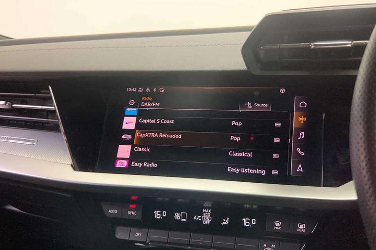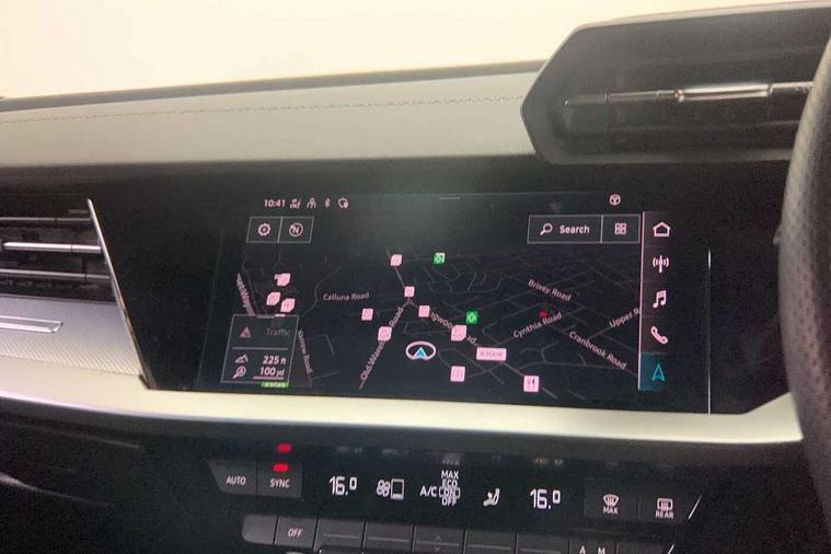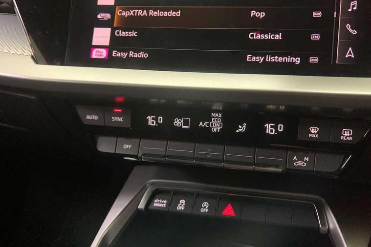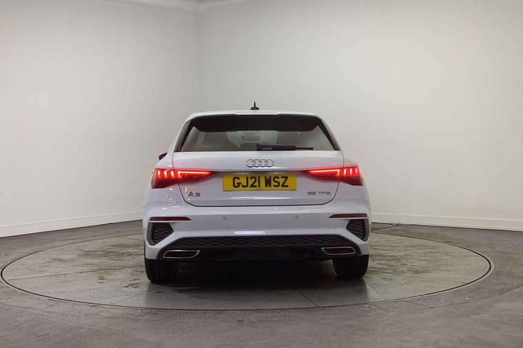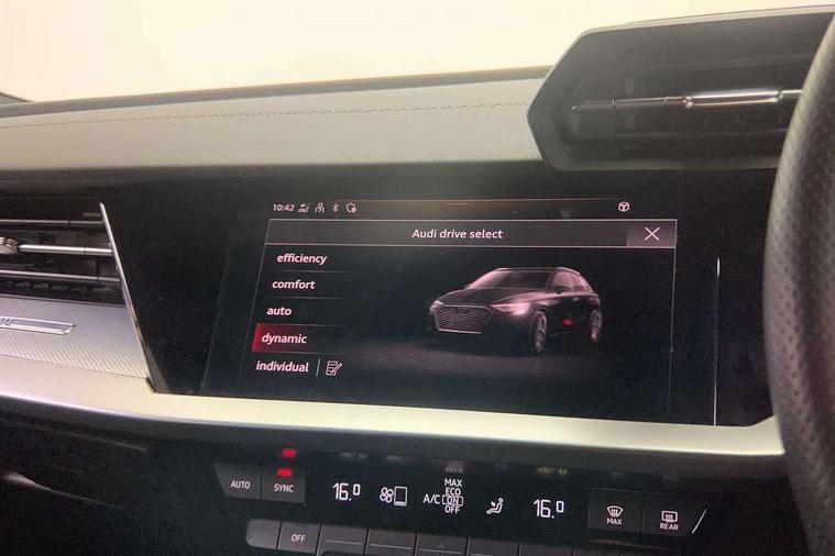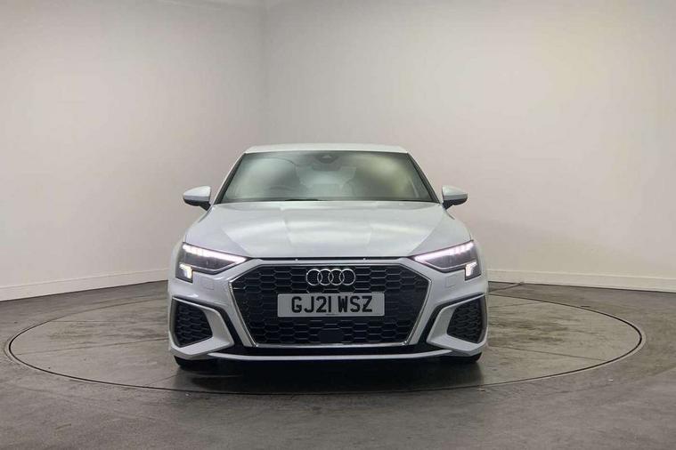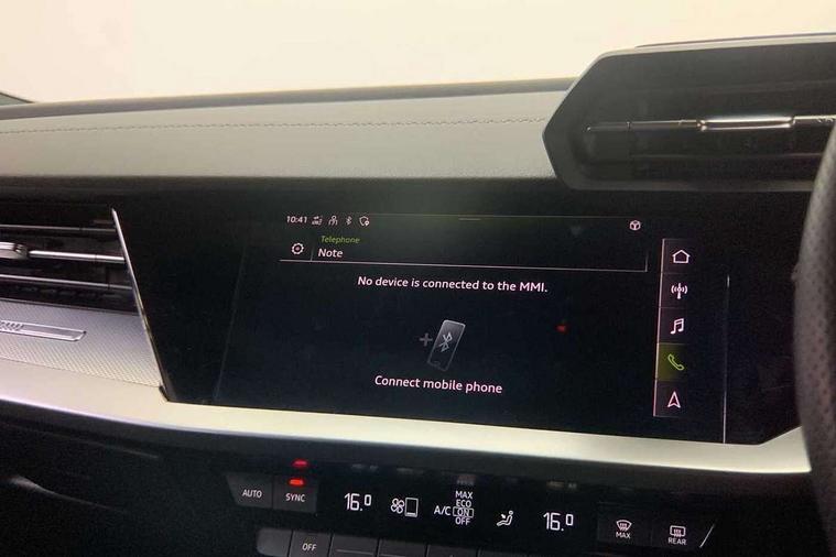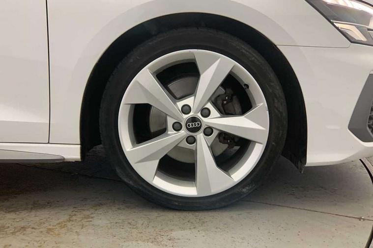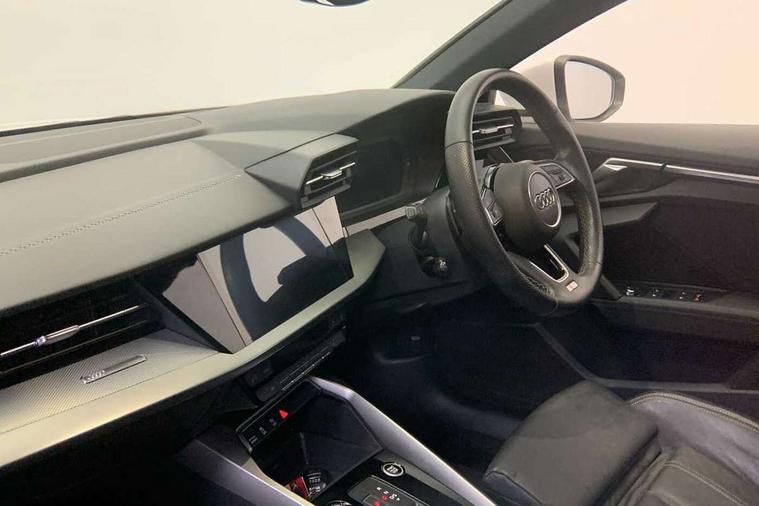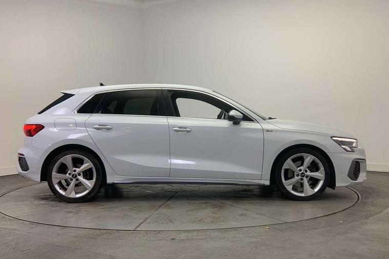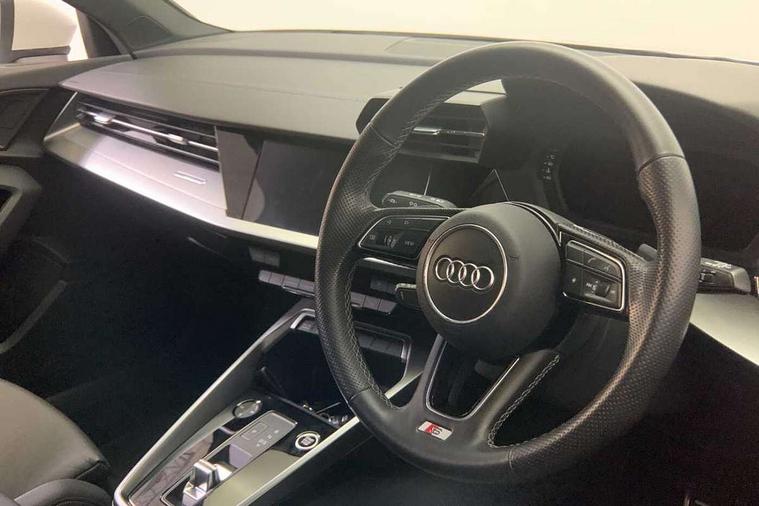 Accent surfaces in the dashboard and centre console in platinum grey silk effect paint finish, Dark spectrum aluminium inlays, Aluminium interior elements pack - A3 Sportback, S line styling pack - A3 Sportback, Anti theft alarm, Anti-theft wheel bolts, Electronically operated child lock, Immobiliser, Remote control central locking, 2xUSB-C connection with data and charging functions, 6 passive loudspeakers, DAB Digital radio, 3x3 point rear seat belts, Driver and front passenger airbag with passenger airbag deactivation, Electronic Stabilisation Control (ESC) including ABS, ASR and EDL, First aid kit with warning triangle and 2 safety vests, Front side airbags with head airbags and interaction airbag, Hill hold assist, Pre-sense front with pedestrian and cyclist detection, Seatbelt monitoring, Tyre pressure loss indicator, Acoustic glass windscreen, Aluminium window trim, Auto dimming frameless rear view mirror, Electrically adjustable/heated/folding/dimming door mirrors with kerb view includes integrated LED indications + kerb view function for passenger side, Front electric windows, Illuminated aluminium inserts front door sills with S logo, LED daytime running lights, Light and rain sensors, Privacy glass - dark tinted rear window, rear door and side windows, Rear electric windows, Rear side air outlets in grained matt black, Rear wiper, S line bumpers, S roof spoiler, 12V socket and storage compartment in front centre console, 40/20/40 split folding rear seat bench with cupholder, Black cloth headlining, Dual zone electronic climate control, Front and rear centre armrest in leather, Front and rear headrests, Front/rear floor mats, Height and reach adjustable steering wheel, Interior lighting - glove compartment light and right hand side, Luggage compartment floor covering, Manual boot compartment lid, Manually adjustable front seats, Seat side bolsters, Stainless steel pedals and front footrest, Twin leather upholstery with front sports seats S embossed logo, Audi connect emergency call and service, Audi drive select (Auto, Comfort, Dynamic, Efficiency and Individual), Audi smartphone interface, Audi Virtual Cockpit - 10.25" digital and colour instrument cluster, Automatic start/stop system with recuperation, Bluetooth interface, Collision avoidance assistant, Electromechanical power speed sensitive steering, Lane departure warning system, MMI Navigation Plus with high resolution 10.1" colour touch screen display, Service indicator, Trip computer, Voice control system with natural language interaction,