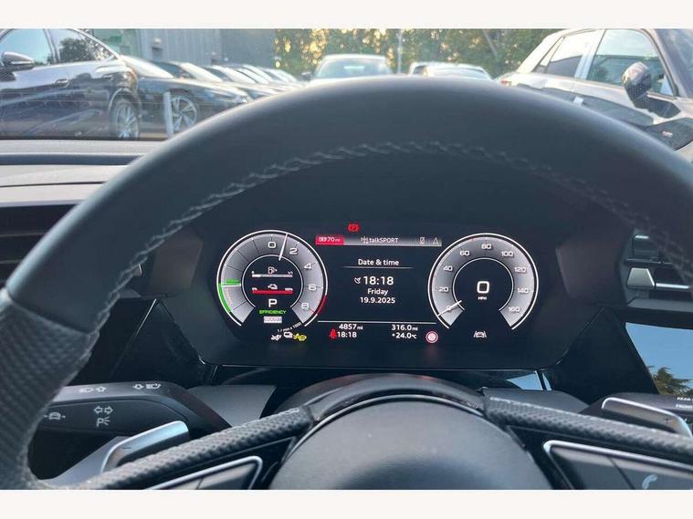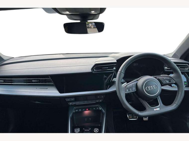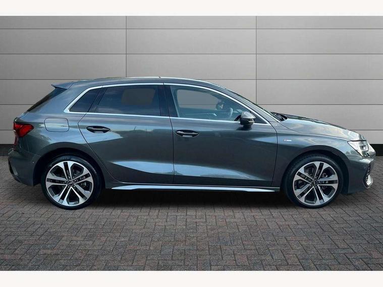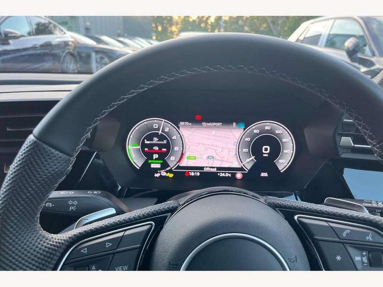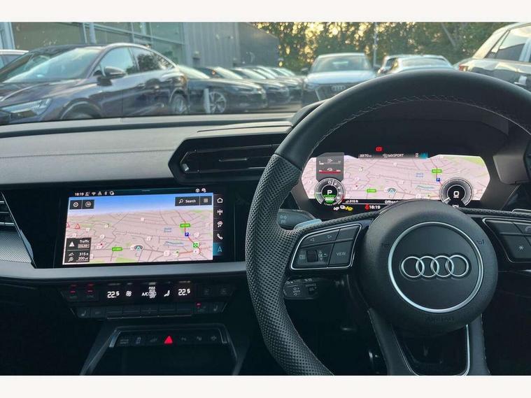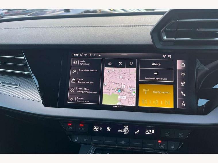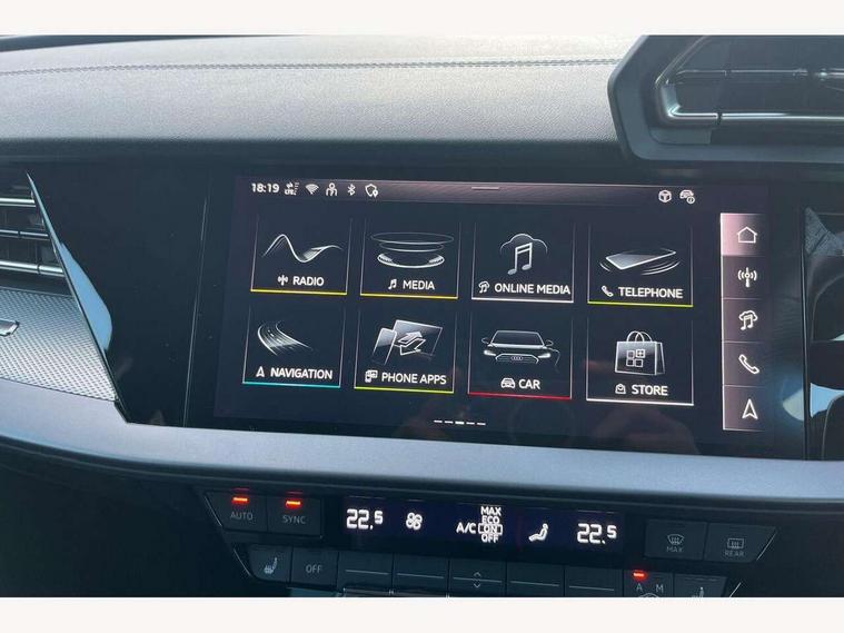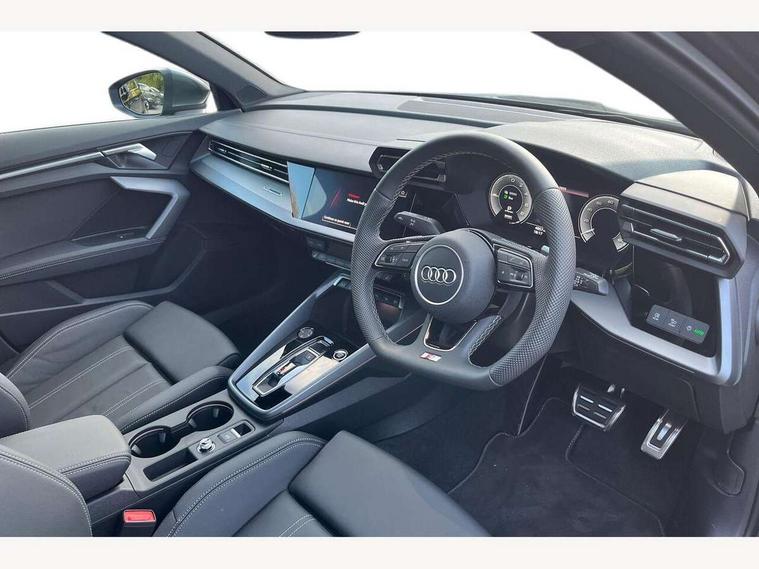 Adjustable speed limiter, Audi drive select, Audi smartphone interface with app store includes wireless Apple carplay, Android auto and Amazon alexa integration, Audi virtual cockpit plus - 12.3" full HD resolution dynamic digital instrument cluster, Automatic start/stop system with recuperation, Bluetooth interface, Camera based traffic sign recognition, Collision avoidance assistant, Cruise control, Distraction and Fatigue warning, e-Call (emergency call), Electromechanical power speed sensitive steering, Lane departure warning system, MMI Navigation Plus with high resolution 10.1" colour touch screen display, Park Assist with parking system Plus, Service indicator, Trip computer, Voice control system with natural language interaction, 3 pin 10 amp domestic charging cable, CCS socket for DC charging, Charging cable for public charging, mode 3 (type 2), up to 22 kW (AC), Compact charging system, Industrial connector CEE 32 A, 230 V, length 1.6 m, Standard suspension, Type 2 socket for AC charging, Audi Phonebox light with wireless charging, Audi sound system - 10 loudspeakers including centre loudspeaker and subwoofer, DAB Digital radio, USB ports with charging function in the rear, Acoustic glass windscreen, Aluminium window trim, Auto dimming frameless rear view mirror, Body colour exterior mirrors, Chrome exhaust tailpipes, Electrically adjustable/heated/folding/auto dimming door mirrors with integrated LED indications + kerb view function for passenger side, Exterior model badging, Front and rear side air inlets in grained matt black with dark liquid chrome frame, Front electric windows, Front radiator grill in high gloss dark chrome, Heat insulating glass windscreen, Illuminated door sills with aluminium inserts at the front with S logo, LED 3rd brake light, LED daytime running lights, LED headlights with LED rear lights and dynamic rear indicators, Light and rain sensors, Privacy glass - dark tinted rear window, rear door and side windows, Rear diffuser and grill in grained matt black with inlay in dark liquid chrome, Rear electric windows, Rear side wing doors, Rear wiper, S line bumpers, S roof spoiler, Side S line emblems on front wings, Side sill trim in dark liquid chrome, 12V socket and storage compartment in front centre console, 3 seat bench in 2nd row, 3 spoke flat bottomed leather multifunction sport steering wheel with gear shift paddles, 3-zone deluxe automatic air conditioning, 4 way electrically adjustable lumbar support for driver and front passenger, 40/20/40 split folding rear seat bench, Black cloth headlining, Convenience auxiliary air conditioning, Front and rear centre armrest in artificial leather, Front and rear centre armrest in artificial leather with contrasting stitching on armrests and instrument panel, Front and rear headrests, Front/rear floor mats, Heated front seats, Height and reach adjustable steering wheel, Manual boot compartment lid, Manually adjustable front seats, Rear cup holders, S badging on the steering wheel, Seat side bolsters, Single front passenger seat, Stainless steel pedals and front footrest in black, Twin leather upholstery with front sports seats S embossed logo, Aluminium interior elements pack - A3 Sportback, Multi-coloured LED interior lighting package - A3, 3x3 point rear seat belts, Acoustic vehicle alerting system, Driver and front passenger airbag with passenger airbag deactivation, Electronic Stabilisation Control (ESC) including ABS, ASR and EDL, First aid kit with warning triangle and 2 safety vests, Front side airbags with head airbags and interaction airbag, Hill hold assist, Pre-sense front with pedestrian and cyclist detection, Seatbelt monitoring, Tyre pressure loss indicator, Anti theft alarm, Anti-theft wheel bolts, Electronically operated child locks, Immobiliser, Remote central locking with safelock, Dash & door Inlay in dark aluminium Spectrum, Tyre repair kit,
