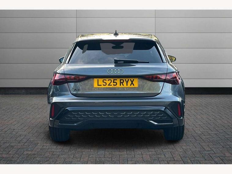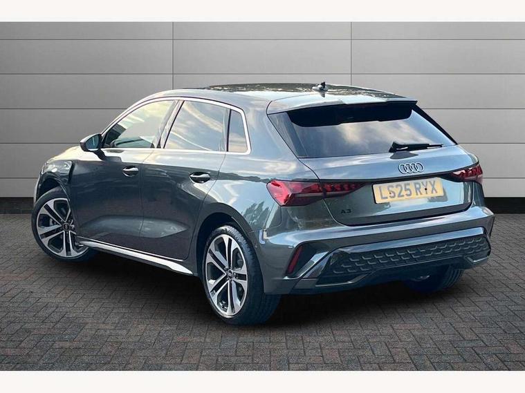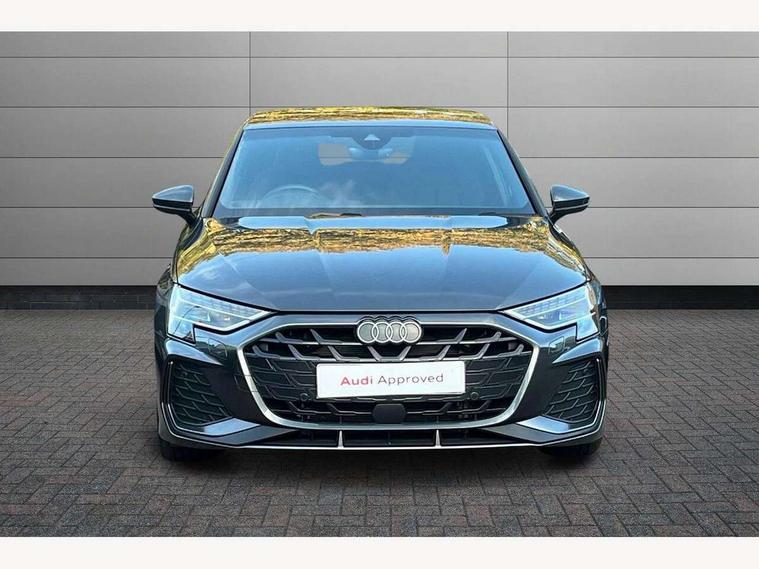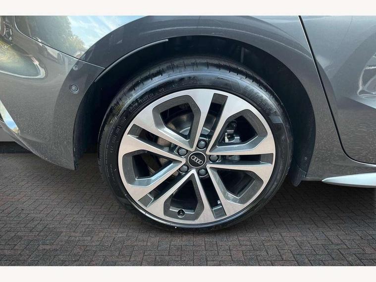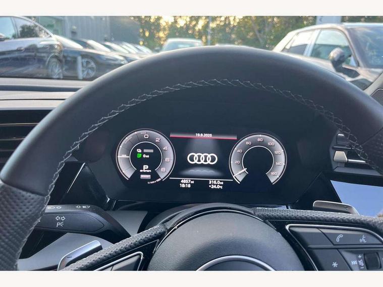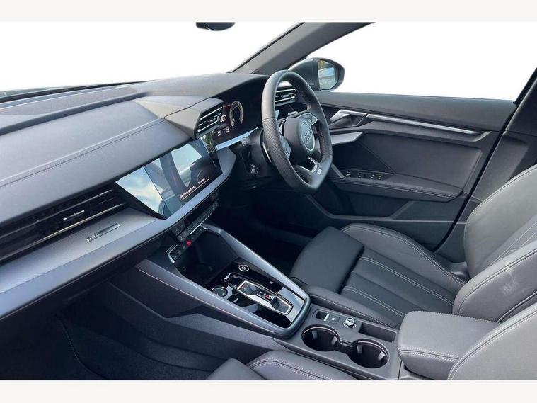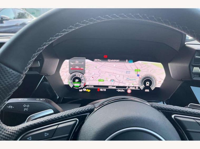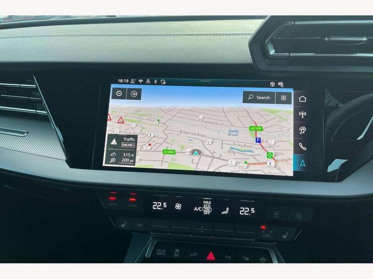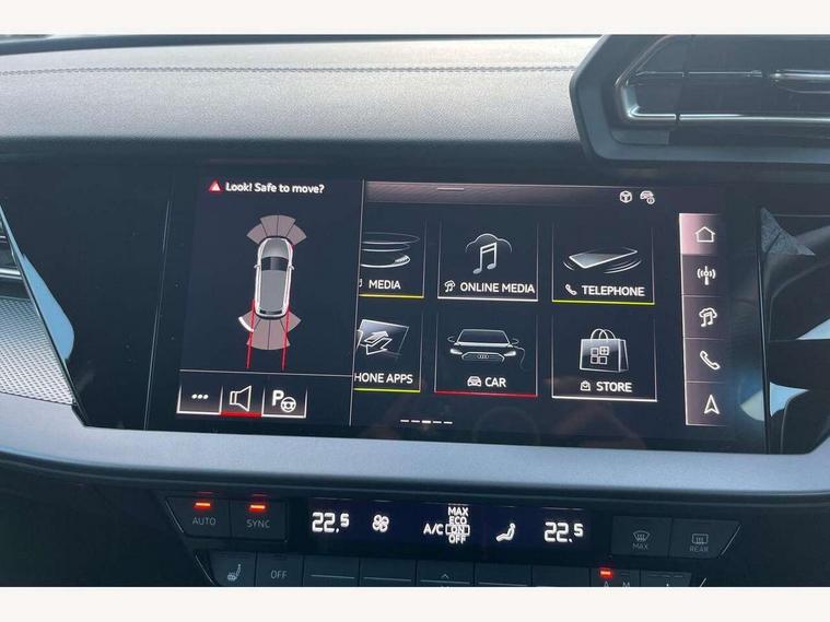Adjustable speed limiter, Audi drive select, Audi smartphone interface with app store includes wireless Apple carplay, Android auto and Amazon alexa integration, Audi virtual cockpit plus - 12.3" full HD resolution dynamic digital instrument cluster, Automatic start/stop system with recuperation, Bluetooth interface, Camera based traffic sign recognition, Collision avoidance assistant, Cruise control, Distraction and Fatigue warning, e-Call (emergency call), Electromechanical power speed sensitive steering, Lane departure warning system, MMI Navigation Plus with high resolution 10.1" colour touch screen display, Park Assist with parking system Plus, Service indicator, Trip computer, Voice control system with natural language interaction, 3 pin 10 amp domestic charging cable, CCS socket for DC charging, Charging cable for public charging, mode 3 (type 2), up to 22 kW (AC), Compact charging system, Industrial connector CEE 32 A, 230 V, length 1.6 m, Standard suspension, Type 2 socket for AC charging, Audi Phonebox light with wireless charging, Audi sound system - 10 loudspeakers including centre loudspeaker and subwoofer, DAB Digital radio, USB ports with charging function in the rear, Acoustic glass windscreen, Aluminium window trim, Auto dimming frameless rear view mirror, Body colour exterior mirrors, Chrome exhaust tailpipes, Electrically adjustable/heated/folding/auto dimming door mirrors with integrated LED indications + kerb view function for passenger side, Exterior model badging, Front and rear side air inlets in grained matt black with dark liquid chrome frame, Front electric windows, Front radiator grill in high gloss dark chrome, Heat insulating glass windscreen, Illuminated door sills with aluminium inserts at the front with S logo, LED 3rd brake light, LED daytime running lights, LED headlights with LED rear lights and dynamic rear indicators, Light and rain sensors, Privacy glass - dark tinted rear window, rear door and side windows, Rear diffuser and grill in grained matt black with inlay in dark liquid chrome, Rear electric windows, Rear side wing doors, Rear wiper, S line bumpers, S roof spoiler, Side S line emblems on front wings, Side sill trim in dark liquid chrome, 12V socket and storage compartment in front centre console, 3 seat bench in 2nd row, 3 spoke flat bottomed leather multifunction sport steering wheel with gear shift paddles, 3-zone deluxe automatic air conditioning, 4 way electrically adjustable lumbar support for driver and front passenger, 40/20/40 split folding rear seat bench, Black cloth headlining, Convenience auxiliary air conditioning, Front and rear centre armrest in artificial leather, Front and rear centre armrest in artificial leather with contrasting stitching on armrests and instrument panel, Front and rear headrests, Front/rear floor mats, Heated front seats, Height and reach adjustable steering wheel, Manual boot compartment lid, Manually adjustable front seats, Rear cup holders, S badging on the steering wheel, Seat side bolsters, Single front passenger seat, Stainless steel pedals and front footrest in black, Twin leather upholstery with front sports seats S embossed logo, Aluminium interior elements pack - A3 Sportback, Multi-coloured LED interior lighting package - A3, 3x3 point rear seat belts, Acoustic vehicle alerting system, Driver and front passenger airbag with passenger airbag deactivation, Electronic Stabilisation Control (ESC) including ABS, ASR and EDL, First aid kit with warning triangle and 2 safety vests, Front side airbags with head airbags and interaction airbag, Hill hold assist, Pre-sense front with pedestrian and cyclist detection, Seatbelt monitoring, Tyre pressure loss indicator, Anti theft alarm, Anti-theft wheel bolts, Electronically operated child locks, Immobiliser, Remote central locking with safelock, Dash & door Inlay in dark aluminium Spectrum, Tyre repair kit,