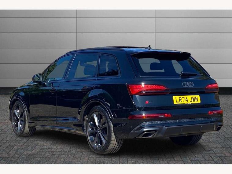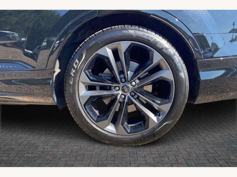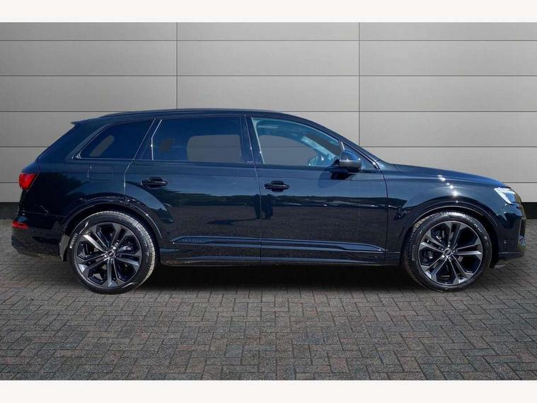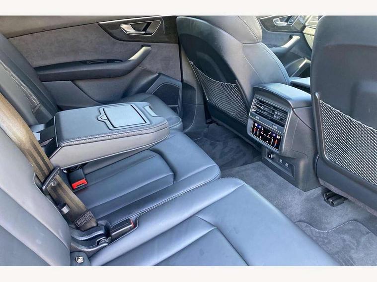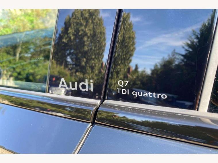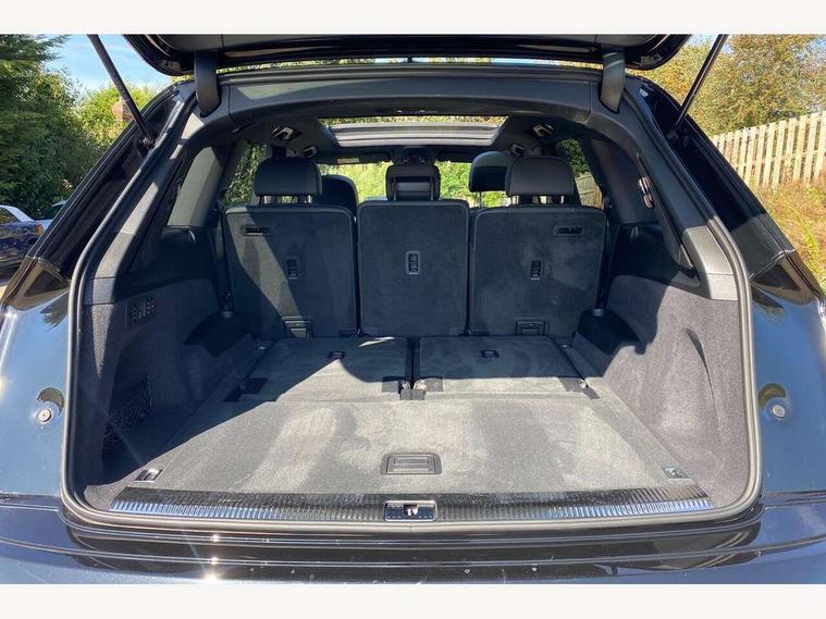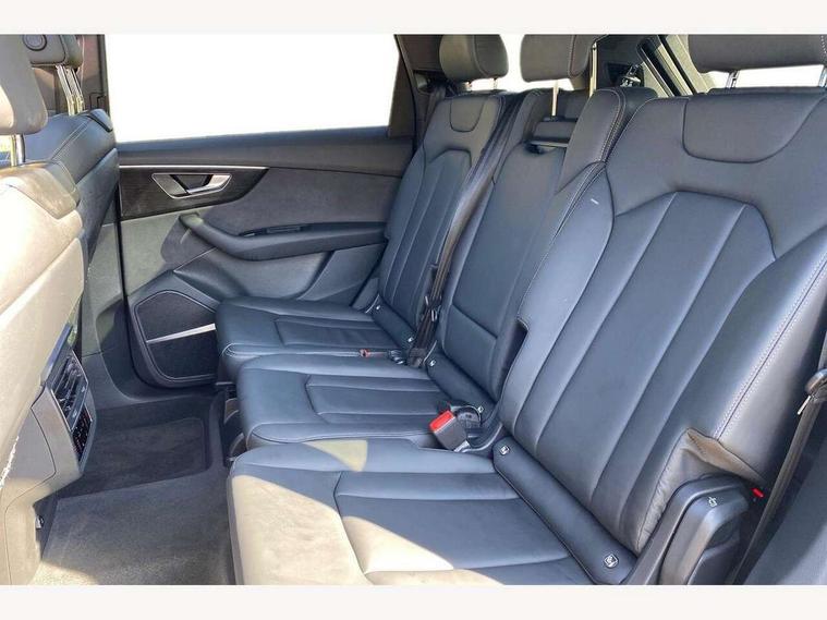 Audi connect safety and service (e-call), Audi connect with Amazon Alexa Integration, Audi drive select (Auto, Comfort, Dynamic, Efficiency, Individual, Off-road and All road), Audi phone box light with wireless charging, Audi virtual cockpit - 12.3" high-resolution LCD display with fully customisable instrument cluster, Bluetooth interface, Camera based traffic sign recognition, Electromechanical power steering, MMI navigation plus with MMI touch screens includes 10.1" and 8.6" screens with haptic feedback, Natural voice recognition, Operating buttons in Matte black, Parking system plus with 360 degree display (front, rear and side sensors) - acoustic and visual park assist system, Power operated tailgate, Rear view camera, Smartphone interface includes wireless Apple carplay/Android Auto, Start/stop system, 48V Mild hybrid technology, Adaptive air sports suspension, Quattro all wheel drive with self locking centre differential, Audi music interface - front 2 USB-C ports with charger and data functions, Audi sound system with 6 channel amplifier, 180 watt amplifying capacity and 10 loudspeakers including subwoofer, DAB digital radio module, Audi Beam uses LEDs to project S emblem with red rhombus onto the ground when opening the side doors (front/rear), Auto dimming frameless rear view mirror, Black exhausts, Black roof rails, Electrically adj heated/folding + automatically dimming exterior mirrors with memory + automatic kerb side function for passenger side exterior mirror, Heat insulating glass in windshield, Integrated LED indications in door mirrors, LED 3rd brake light, LED daytime running lights, LED rear tail lights, Loading edge protection in stainless steel, Matrix LED headlights with dynamic front and rear indicators, Privacy glass - dark tinted rear and rear side windows from B-pillar backwards, Rear side wing doors, Rear wiper, 2 seat bench in 3rd row, 2 zone automatic climate control, 3 seat bench in 2nd row, 7 seat layout with ISOFIX points for the front passenger seat and rear passenger seat, Black cloth headlining, Comfort front centre armrest, Electric adjustable front seat with 4 way lumbar support, driver memory functionality, Folding rear seats, Front head restraints, Front/rear floor mats, Heated front seats, Illuminated door sill trims with S logo, ISOFIX child seat mounting for front passenger seat and 2 outer rear seats with top tether child seat mounting for all 3 rear seats, LED interior ambient lighting, Luggage compartment cover, Luggage compartment sill protection in stainless steel, Rear head restraints, Single front passenger seat, Stainless steel pedals, Sunvisors with illuminated vanity mirrors, Black styling pack plus - Q7, 3 point seatbelts on all rear seats, Audi pre sense front, Child locks on rear doors, Convenience key with safelock and gesture tailgate, Driver and front passenger, front side and curtain airbags, Electromechanical parking brake, Electronic Stabilisation Control (ESC) including ABS, ASR and EDL, Extended pedestrian protection measures, Hill hold assist, Seatbelt reminder, Tyre pressure loss indicator, Warning triangle and first aid kit, Anti theft alarm with tow away protection, Anti-theft wheel bolts and wheel loosening detection, Keyless Go, Remote central locking, Polished oak trim with grey finish inlay, Tool kit, Tyre repair kit,
