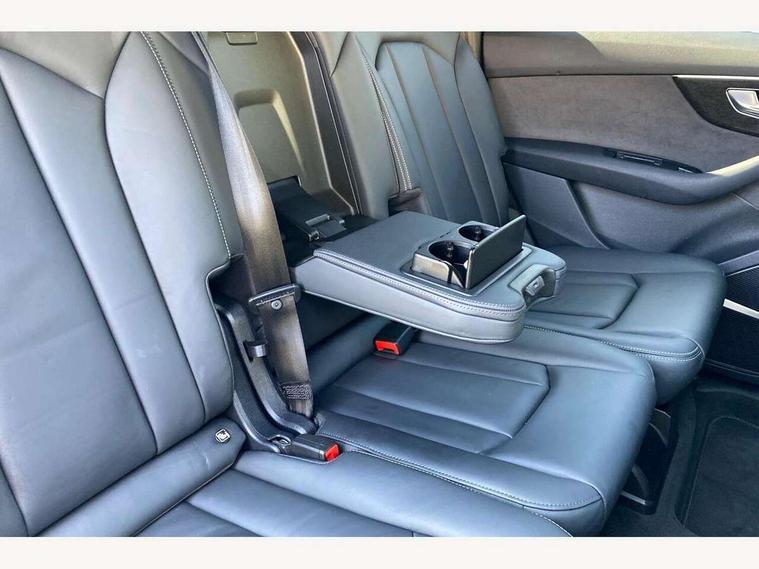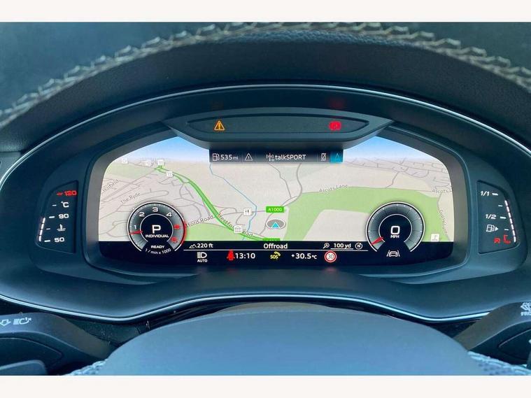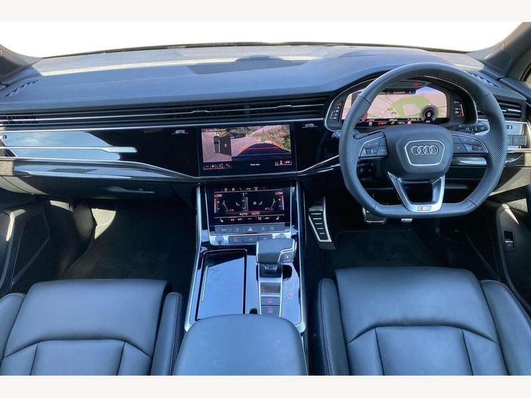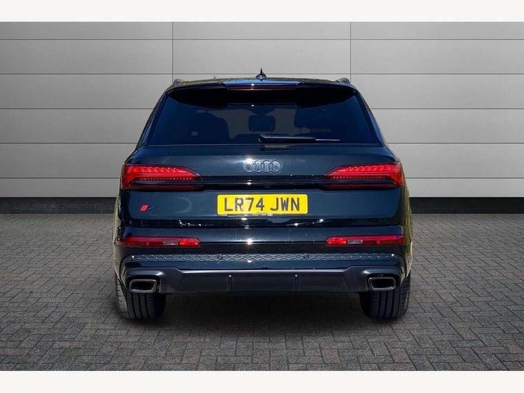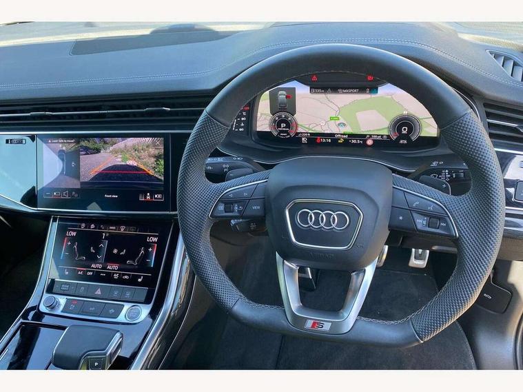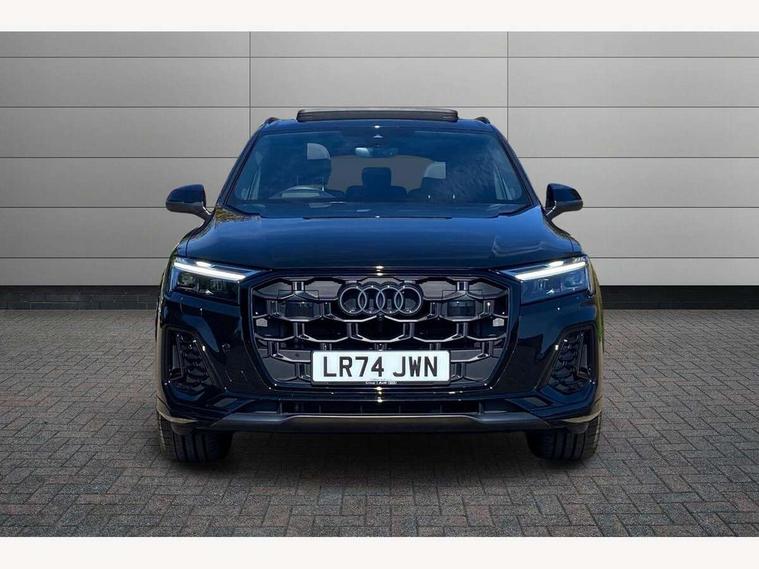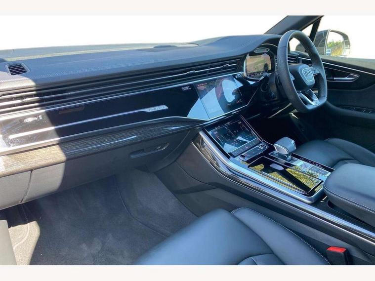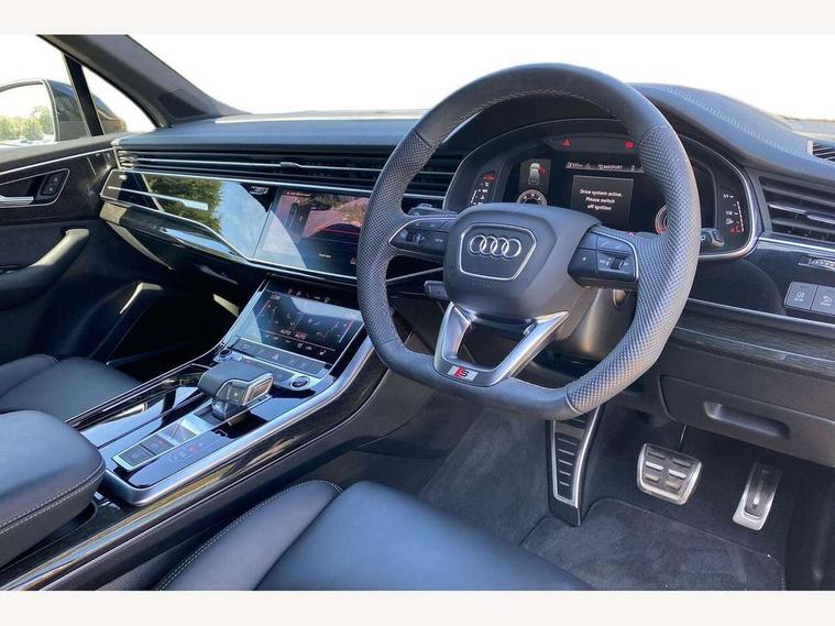 Audi connect safety and service (e-call), Audi connect with Amazon Alexa Integration, Audi drive select (Auto, Comfort, Dynamic, Efficiency, Individual, Off-road and All road), Audi phone box light with wireless charging, Audi virtual cockpit - 12.3" high-resolution LCD display with fully customisable instrument cluster, Bluetooth interface, Camera based traffic sign recognition, Electromechanical power steering, MMI navigation plus with MMI touch screens includes 10.1" and 8.6" screens with haptic feedback, Natural voice recognition, Operating buttons in Matte black, Parking system plus with 360 degree display (front, rear and side sensors) - acoustic and visual park assist system, Power operated tailgate, Rear view camera, Smartphone interface includes wireless Apple carplay/Android Auto, Start/stop system, 48V Mild hybrid technology, Adaptive air sports suspension, Quattro all wheel drive with self locking centre differential, Audi music interface - front 2 USB-C ports with charger and data functions, Audi sound system with 6 channel amplifier, 180 watt amplifying capacity and 10 loudspeakers including subwoofer, DAB digital radio module, Audi Beam uses LEDs to project S emblem with red rhombus onto the ground when opening the side doors (front/rear), Auto dimming frameless rear view mirror, Black exhausts, Black roof rails, Electrically adj heated/folding + automatically dimming exterior mirrors with memory + automatic kerb side function for passenger side exterior mirror, Heat insulating glass in windshield, Integrated LED indications in door mirrors, LED 3rd brake light, LED daytime running lights, LED rear tail lights, Loading edge protection in stainless steel, Matrix LED headlights with dynamic front and rear indicators, Privacy glass - dark tinted rear and rear side windows from B-pillar backwards, Rear side wing doors, Rear wiper, 2 seat bench in 3rd row, 2 zone automatic climate control, 3 seat bench in 2nd row, 7 seat layout with ISOFIX points for the front passenger seat and rear passenger seat, Black cloth headlining, Comfort front centre armrest, Electric adjustable front seat with 4 way lumbar support, driver memory functionality, Folding rear seats, Front head restraints, Front/rear floor mats, Heated front seats, Illuminated door sill trims with S logo, ISOFIX child seat mounting for front passenger seat and 2 outer rear seats with top tether child seat mounting for all 3 rear seats, LED interior ambient lighting, Luggage compartment cover, Luggage compartment sill protection in stainless steel, Rear head restraints, Single front passenger seat, Stainless steel pedals, Sunvisors with illuminated vanity mirrors, Black styling pack plus - Q7, 3 point seatbelts on all rear seats, Audi pre sense front, Child locks on rear doors, Convenience key with safelock and gesture tailgate, Driver and front passenger, front side and curtain airbags, Electromechanical parking brake, Electronic Stabilisation Control (ESC) including ABS, ASR and EDL, Extended pedestrian protection measures, Hill hold assist, Seatbelt reminder, Tyre pressure loss indicator, Warning triangle and first aid kit, Anti theft alarm with tow away protection, Anti-theft wheel bolts and wheel loosening detection, Keyless Go, Remote central locking, Polished oak trim with grey finish inlay, Tool kit, Tyre repair kit,