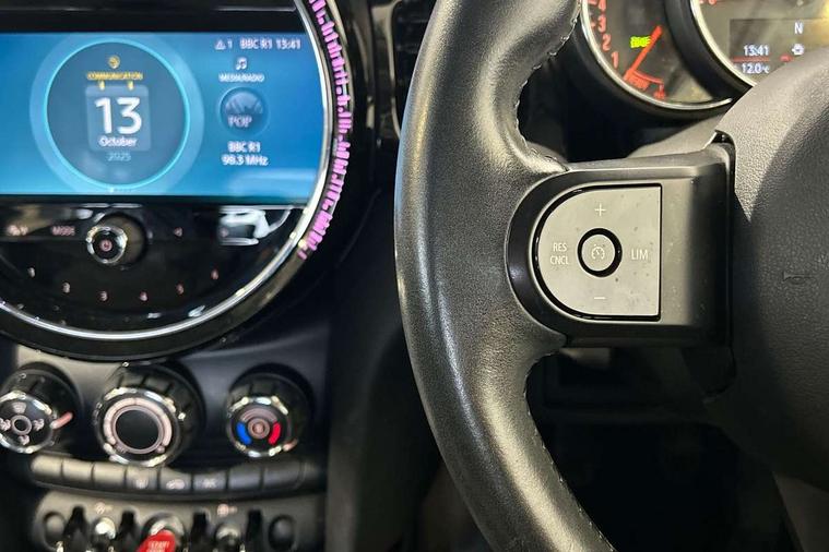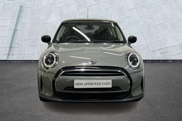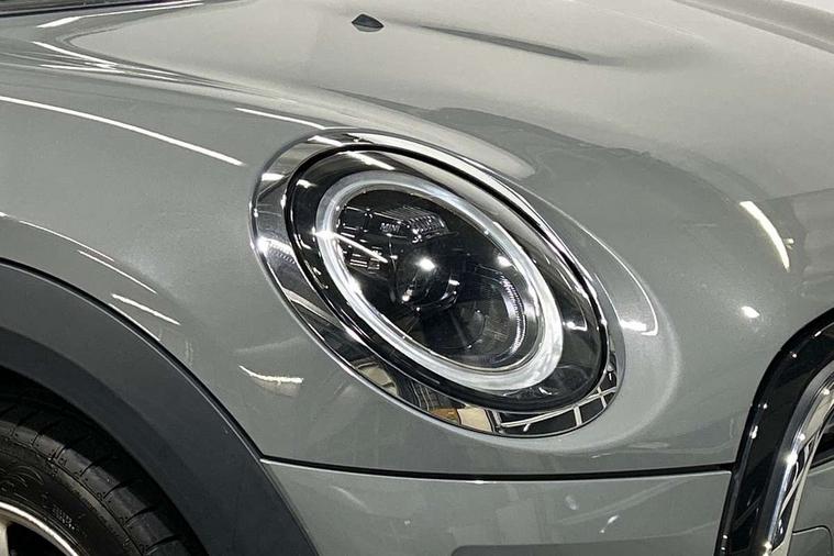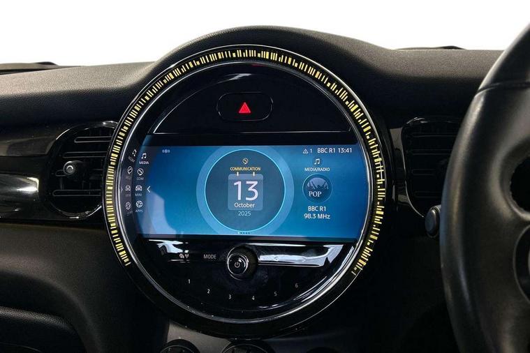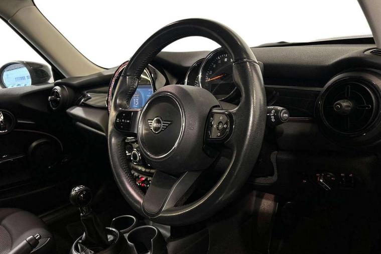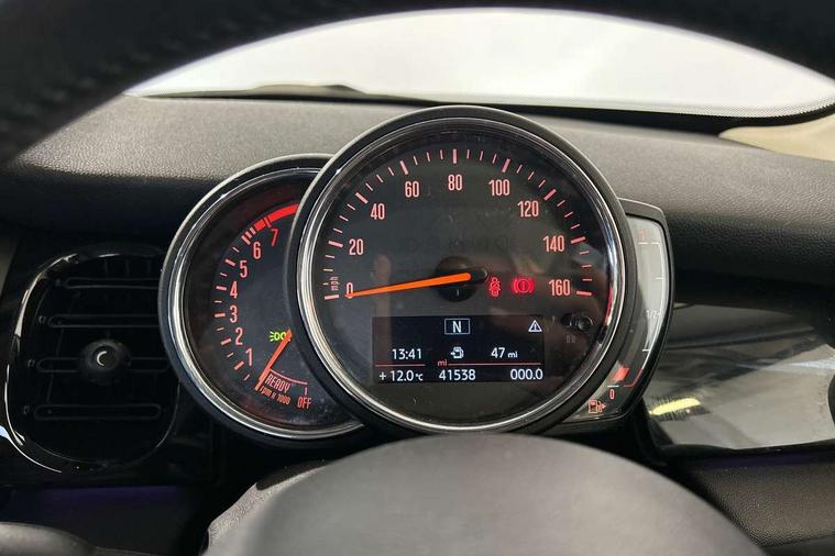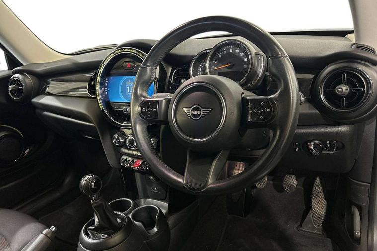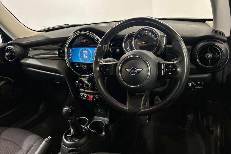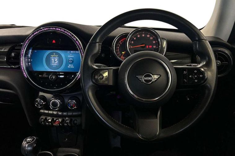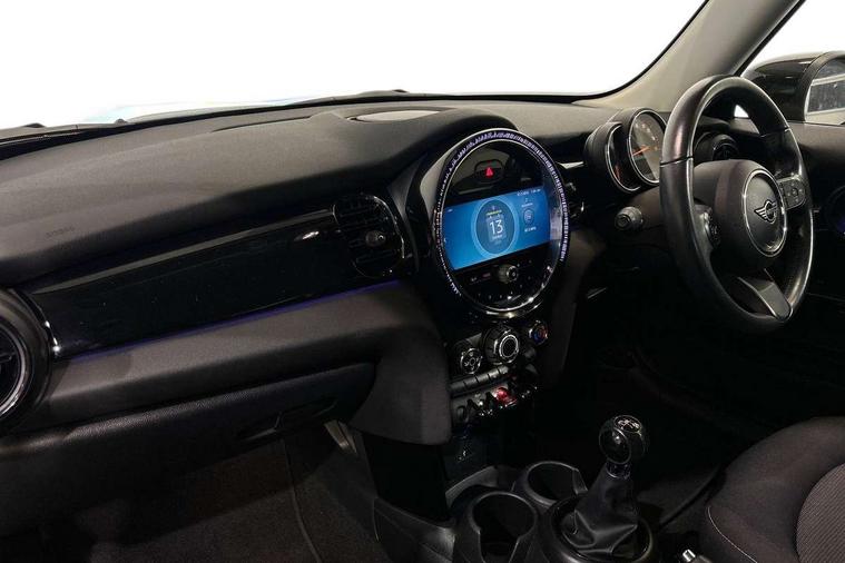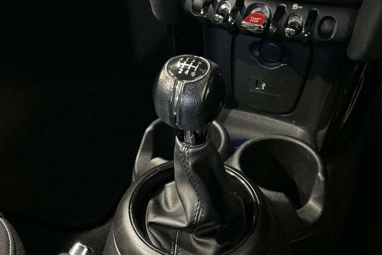 Automatic start/stop function with brake energy recuperation, Compatible mobile phone bluetooth with audio streaming, Cruise control with brake assist, Electro-mechanical speed dependant steering assistance, Flexible car sharing preparation, Instrument cluster, Mini E-call, MINI TeleServices, On board computer, Service interval indicator, 6 Speed manual transmission including gear change indicator display, Double Vanos system, Fully variable valve control, High precision injection, Performance Control, 4 speakers in front door trims and underneath front seats, 8.8" touchscreen with LED ring, FM tuner and DAB digital radio, Automatic headlight activation switch, Body colour fuel filler cap, Chrome border high gloss black slats radiator grille, Dynamic brake lights, Electric front windows, Exhaust tailpipe on left with chrome finisher, Heated rear window, Heated windscreen washer jets, LED headlight with closed ring and daytime driving lights, Metal door sill strips with MINI imprint, Model logo Cooper on right of tailgate, Rain sensor window wipers, Rear fog lights, Rear LED lights with union jack design, Rear window wiper, Side scuttle panel with integrated indicator, Sun/heat protection glass, White indicator lenses, 12V Accessory socket in centre console, 4 lashing eyes in luggage compartment, 60/40 split folding rear seat, Ambient lighting, Carbon black colour line - Knee roll and door armrest, Chrome interior highlights, Cupholders, Front and rear head restraints, Front and rear isofix with front passenger airbag deactivation, Glove compartment, Height and length steering column adjustment, Interior lighting with 12 different colours across the dashboard, underneath door bezel with illuminated laser-engraved design on central display, Leatherette gearshift lever and handbrake gaiters, LED reading lights, vanity mirror lights, front foot well light and spotlight on front seats, Manual air conditioning, Mechanical seat adjustment - forward/back & backrest for front seats and driver seat height adjust, Multifunction steering wheel, Passenger seat height adjuster, Satellite grey headlining including grab handles and clothes hooks, Sport leather steering wheel with speed limiter and audio/communication controls, Storage compartments in doors, Sunvisors with vanity mirrors, Velour floor mats, 3 point seatbelts on all four seats, 6 Airbags - front, side, head and seat belt tensioners, Anti-lock braking system (ABS), DSC - Dynamic Stability Control, Front and rear disc brakes, Single tone fanfare horn, Tyre pressure monitoring system, Alarm system with tilt sensor, monitoring doors, bonnet interior and tailgate, Electronic vehicle immobiliser, Start/stop toggle with keyless go, Piano black interior trim, Tool kit, Tyre repair kit,