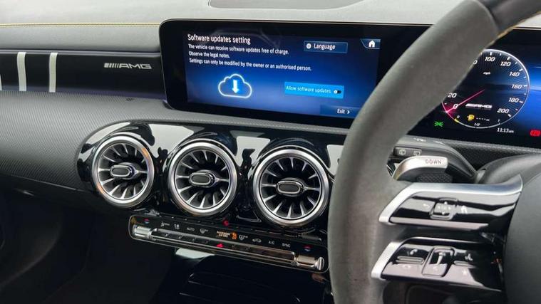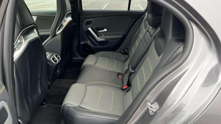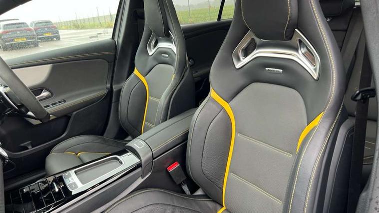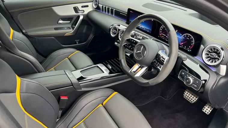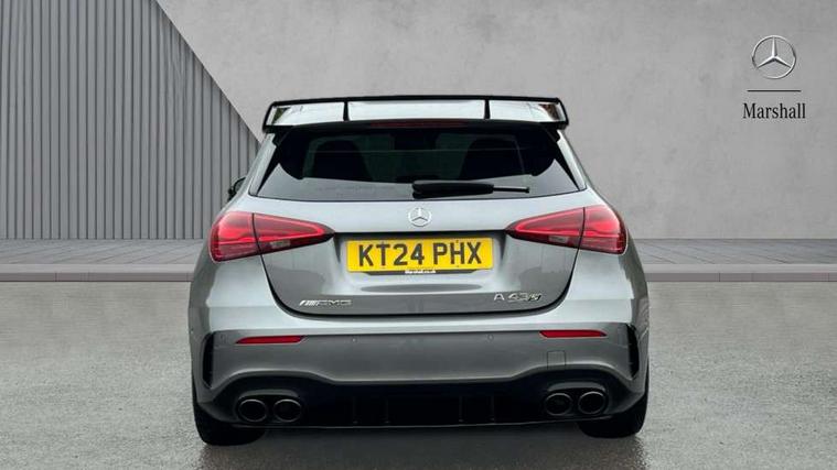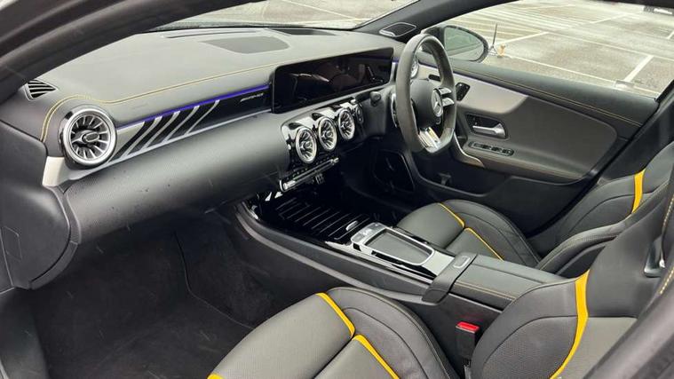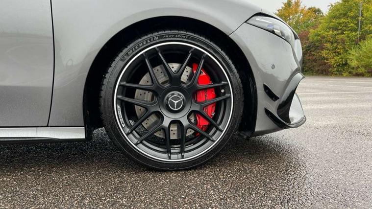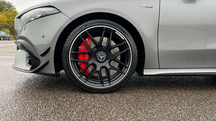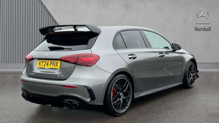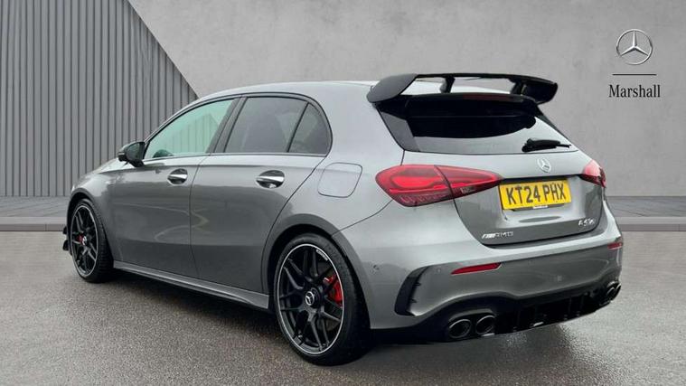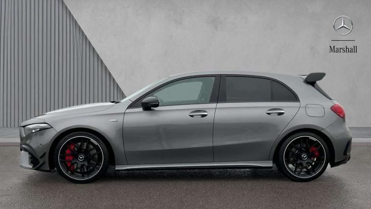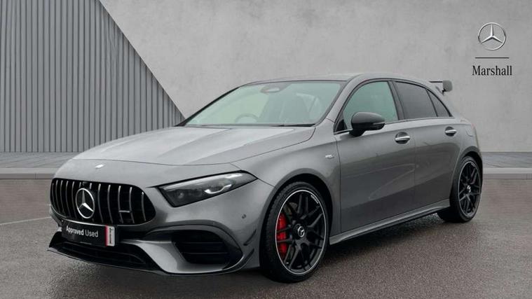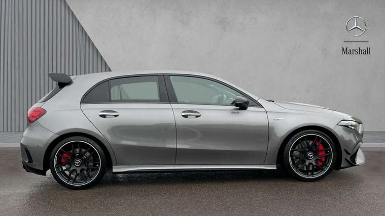 10.25 inch touchscreen central media display with AMG specific, AMG start up logo, visualisation of the AMG drive programs, vehicle and engine data, 10.25" Digital instrument cluster display screen, AMG DYNAMIC SELECT with drive modes(Slippery, Comfort, Sport, Sport+, Individual and Race) incl drift mode via steering wheel shift paddles+Race Start, AMG menu with sporty additional information - Gear indicator with yellow M symbol manual mode, Warm Up menu and Set Up menu, AMG speed sensitive steering with two sets of steering characteristics, Attention assist, Brake pad wear indicator warning light, Car wash mode, Direct steering, Dual bluetooth interfaces, ECO start/stop function, Engine start/stop button, Fluid level warning indicator for fuel, oil, coolant and washer fluid, Fluorescent jacket for driver, Hard-disk navigation, Head up Display, Hey Mercedes Voice activation, Lamp failure indicator, MBUX augmented reality for navigation, MBUX Interior assistant, Mercedes me connect including emergency call system, accident recovery, breakdown and maintenance management, Mercedes me remote services, Outside temperature gauge, Owners manual in English, Pre-installation of private car share, Preinstallation for Mercedes Benz link, Remote boot closing, Service indicator (ASSYST), Smartphone integration with Apple CarPlay and Android auto, Speed sensitive power steering, Tailgate, Traffic sign assist, Trip computer in multifunction display with current consumption indicator, Wireless charging, AMG performance 4MATIC+ with torque control, AMG suspension including AMG specific axles and sporty spring/damper setup, Suspension with adaptive damping system, Burmester surround sound system (590W) with Dolby atmos, speakers - 1 center+4 doors+2 in C pillars, tweeter, subwoofer, DSP amp, burmester lettering, DAB Digital radio, MBUX multimedia system, 4 Electric Front and Rear windows, Adaptive brake lights, AMG A45 S bodystyling -rear apron, four vertical fins, side sill panels, roof spoiler lip, specific front apron, diffuser look and S label on boot lid, AMG real performance exhaust sound system, AMG specific radiator grille in high gloss chrome with AMG lettering, Beltline strips in High gloss Black, Body colour bumpers, Body colour door handles with chrome inserts, Body colour side skirt, Electric adjustable and heated door mirrors with integrated LED side indicators, Headlamp assist automatic headlamp activation, Heat insulating dark tinted rear and rear side windows, Heated glass rear windscreen + timer control, LED daytime running lights, LED High level third brake light, LED tail lamp, Multibeam LED headlamps with adaptive highbeam assist and cornering function, Panoramic sliding sunroof, Privacy glass, Radio aerial, Rain sensing windscreen wipers with two sensitivity settings, Rear fog lights, Rear side wing doors, Rear windscreen wiper, Surround lighting with logo projection, Two round twin tailpipe trim elements each measuring 90 mm in diameter and AMG lettering plus ribbing on the inside of the pipe, Valve control dependent on drive program, Wider wheel arches for AMG wheels, Window line trim strip in black, 3 seat bench in 2nd row, 3 Spoke flattened lower section sporty design AMG Performance steering wheel in nappa leather/microcut microfibre, 40:20:40 split folding rear seats, Air conditioning - Two zone thermotronic luxury automatic climate control with display, AMG brushed stainless steel sports pedals with rubber studs, AMG centre console finished with trim in silver chrome, AMG floor mats, AMG performance seats, AMG sporty centre console with raised front section and integral control switched for manual transmission mode, AMG steering wheel buttons, Automatic child seat recognition sensor, Black air vents with surround in silver chrome, Black roof lining, Electrically adjustable front memory seats including lumbar support and backrest inclination, Front centre armrest with stowage, Front seat head restraints, Heated front seats, Height/reach adjustable steering column, Illuminated AMG front door sills with changeable cover, Interior lighting - 64 colour Ambient lighting, Interior mirror with reading lamps in black and frameless, Rear armrest with 2 cupholders, Rear head restraints, Seat occupancy sensor for front passenger seat, Silver coloured aluminium gear shift paddles on steering wheel, Single front passenger seat, Stowage compartment in centre console with retractable cover, Sunvisors with illuminated vanity mirrors, Twin front cupholders, Aerodynamic pack - A Class, AMG Driver's pack - A Class, AMG night pack - A Class, AMG performance high-end seat pack - A Class, Light and sight pack - A Class, Mirror package - A Class, Multi-contour seat pack - A Class, Parking pack with 360 degree camera - A Class, Seat comfort pack - A Class, USB pack plus - A Class, 3 rear 3 point seatbelts, 3 stage electronic stability programme, ABS with Brake Assist, Active bonnet, Adaptive brake assist with hold function and hill start assist, AMG high performance brake system with red painted brake callipers and black AMG lettering at the front, ventilated and perforated brake discs, Black seatbelts, Bonnet with power domes, Childproof locks manually operated for rear doors and electrically operated for rear power windows, Crash responsive emergency lighting, Driver and passenger head and side airbags, Drivers knee airbag, Dual stage driver/passenger airbags, Electronic parking brake, ESP curve dynamic assist, ESP with ASR, Exit warning, Front and rear seatbelt reminder, ISOFIX and top tether child seat fixing points in two outer rear seats, Tyre pressure monitoring system, Warning triangle and first aid kit, Window airbags, Alarm system/interior protection/immobiliser, Guard 360 degree vehicle protection, Keyless entry lock/unlock, Keyless Go, Remote central locking and crash sensor with emergency opening function, Aluminium AMG design black/silver interior trim, 19" AMG cross spoke forged wheels 