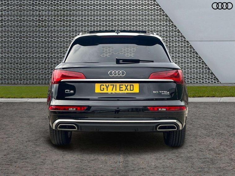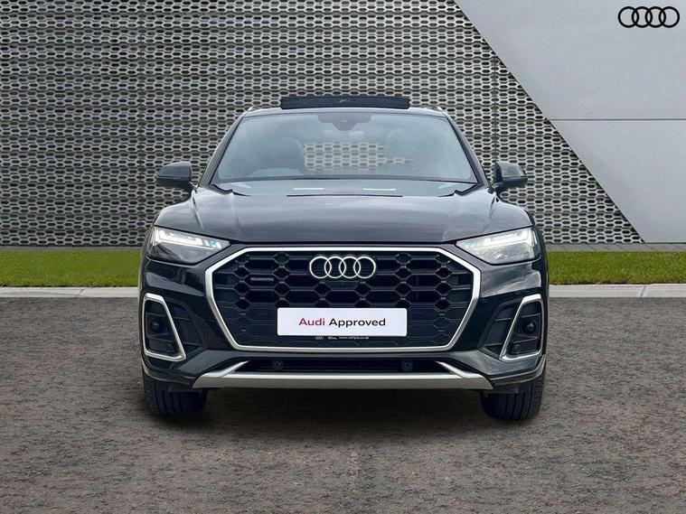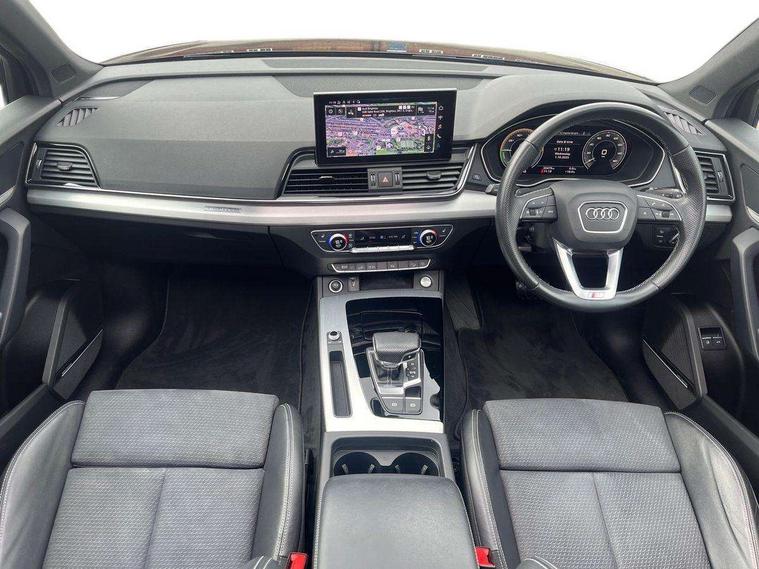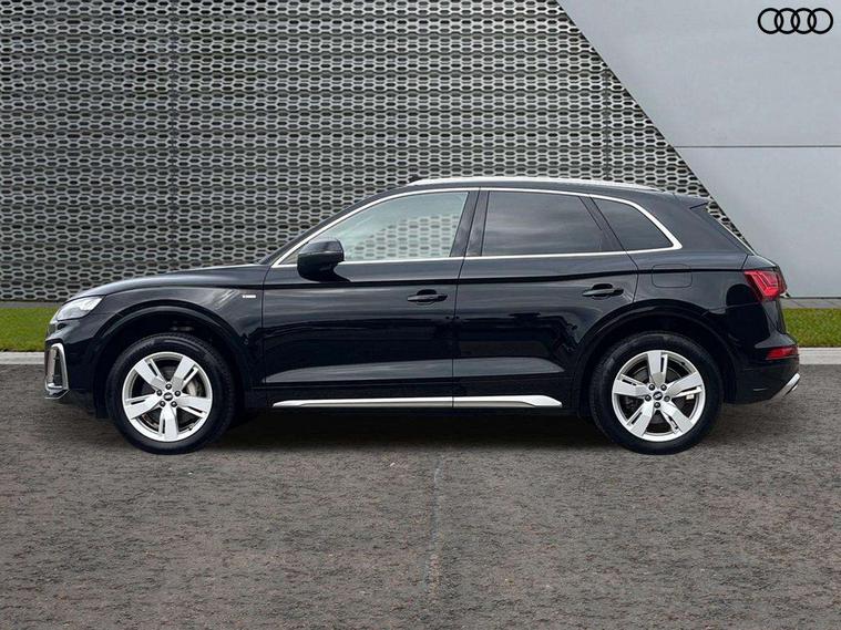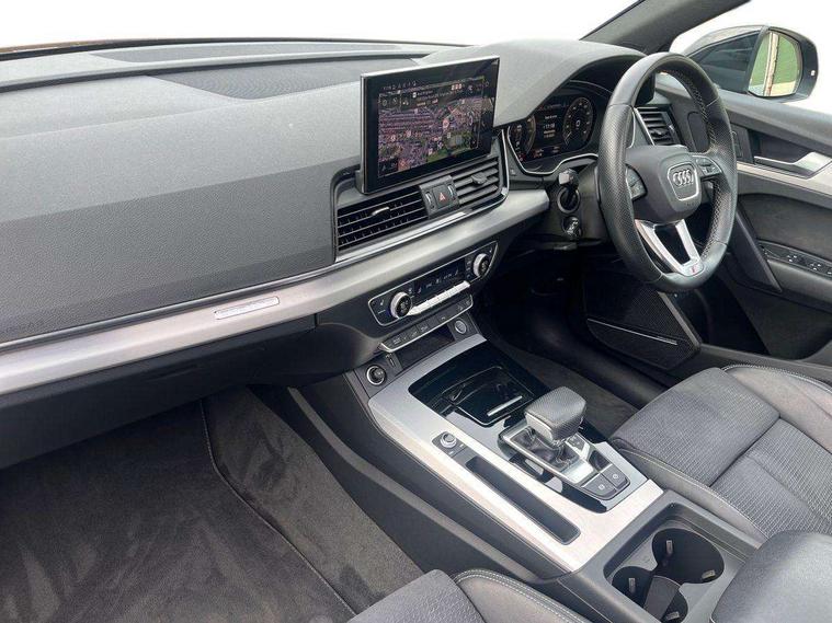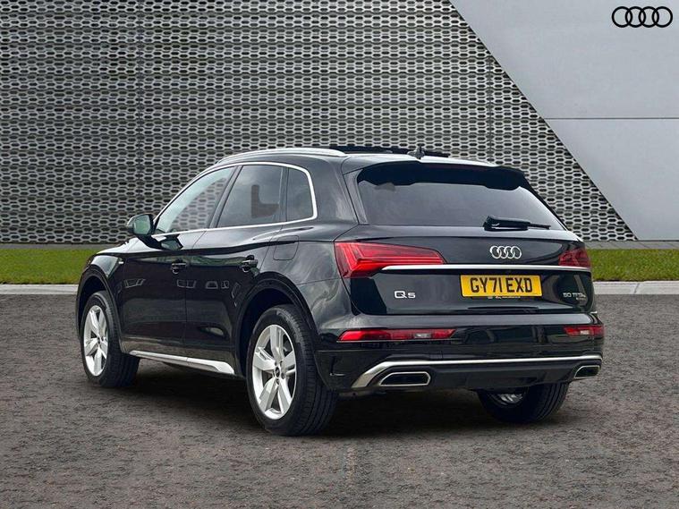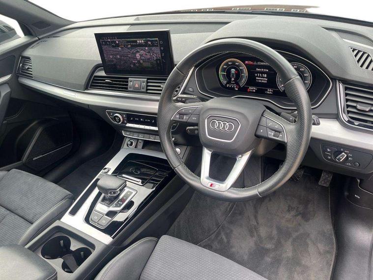 Audi connect safety and service (e-call), Audi connect with Amazon Alexa Integration, Audi drive select, Audi virtual cockpit plus with 12.3" screen and three different layout designs, Audi wireless smartphone interface, Automatic start-stop system with coasting functionality and efficiency programme, Bluetooth interface, Electro - mechanical power assisted steering, MMI navigation plus with 10.1" touch screen, Power tailgate, Reversing camera, Service interval indicator, Voice control system with Audi hotword activation "Hey Audi", 3 pin 10 amp domestic charging cable, Dynamic suspension, Quattro on demand, Type 2 mode 3 22kW 32 amp charging cable, Type 2 socket for AC charging, 2 x USB charging port with aux input socket, DAB Digital radio, Acoustic windscreen, Aluminium roof rails, Audi matrix LED headlights with dynamic front and rear indicators, Auto dimming rear view mirror, Automatic headlights and windscreen wipers, Body colour bumpers, Body colour door mirrors, Body colour rear diffuser with matt aluminium silver surrounds, Body colour underbody protection, Chrome plated exhaust trims, Door sills in Selenite silver, Electric adjustable/heated/folding door mirrors, Front air inlet surrounds in aluminium, Front and rear electric windows, Front radiator grille in honeycomb design, Headlight washers, Lower bumpers painted in contrast Manhattan grey, Rear chrome trim strip below lights, Rear privacy glass and rear side windows, Rear spoiler, Rear wiper, Roof bars, S Line badges on the front wings, S Line front and rear bumpers, S Line side skirts, 3 rear headrests, 40:20:40 split folding rear seat with rear centre armrest, Black cloth headlining, Comfort front centre armrest, Contrast stitching on seats, steering wheel and gear lever gaiter, Deluxe 3 zone electronic climate control, Front/rear floor mats, Gear lever in black leather, Heated front seats, Height adjustable front head restraints, Height/reach adjustable steering column, Illuminated door sill trims with S logo, ISOFIX child seat mounting and top tether, Manual seat adjustment with 4-way electric lumbar support, Rear seat bench plus, Sunvisors with vanity mirrors, Trunk roller cover, High gloss pack - Q5, LED interior light pack - Q5, 3 point seatbelts on all seats, 6 airbags - Driver, front passenger, curtain and side airbags, Electrically operated child locks on rear doors, Electromechanical parking brake, Electronic stabilisation control including ABS, ASR and EDL, Front passenger airbag deactivation, Hill descent control, Hill hold assist, Multi collision brake assist, Pop-up bonnet for pedestrian protection, Pre sense city, Seat belt force limiter, Seatbelt monitoring, Tyre pressure warning, Warning triangle and first aid kit, Anti theft alarm, Anti-theft wheel bolts, Keyless Go access/ignition system, Matt brushed aluminium inlays, Tool kit, Tyre repair kit,
