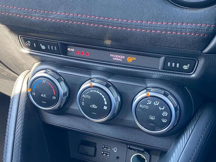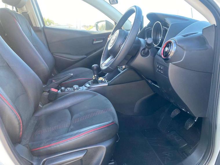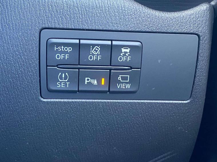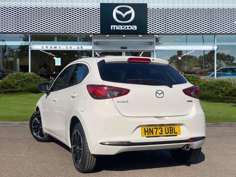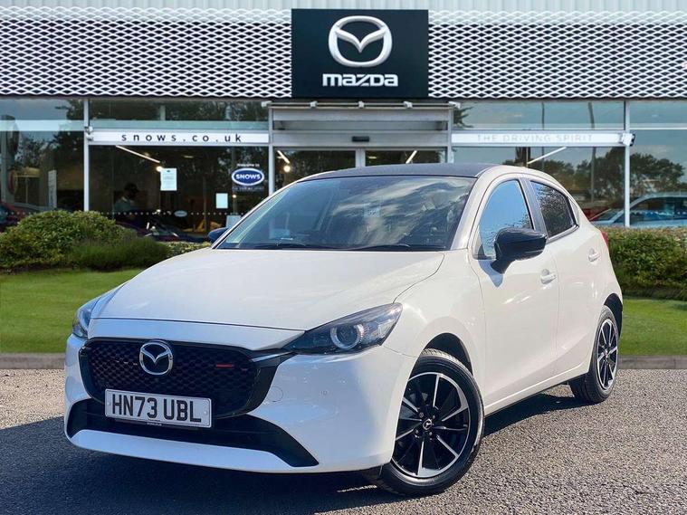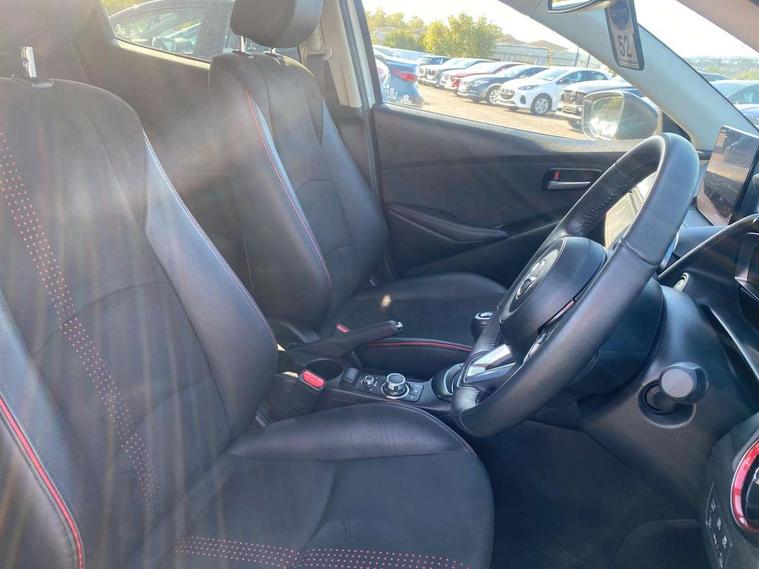 Adjustable speed limiter, Analogue rev counter, Cruise control, Digital instrument cluster, Digital speed display meter, E-call, Emergency stop signalling system, Engine start/stop button, Integrated bluetooth, Lane departure warning system, Lane keep assist, Mazda connect with 8" colour touch screen, Navigation system, PAS, Service indicator, Tailgate, Trip computer, Wireless Apple CarPlay and wired Android Auto, i-stop, Mazda M hybrid, AM/FM/DAB radio with 6 speakers with USB and AUX inputs, Multimedia Commander including separate volume dial, Steering wheel mounted audio/bluetooth controls, Auto dimming rear view mirror, Auto headlight levelling, Black carbon effect roof, Black door mirrors, Black Shark-fin antenna, Body coloured front bumper with black lower bezel, Body coloured rear bumper with black lower mouldings and red accent, Chrome exhaust tailpipes, Coming/leaving home lighting function, Dusk sensing headlights, Electric adjustable/heated/folding door mirrors, Electric front/rear windows with one touch auto up/down for driver's window, Front honeycomb grill with red accent, Gloss black finish signature wing, Heated rear window, LED indicator lights, LED third brake light, Privacy glass, Rain sensing front wipers with adjustable sensitivity and speed, Rear side wing doors, Rear wiper, Signature LED daytime running lights, 3 seat bench in 2nd row, 60/40 split rear seats, Black/red air vent accents, Climate control air conditioning, Driver, Front passenger and two rear grab handles with coathooks, Drivers seat manual slide recline and height adjustment, Drivers/front passengers covered vanity mirrors and drivers ticket holder, Front centre storage with two cupholders, Front head restraints, Front passenger and driver door pockets, Front passenger seat manual slide, recline and height adjust, Front passenger seatback pockets, Gear shift indicator, Glovebox, Heated front seats with 3 stage setting, Heated leather steering wheel, Interior courtesy light with integrated spotlight, ISOFIX child seat anchorage points attached on outer rear seats, Leather gear knob, Leather handbrake, Leather/Cloth upholstery, Luggage compartment light, Single front passenger seat, Three height adjustable rear head restraints, Tilt/telescopic adjustable steering wheel, Driver Assistance pack - Mazda 2, 2x3 point front seatbelts with pre-tensioners, 3 point seatbelts on all rear seats, Anti-lock braking system (ABS), Collision mitigation braking system, Dynamic stability control + Traction control, ESP, Front and rear curtain airbags, Front driver, passenger and rear seat seatbelt warning, Front dual stage driver and single stage front passenger airbags, Front side airbags, Front smart city brake support, G-Vectoring control plus, Hill launch assist, Manual child lock in rear doors, Passenger airbag cut-off switch, Tyre pressure monitoring system, Deadlocking system, Power door locks, Remote central locking, Smart keyless entry, Thatcham accredited alarm and immobiliser, Black soft touch dashboard panel with red stitching colour coordination, 16" Black metallic machined alloy wheels, Emergency tyre repair kit,