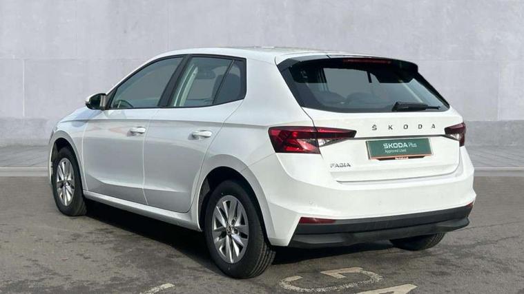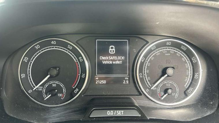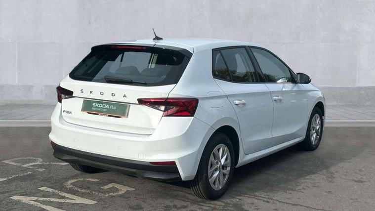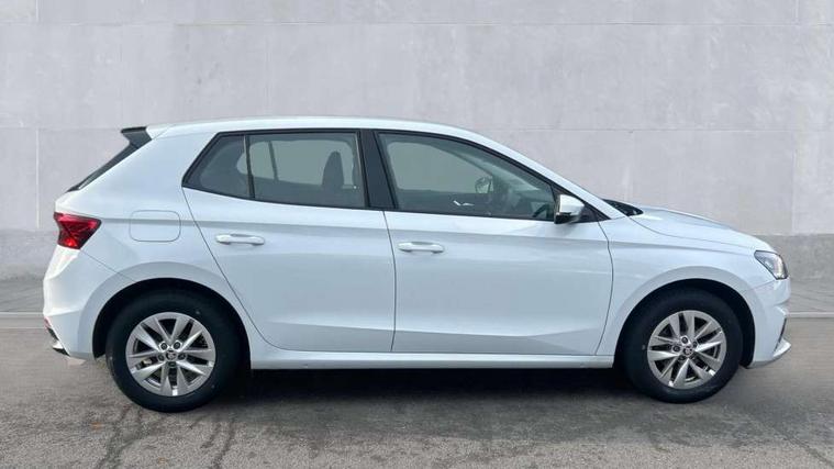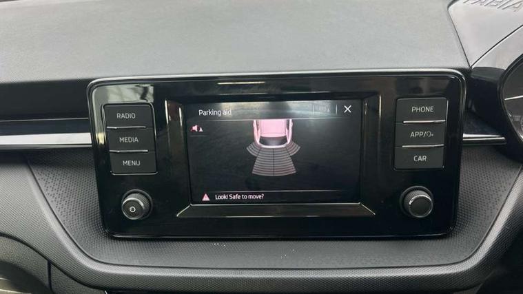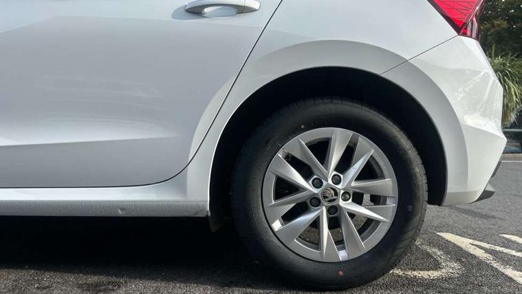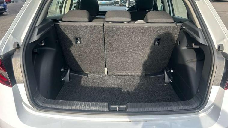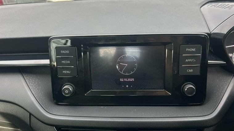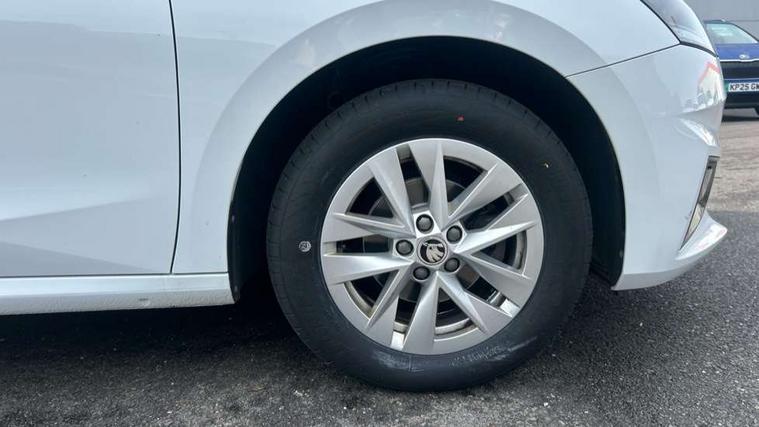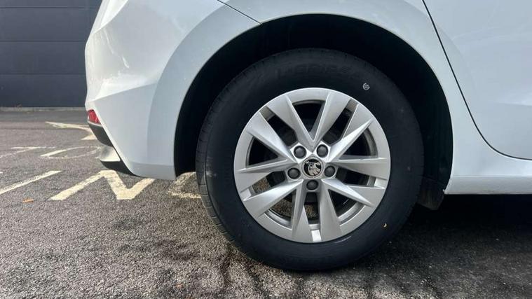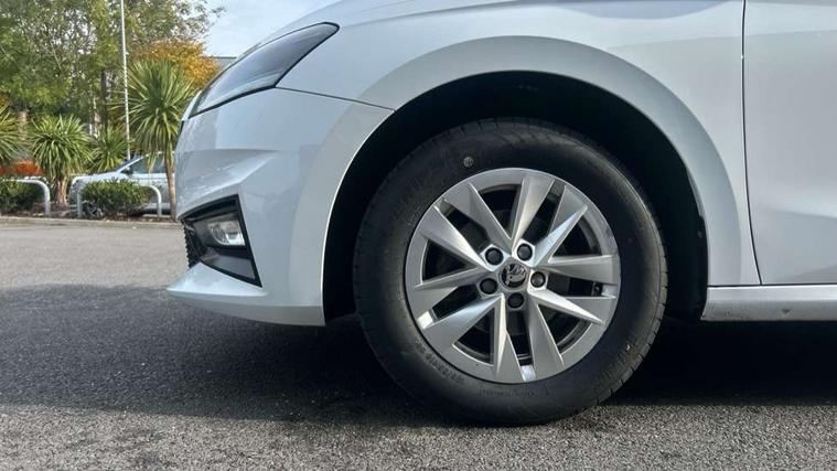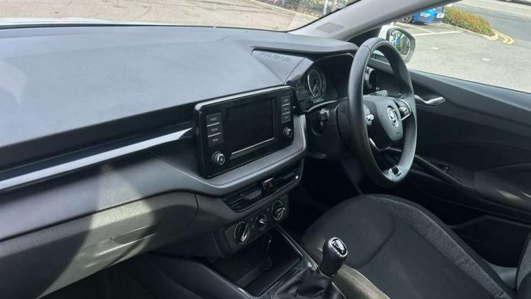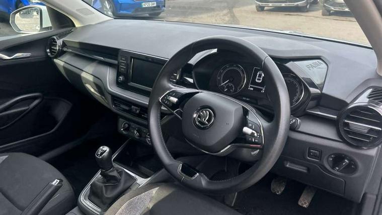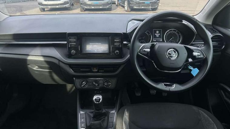 Bluetooth connection, Driver alert system - DAS, Electromechanical power steering, Exterior temperature gauge, Lane assist including road edge detection, Multifunction trip computer in black and white, Service interval indicator, Speed limiter, 2x USB-C in the front (for data transmission and charging), 4 speakers in front, Auxiliary socket for external MP3 player, DAB digital radio reception, Radio Swing with 6.5" colour display, Basic LED Headlights, Basic rear lights, Body colour door mirrors, Body coloured bumpers, Dimming rear view mirror with black frame, Door mirror integrated indicators, Electrically adjustable and heated door mirrors, Electrically adjustable front windows with function auto up/down, Front fog lights, Front window wiper intermittent control, Headlight range control - Automatic, Ice scraper in fuel cap, LED daytime running lights with coming and leaving home feature, Mechanical adjustable rear windows, Rain sensor, Rear LED fog light, Rear side wing doors, Rear window wiper with washing nozzles, Roof mounted spoiler, SKODA tailgate lettering in chrome, Third brake light, 2 reading lights in front and 2 reading lights in rear, 2 spoke leather multifunction steering wheel, 3 rear headrests, Backrest split and folding, Central console with fixed cup holder and storage box, Chrome handbrake release button, Fabric upholstery, Gearshift knob/handle in leather, Grain satin black interior door handles, Hand brake lever handle in leather, Height adjustable front headrests, Height adjustable front seats, Height adjustable steering wheel, ISOFIX and TopTether anchorage points to the outer rear seats, ISOFIX and TopTether on the front passenger seat, Luggage compartment lighting, Manual air conditioning, Manually adjustable lumbar support in front seats, Pollen filter, Rear seat bench unsplit, Single front passenger seat, Storm grey headlining, Sun visors with mirror and airbag label on passenger side, Ticket holder, 3-point height adjustable front seats belts with pretensioner and force limiter, Automatic warning lights in case of crash, Driver and passengers airbag with switch off function, e-Call+, ESC including ABS, MSR, ASR, EDS, HBA and XDS, Front and rear seat belt warning, FRONT ASSIST (AEB City and AEB Inter Urban), Front side airbags, Head airbags, One tone horn, Pedestrian protection, Three rear 3-points safety seat belts with pretensioner and force limiter including stop function for outer rear seat belts, Tyre pressure monitoring system, Anti-theft alarm system including immobiliser, interior monitoring, backup horn, and towing protection, Central locking with radio remote control, interior controls, SAFE function and 2 foldable keys, Black painted air vents, Glossy black decorative trim, Grain satin black central console cover, Grain satin black lower decorative trim, Satin black door and side trim panel in front, Anti-theft wheel bolts protection, Super-low rolling resistance tyres,