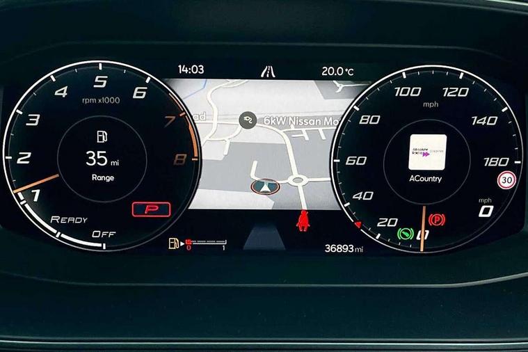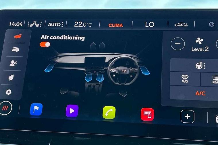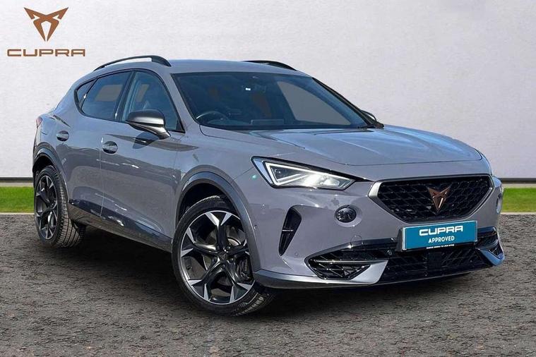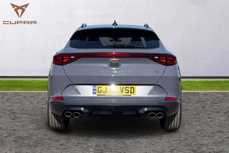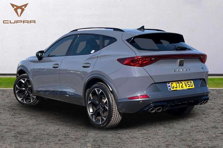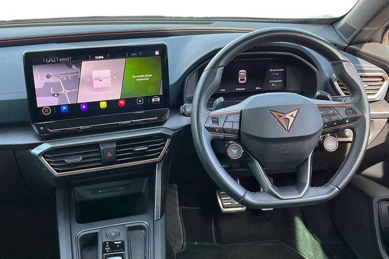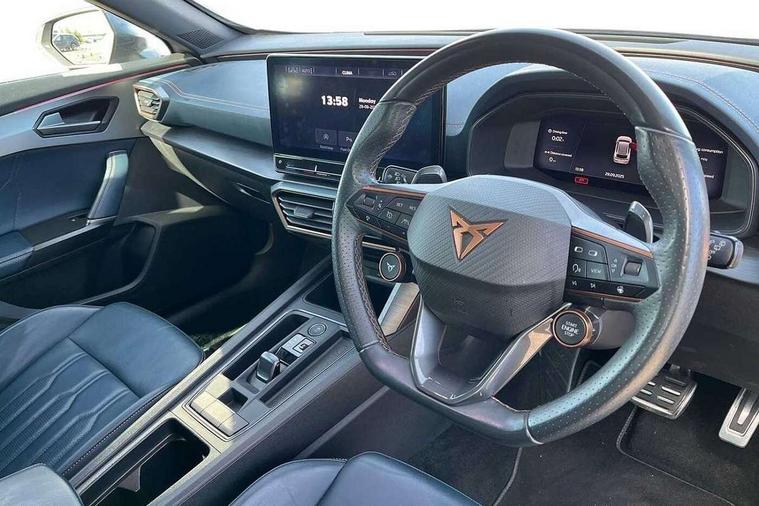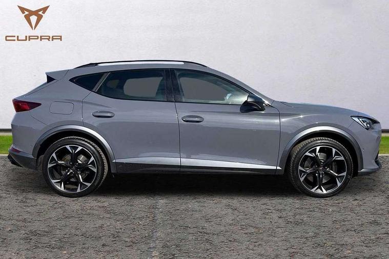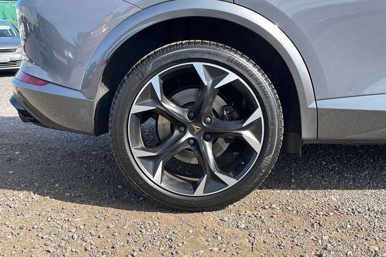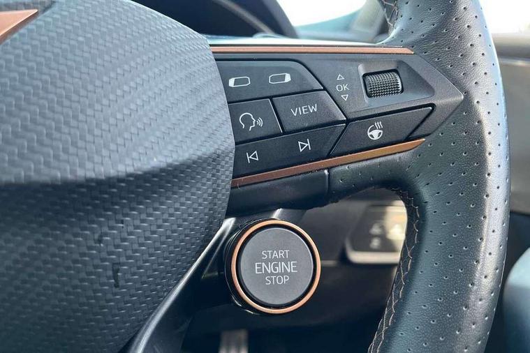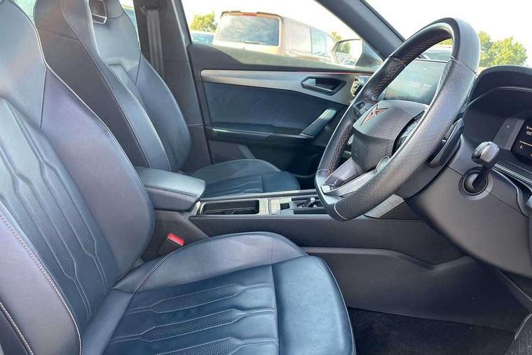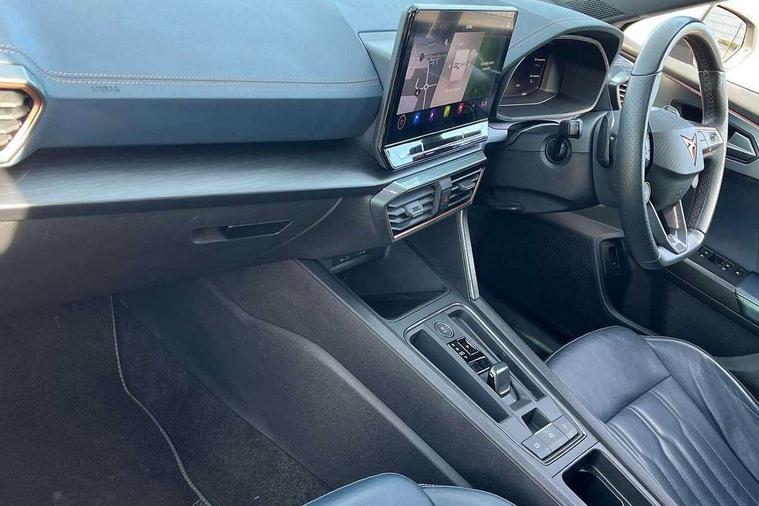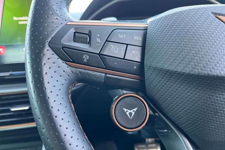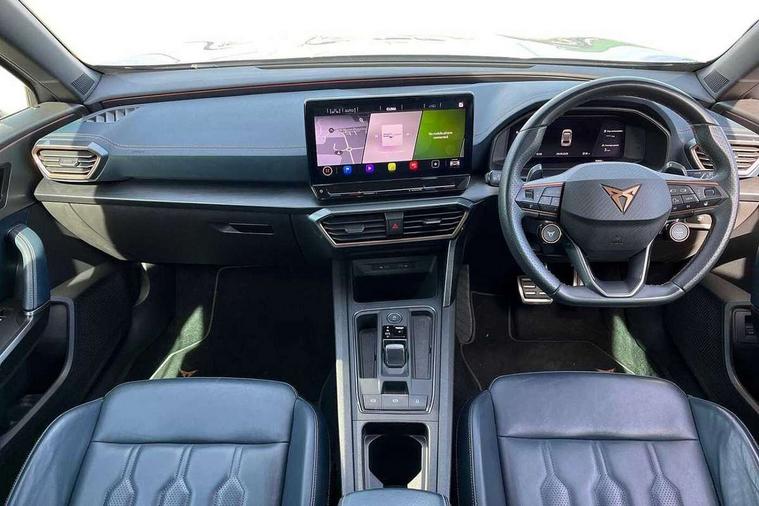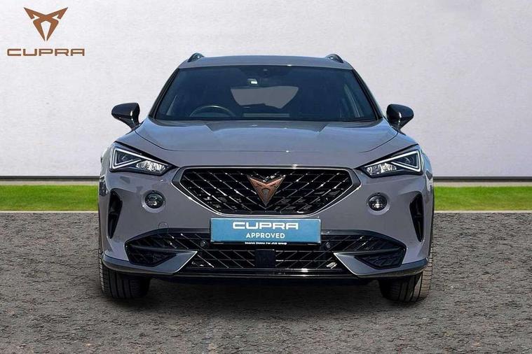 Digital cockpit and configurable dashboard, Driver alert system, Dynamic chassis control with driving profile selection (Comfort, Sport, CUPRA, Individual), E-call, Forward collision warning with automatic braking, Lane assist, Navigation system with 12'' Touchscreen Display, Park assist (inc front/rear parking sensors), Predictive adaptive cruise control with speed limiter, Rear view camera, RPM, trip computer, outside temp gauge, instrument light brightness, low fuel warning light, lights on reminder, gearshift indicator, Service interval indicator, Speed sensitive power steering, Start/stop system with regenerative braking, Virtual pedal and electric tailgate, Voice control system, Wireless apple carplay, Wireless phone charger, Electronic locking differential and dynamic traction support, Sports suspension with front shock absoption, 2 front and 2 rear USB type C sockets, Auxiliary input socket, DAB radio, Auto dimming rear view mirror, Body colour door handles, Body coloured bumpers, Dark grey wing mirror, Daytime running light with automatic headlight control and coming home feature, Dynamic headlight range control, Electric front/rear windows, Electrically adjustable heated and folding door mirrors with memory function, Front fog lamps with cornering function, Gloss black roof rails and window surrounds, LED Headlights, LED Taillights with dynamic indicator, Rain sensing wipers, Rear diffuser with twin exhaust pipe on each side, Rear side wing doors, Rear wash/wipe, Sports bumpers, Third brake light, Tinted rear windows, VZ logo rear badging, Welcome lights, 12v power supply in centre console, 12V socket, 12v socket in loadspace, 2 front and 2 rear reading lights, 230V socket, 3 seat bench in 2nd row, 60/40 split rear bench seat with armrest and mechanical seat release, Black headlining, Cupra sports pedals, Dust/pollen filter, Front and rear head restraints, Front centre armrest, Height/reach adjust steering wheel, Illuminated interior front door sills, Illuminated sunvisor with mirror, Isofix, Leather heated multi-function sports steering wheel with start stop, CUPRA mode button and gear shift paddles, Luggage tie-down hooks, Single front passenger seat, Three zone climate control with control panel in rear, Variable luggage/load compartment floor, Wraparound lighting, Genuine Nappa leather Pack - Cupra, Safety and driving pack (XL) - Formentor, 3 point seatbelts on all rear seats, ABS, Brake control system - ESC and brake booster, Child proof door locks, Driver and front passenger airbags with front passenger airbag de-activation, Electronic parking brake, Front and rear disc brakes, Front side curtain airbags, Hill hold control, Seat belt reminder for front and rear seats, Tyre pressure monitoring system, Anti theft alarm system, Keyless entry and start system (KESSY), Locking wheel bolts, Copper and aluminium interior detailing, 19" 'Exclusive' machined sport matte black and silver alloy wheels, Space saver spare wheel,