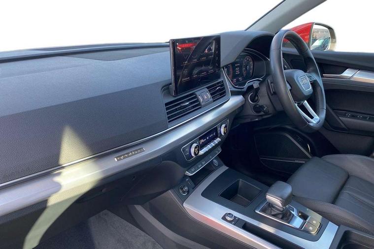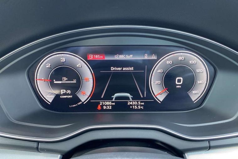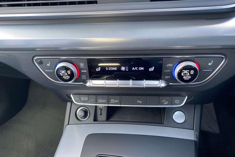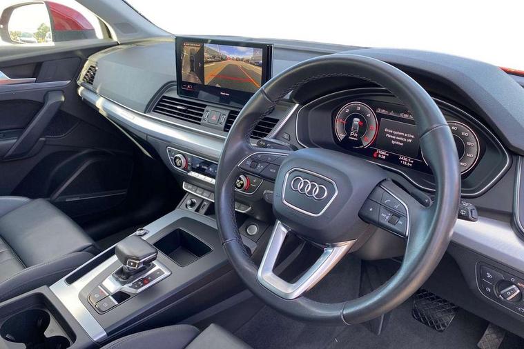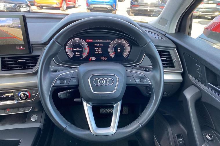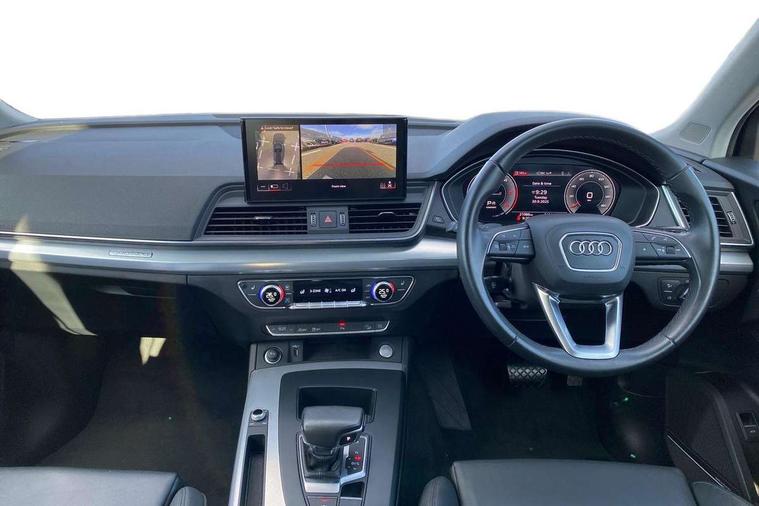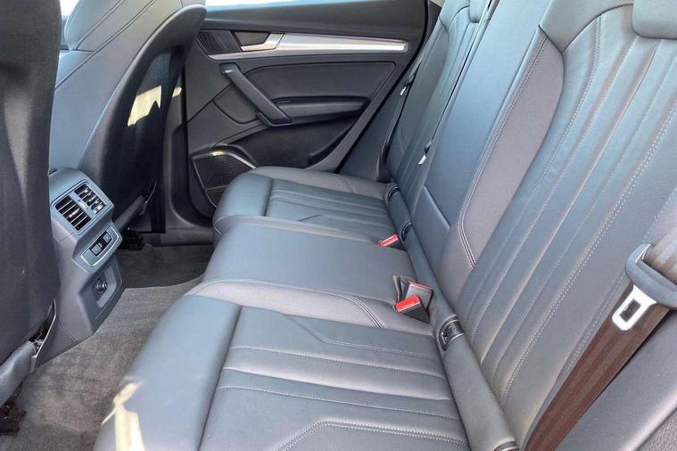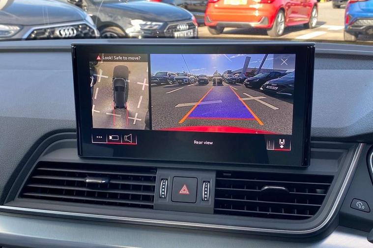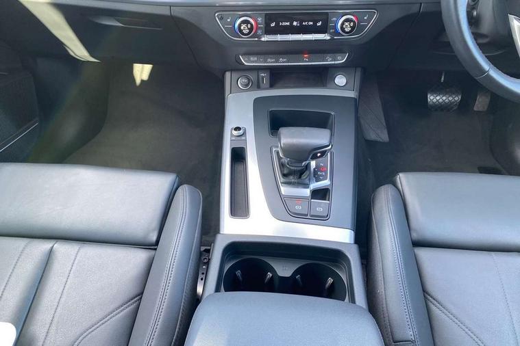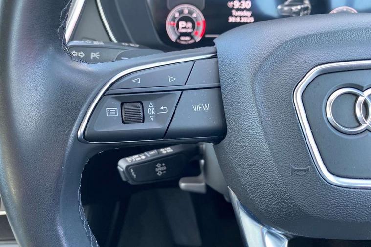 Audi connect safety and service (e-call), Audi connect with Amazon Alexa Integration, Audi drive select, Audi virtual cockpit plus with 12.3" screen and three different layout designs, Audi wireless smartphone interface, Automatic start-stop system with coasting functionality and efficiency programme, Bluetooth interface, Cruise control + speed limiter, Electro - mechanical power assisted steering, MMI navigation plus with 10.1" touch screen, Power tailgate, Reversing camera, Service interval indicator, Voice control system with Audi hotword activation "Hey Audi", Diesel particulate filter, Dynamic suspension, Quattro on demand, 2 x USB charging port with aux input socket, DAB Digital radio, Acoustic windscreen, Air inlets in matt titanium black with blades in matt aluminium silver, Aluminium roof rails, Auto dimming door mirrors, Auto dimming rear view mirror, Automatic headlight adjustment, Automatic headlights and windscreen wipers, Body colour bumpers, Body colour door mirrors, Chrome plated exhaust trims, Daytime running lights, Door sills in Selenite silver, Electric adjustable/heated/folding door mirrors, Front and rear electric windows, High level LED brake light, LED headlights and LED tail lights, Lower bumpers painted in contrast Manhattan grey, Matt selenite silver underbody protection, Matt twilight grey radiator grille with chrome vertical struts, Rear chrome trim strip below lights, Rear diffuser strip in selenite silver, Rear side wing doors, Rear spoiler, Rear wiper, Roof bars, 3 rear headrests, 3 spoke multifunction leather steering wheel with shift paddles, 40:20:40 split folding 3 rear bench seat in 2nd row with rear centre armrest, Comfort front centre armrest, Deluxe 3 zone electronic climate control, Door sills trims with aluminium inlays, Front/rear floor mats, Heated front seats, Height adjustable front head restraints, Height/reach adjustable steering column, ISOFIX child seat mounting and top tether, Luggage compartment cover, Manual seat adjustment with 4-way electric lumbar support, Removable luggage compartment floor, Silver cloth headlining, Single front passenger seat, Sunvisors with vanity mirrors, Twin leather upholstery + front sports seats, High gloss pack - Q5, LED interior light pack - Q5, 3 point seatbelts on all seats, 6 airbags - Driver, front passenger, curtain and side airbags, Electrically operated child locks on rear doors, Electromechanical parking brake, Electronic stabilisation control including ABS, ASR and EDL, Front passenger airbag deactivation, Hill descent control, Hill hold assist, Multi collision brake assist, Pop-up bonnet for pedestrian protection, Pre sense city, Seat belt force limiter, Seatbelt monitoring, Tyre pressure warning, Warning triangle and first aid kit, Anti theft alarm, Anti-theft wheel bolts, Keyless Go access/ignition system, Remote central locking, Aluminium rhombus inlay,