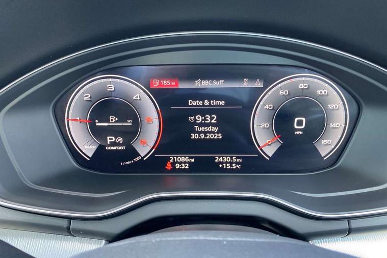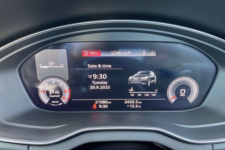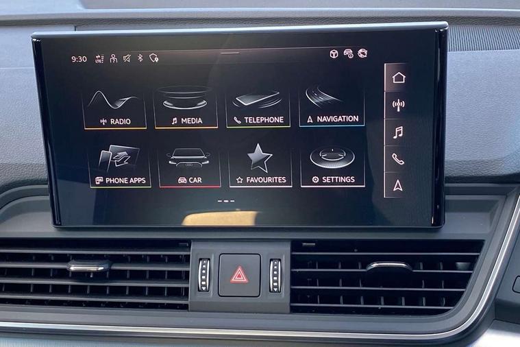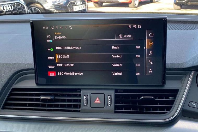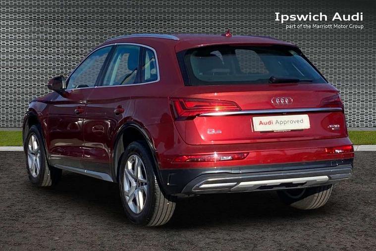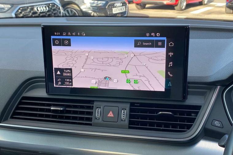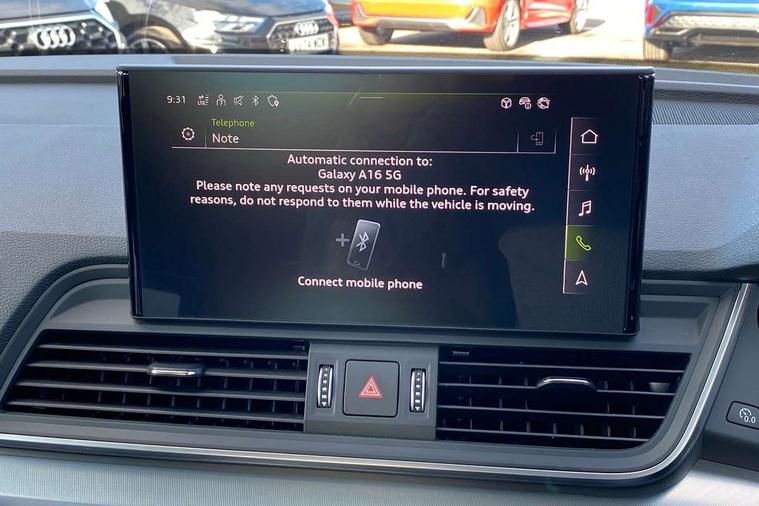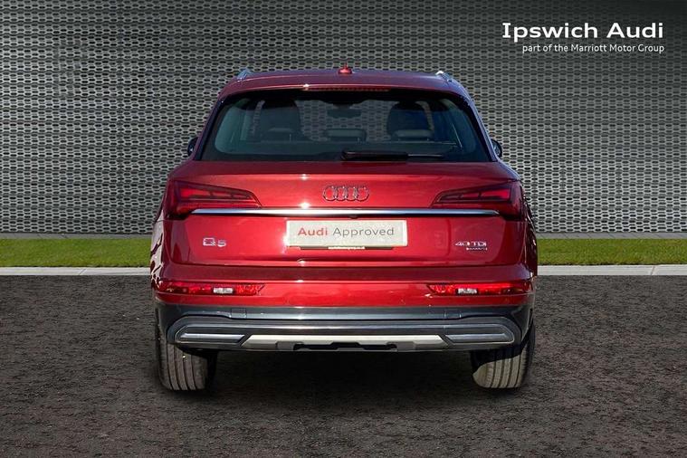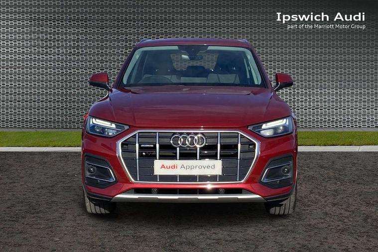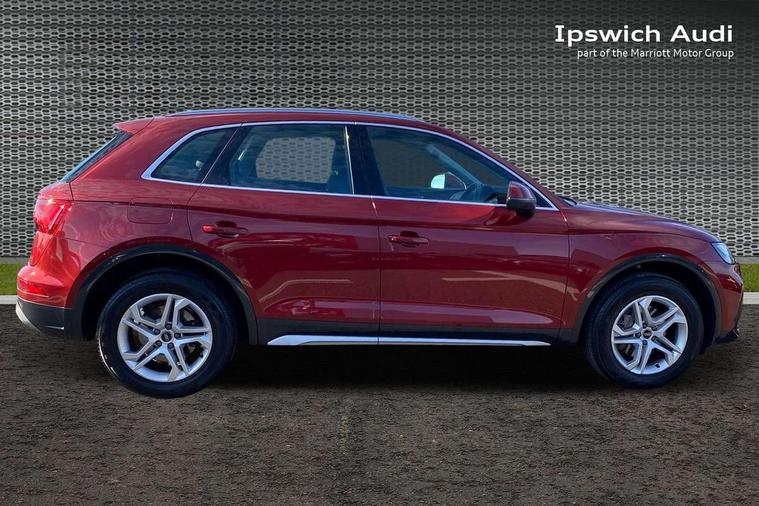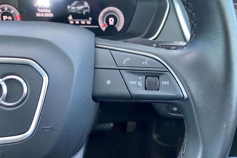 Audi connect safety and service (e-call), Audi connect with Amazon Alexa Integration, Audi drive select, Audi virtual cockpit plus with 12.3" screen and three different layout designs, Audi wireless smartphone interface, Automatic start-stop system with coasting functionality and efficiency programme, Bluetooth interface, Cruise control + speed limiter, Electro - mechanical power assisted steering, MMI navigation plus with 10.1" touch screen, Power tailgate, Reversing camera, Service interval indicator, Voice control system with Audi hotword activation "Hey Audi", Diesel particulate filter, Dynamic suspension, Quattro on demand, 2 x USB charging port with aux input socket, DAB Digital radio, Acoustic windscreen, Air inlets in matt titanium black with blades in matt aluminium silver, Aluminium roof rails, Auto dimming door mirrors, Auto dimming rear view mirror, Automatic headlight adjustment, Automatic headlights and windscreen wipers, Body colour bumpers, Body colour door mirrors, Chrome plated exhaust trims, Daytime running lights, Door sills in Selenite silver, Electric adjustable/heated/folding door mirrors, Front and rear electric windows, High level LED brake light, LED headlights and LED tail lights, Lower bumpers painted in contrast Manhattan grey, Matt selenite silver underbody protection, Matt twilight grey radiator grille with chrome vertical struts, Rear chrome trim strip below lights, Rear diffuser strip in selenite silver, Rear side wing doors, Rear spoiler, Rear wiper, Roof bars, 3 rear headrests, 3 spoke multifunction leather steering wheel with shift paddles, 40:20:40 split folding 3 rear bench seat in 2nd row with rear centre armrest, Comfort front centre armrest, Deluxe 3 zone electronic climate control, Door sills trims with aluminium inlays, Front/rear floor mats, Heated front seats, Height adjustable front head restraints, Height/reach adjustable steering column, ISOFIX child seat mounting and top tether, Luggage compartment cover, Manual seat adjustment with 4-way electric lumbar support, Removable luggage compartment floor, Silver cloth headlining, Single front passenger seat, Sunvisors with vanity mirrors, Twin leather upholstery + front sports seats, High gloss pack - Q5, LED interior light pack - Q5, 3 point seatbelts on all seats, 6 airbags - Driver, front passenger, curtain and side airbags, Electrically operated child locks on rear doors, Electromechanical parking brake, Electronic stabilisation control including ABS, ASR and EDL, Front passenger airbag deactivation, Hill descent control, Hill hold assist, Multi collision brake assist, Pop-up bonnet for pedestrian protection, Pre sense city, Seat belt force limiter, Seatbelt monitoring, Tyre pressure warning, Warning triangle and first aid kit, Anti theft alarm, Anti-theft wheel bolts, Keyless Go access/ignition system, Remote central locking, Aluminium rhombus inlay,